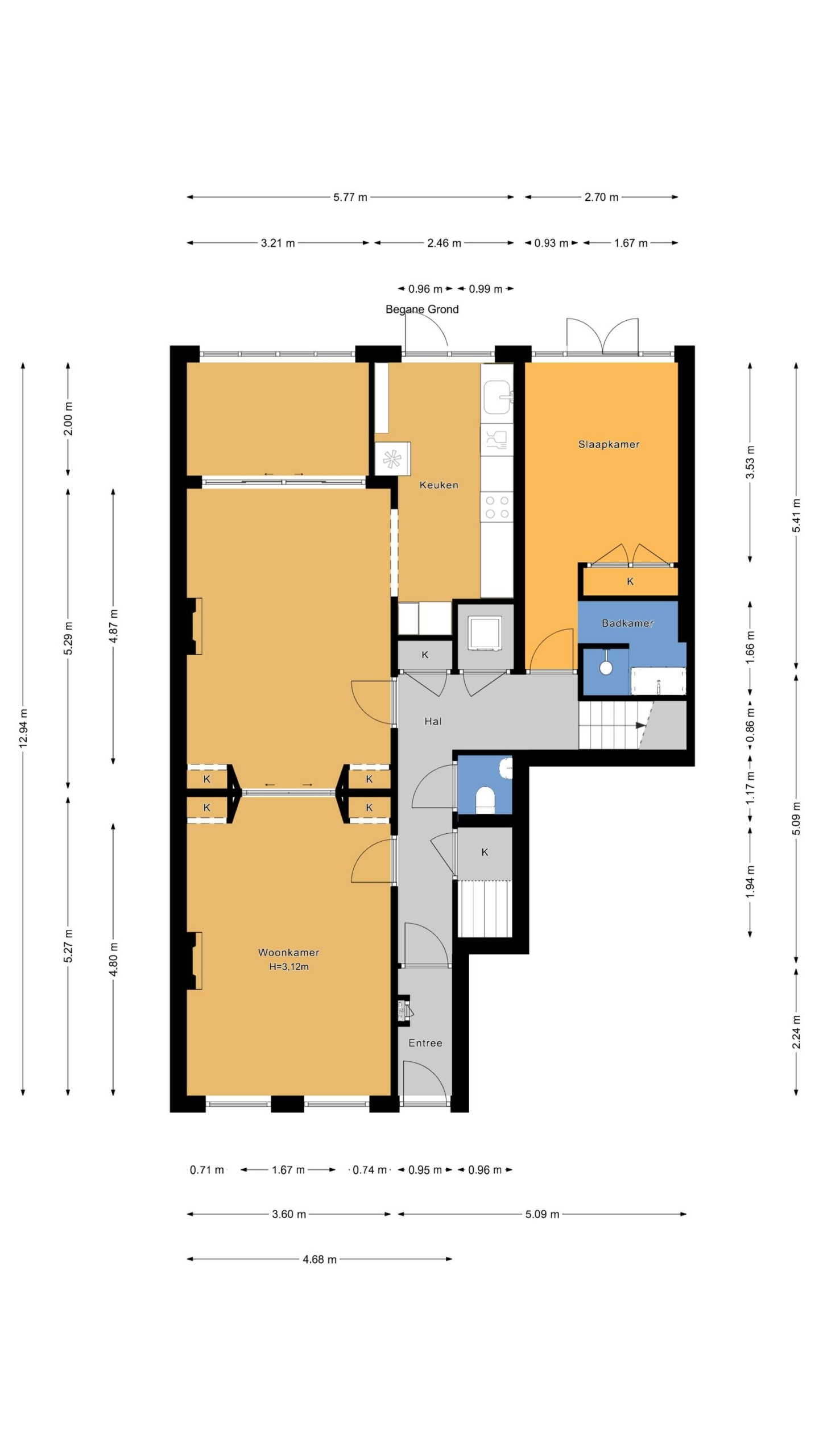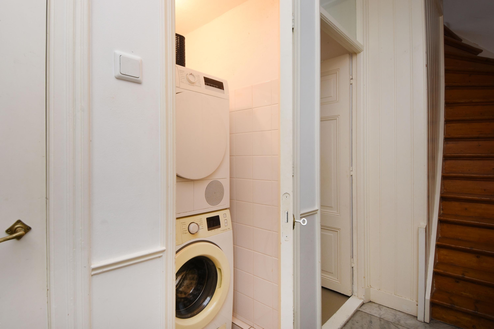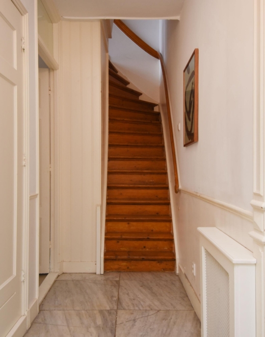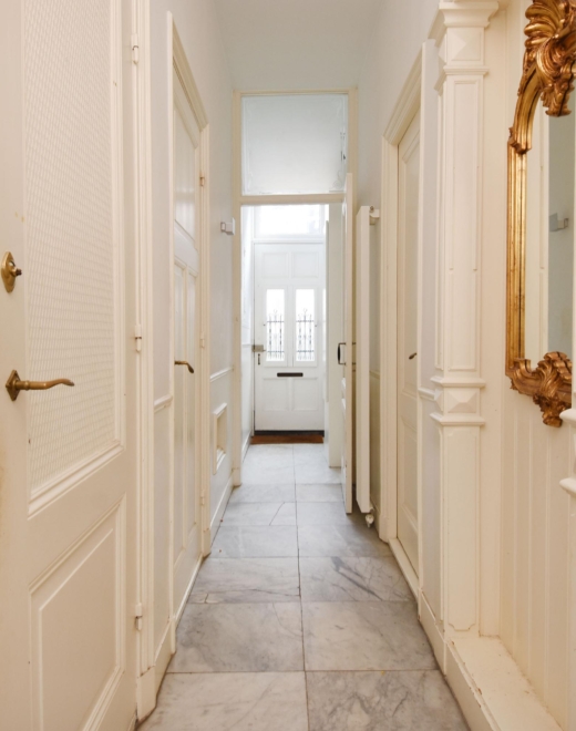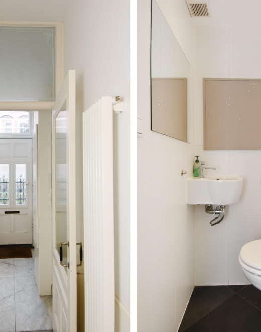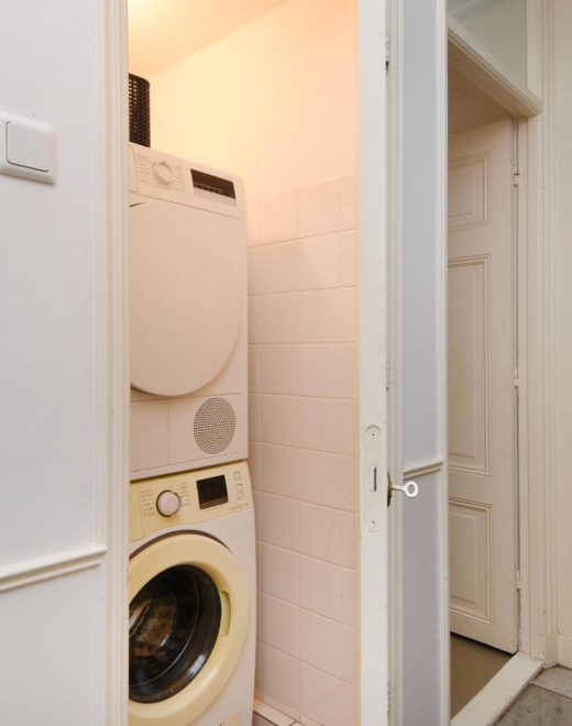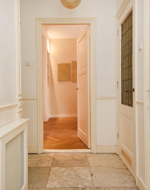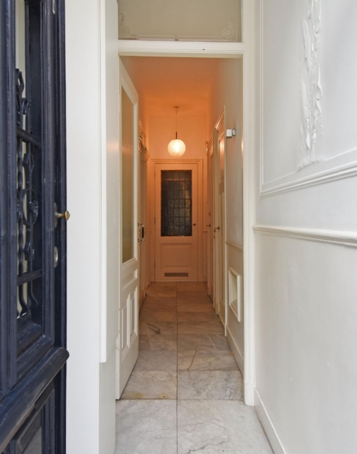 from street level, you enter the characteristic vestibule with original front door. the hallway features marble floor tiles and a designer radiator, and provides access to the meter cupboard, a practical understairs storage space, coat closet, utility cupboard with washer/dryer setup, and a modern toilet with washbasin.