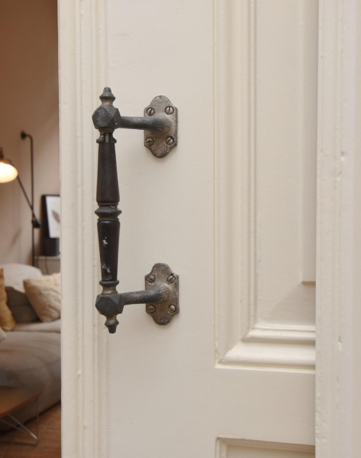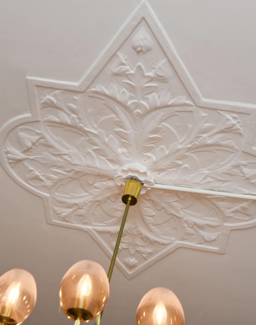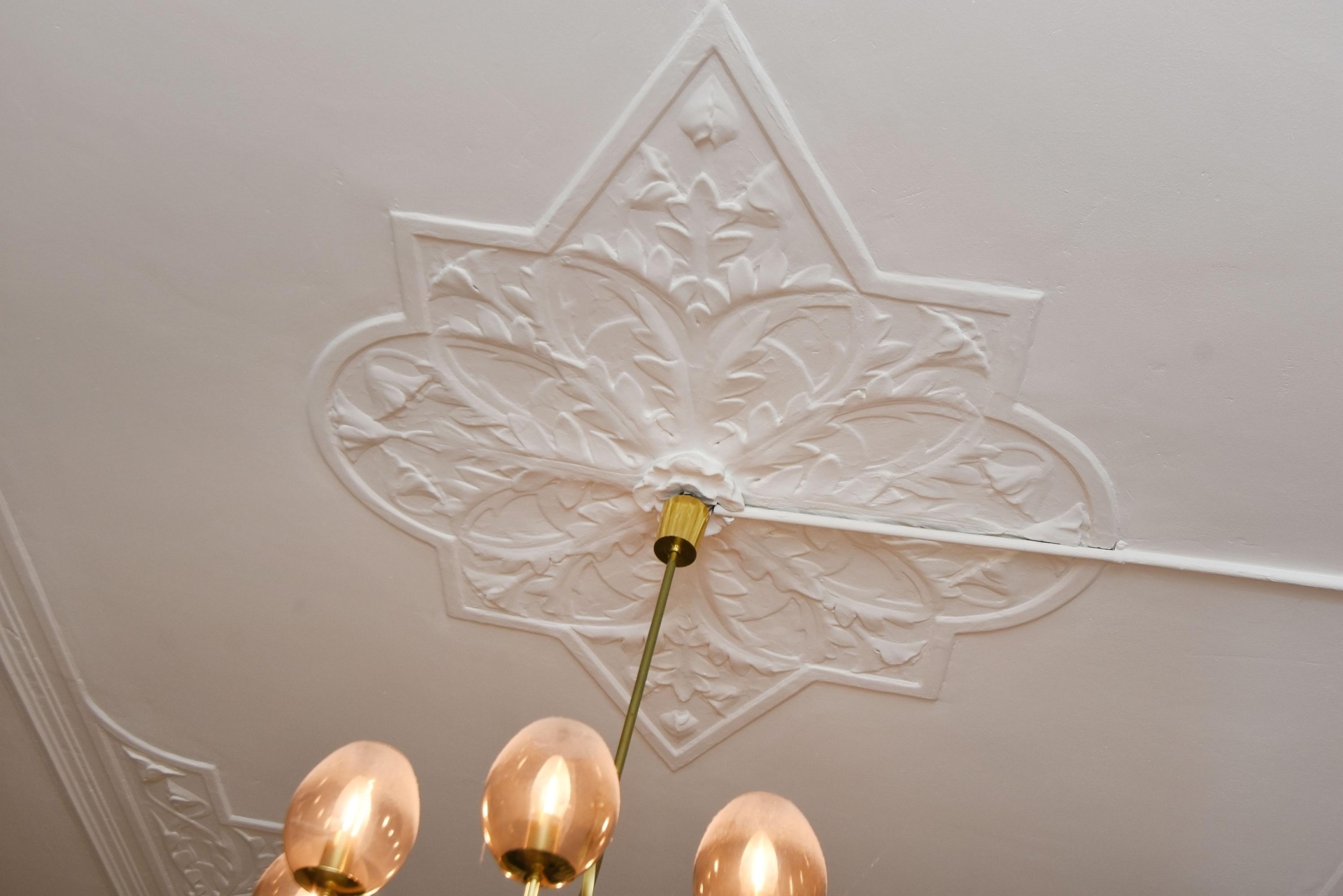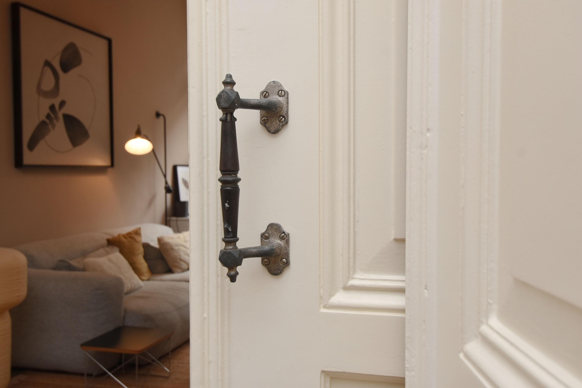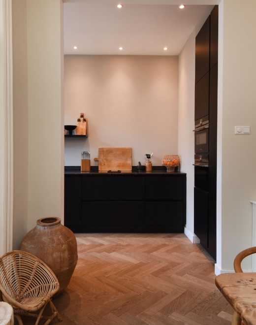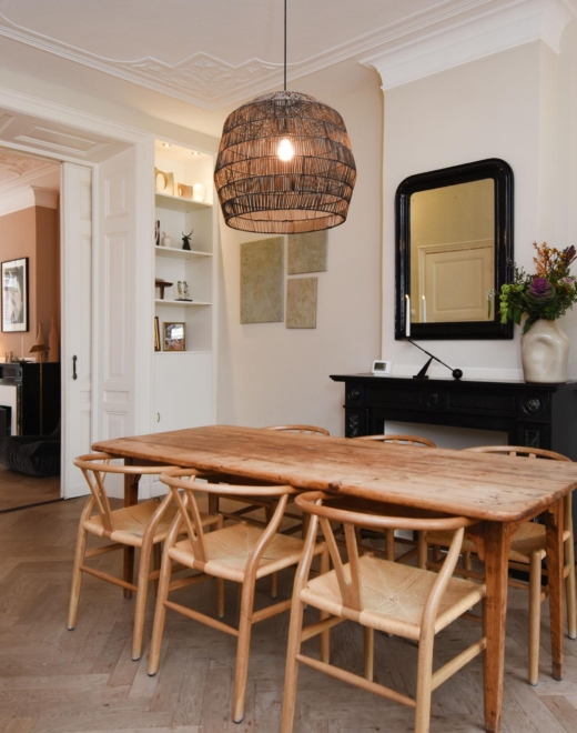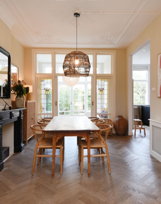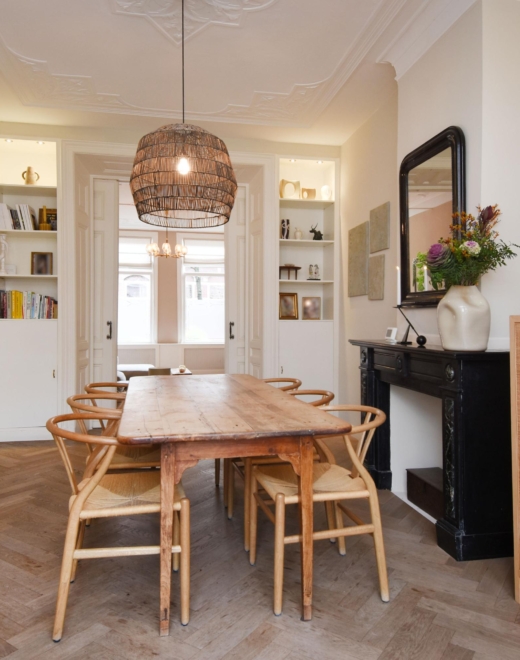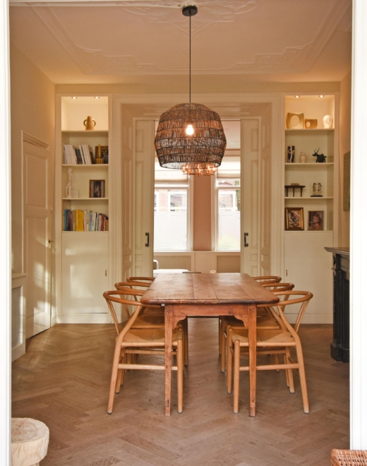 the charming living and dining room en suite boasts original sliding doors with wooden panels, built-in cupboards, ornamental ceilings and an original fireplace. at the front is a cosy hearth, while the herringbone parquet flooring completes the classic look.
