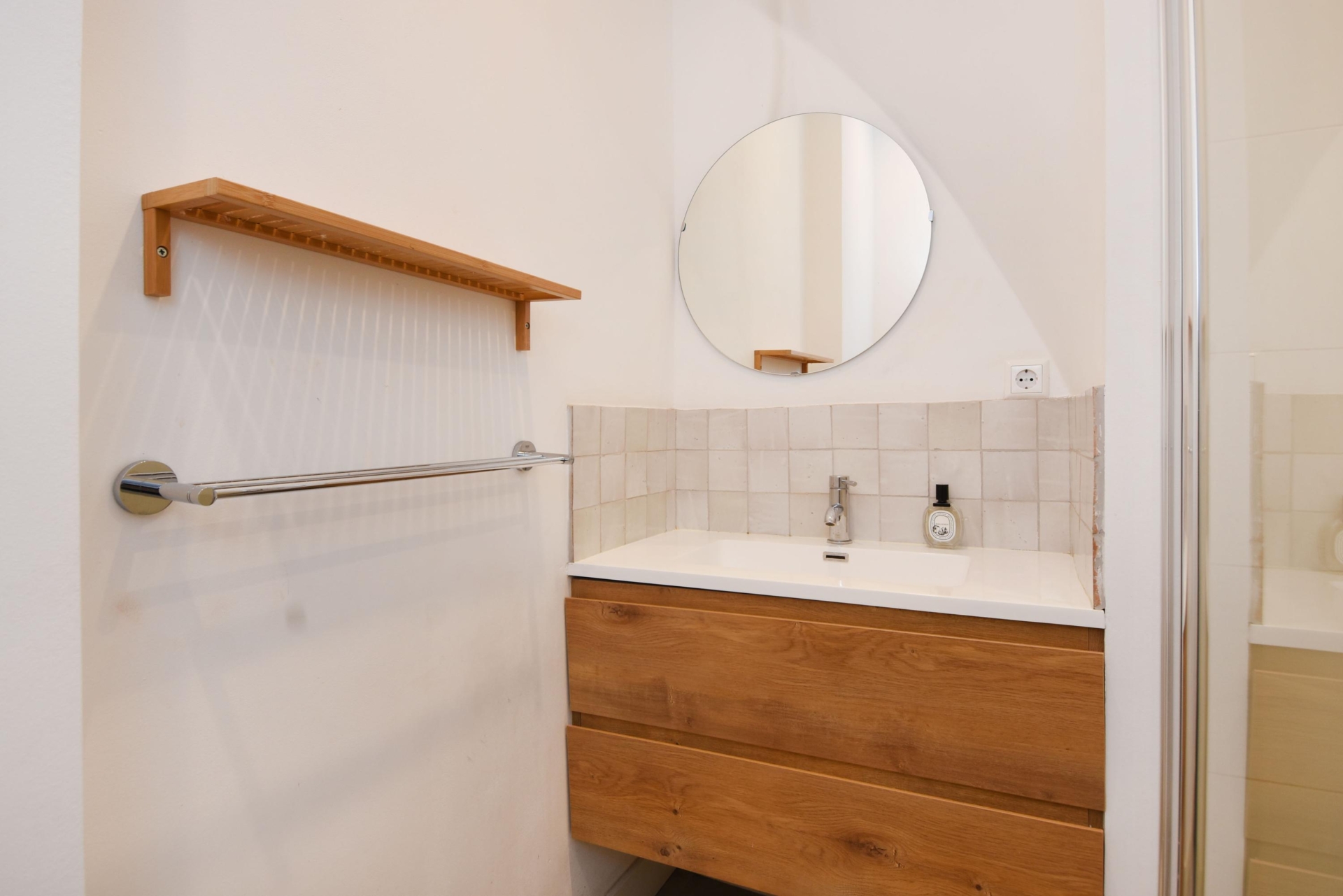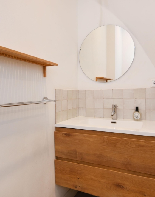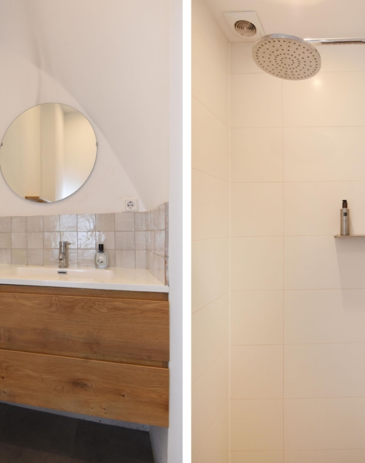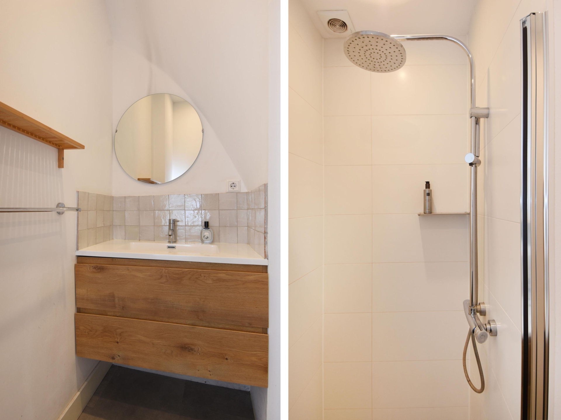 the ground-floor bathroom, also renewed in 2019, is fully tiled and fitted with a walk-in shower, washbasin cabinet and mechanical ventilation.