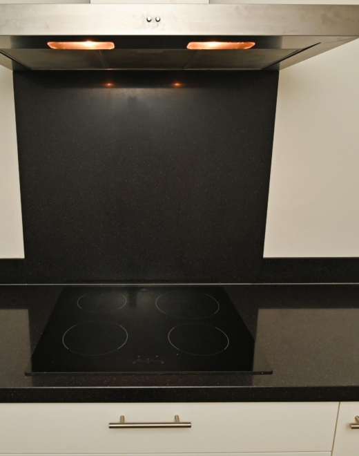 the welcoming hallway opens up to a bright and airy living/dining room. the modern semi-open kitchen features a granite countertop and built-in appliances, including a dishwasher, fridge with freezer, oven, induction cooktop, and stainless steel extractor hood.