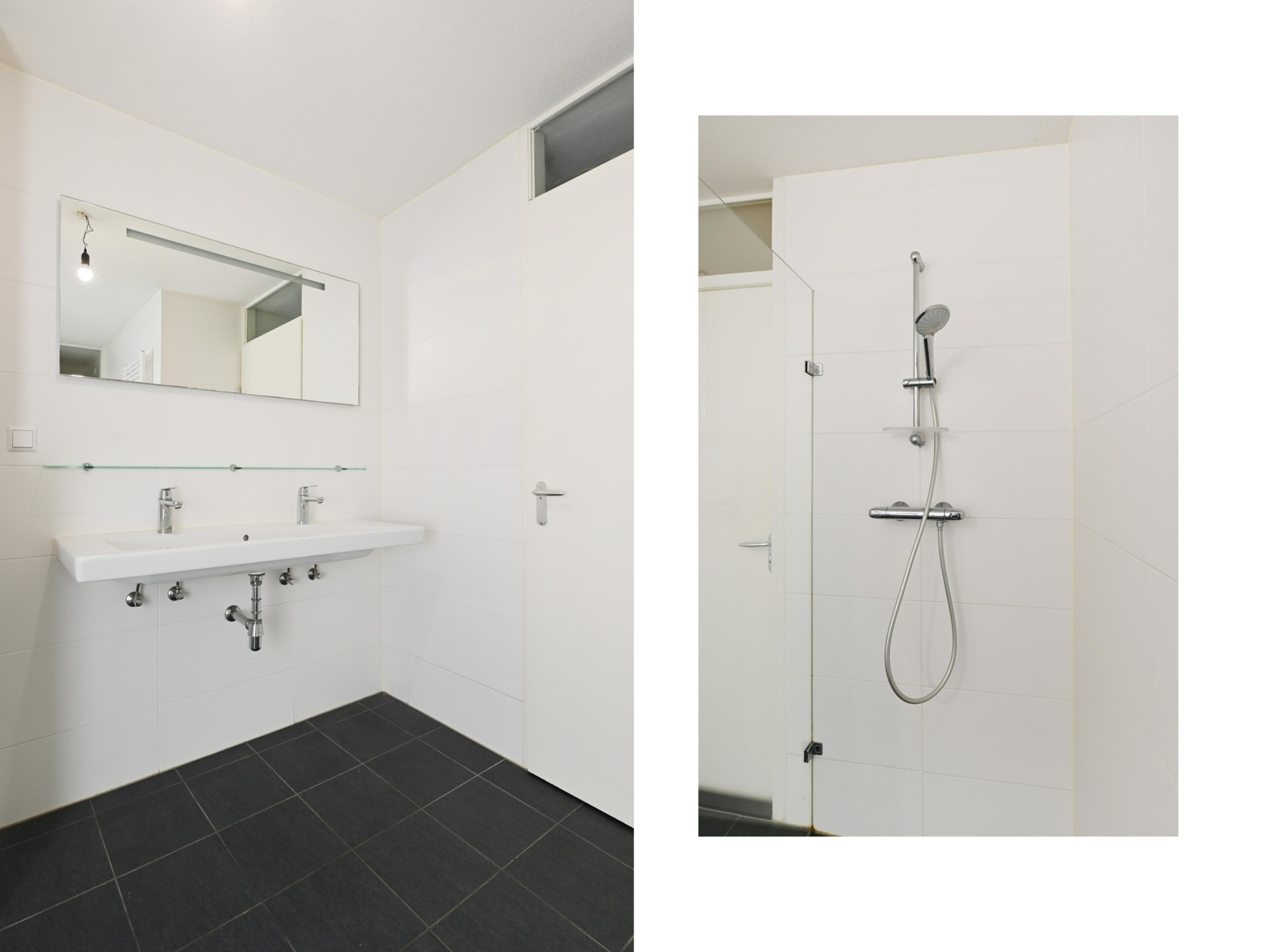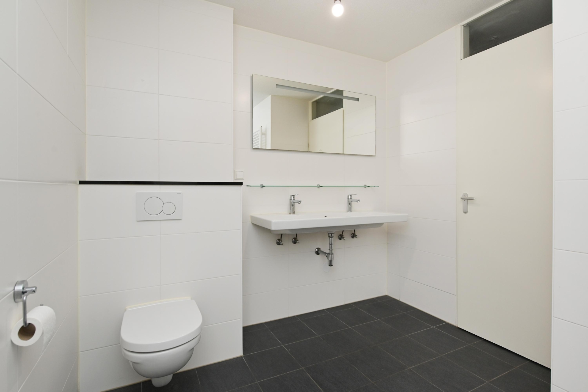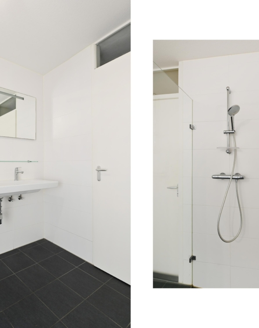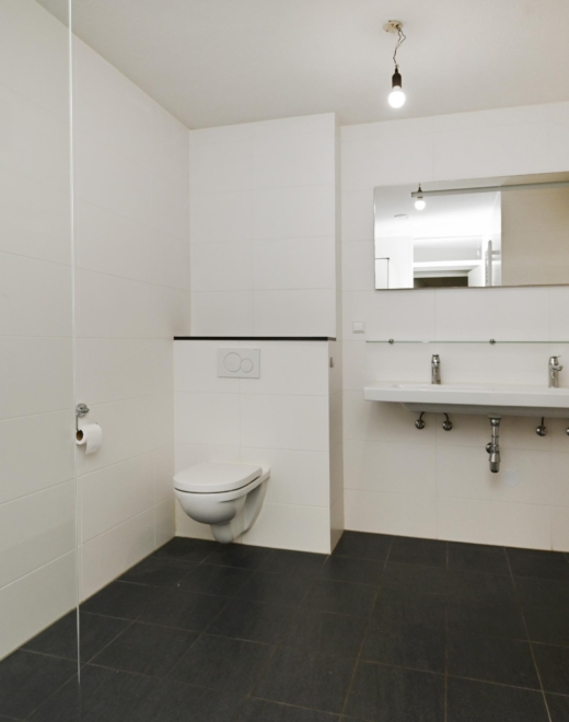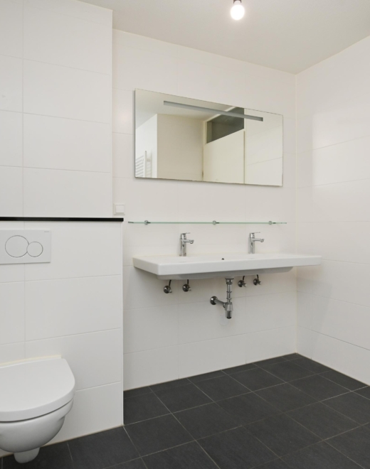 the modern bathroom offers a shower cabin, wall-mounted toilet, double washbasin, and towel radiator. from the bathroom, you access a utility area with washing machine and dryer connections, the central heating boiler, and the mechanical ventilation unit.