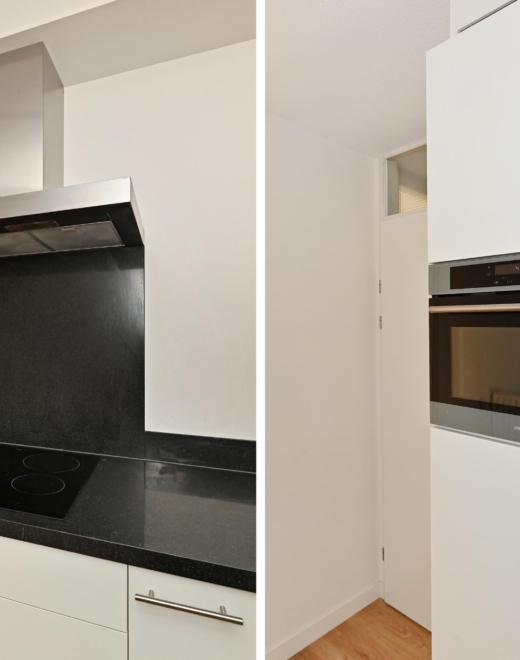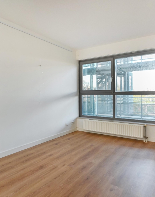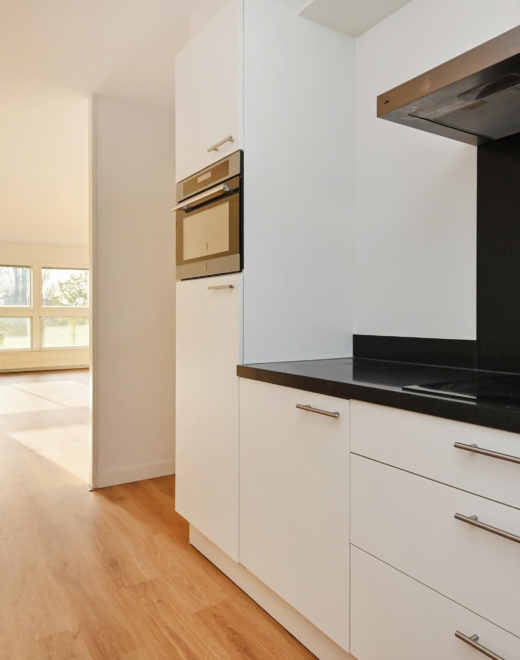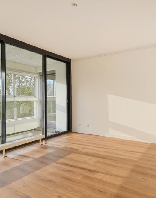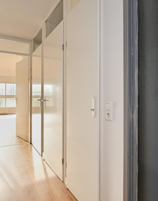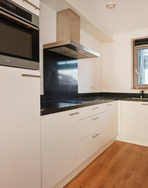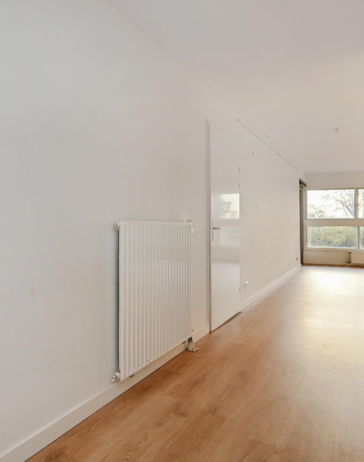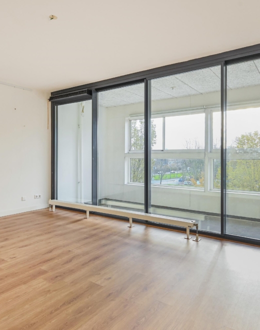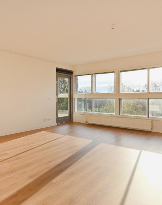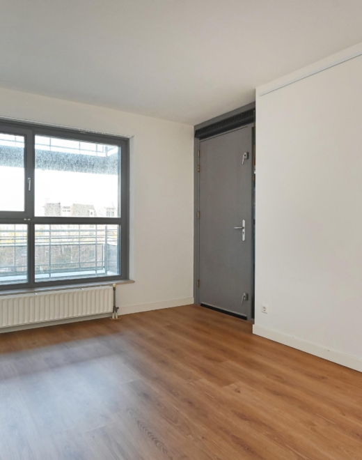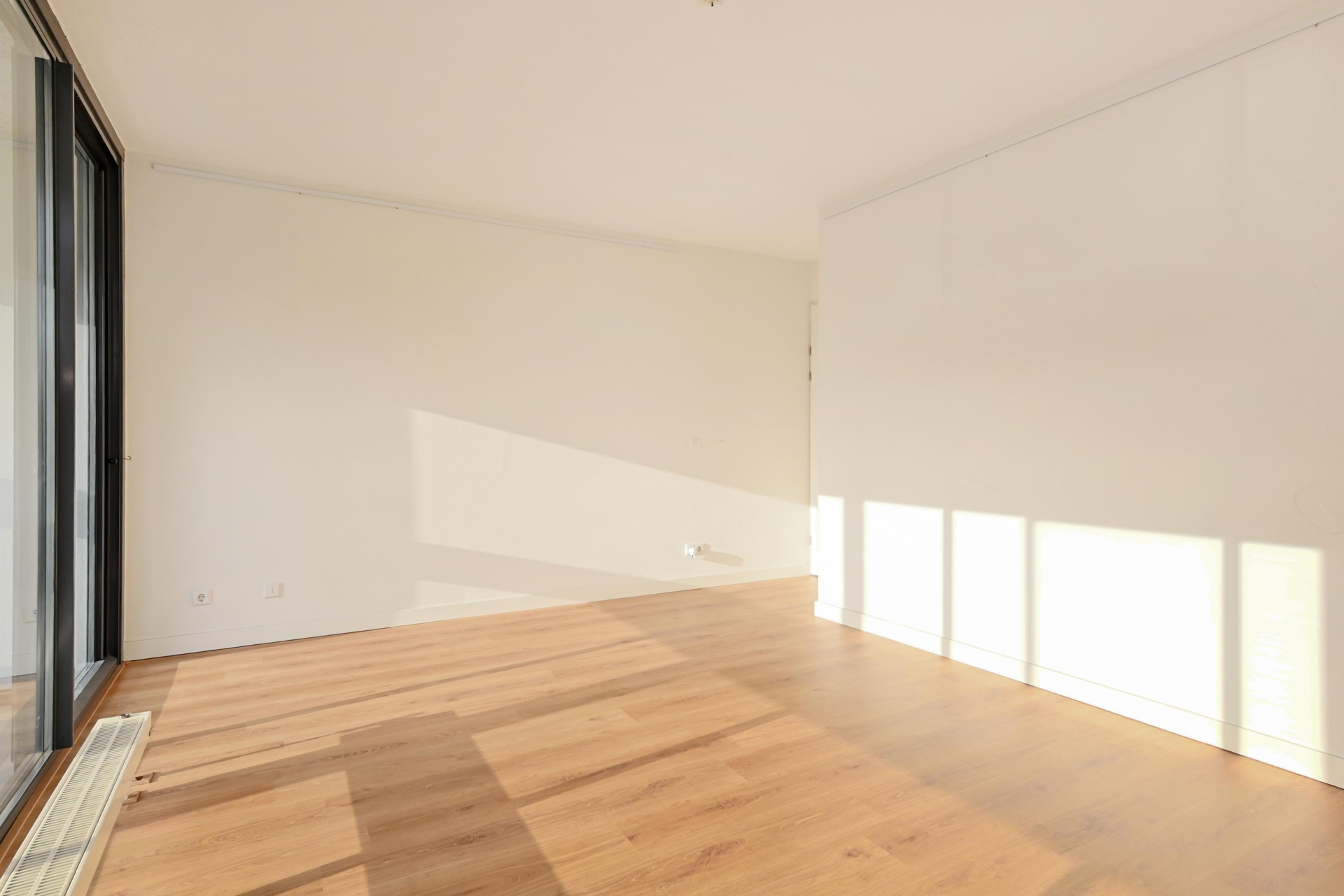 the living room features an unobstructed and truly unique panoramic view over the hague’s skyline. the laminate flooring extends throughout the entire apartment, creating a seamless flow without thresholds. from the living room, you have access to the loggia.