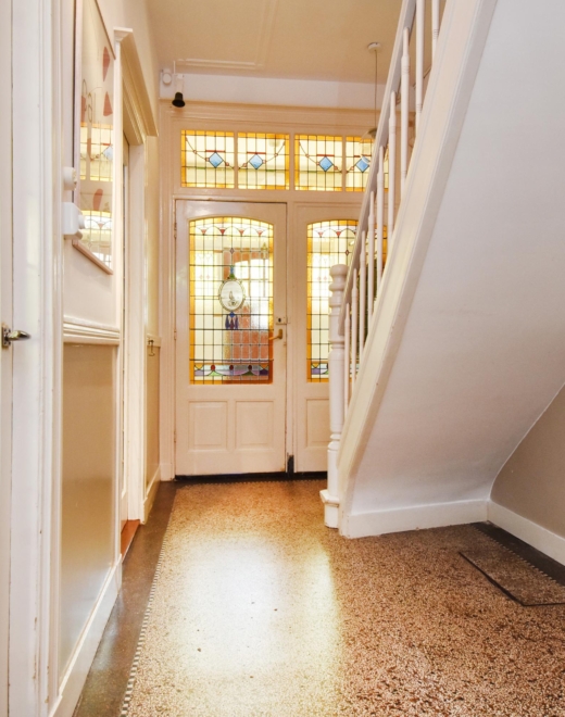 you’re then welcomed into the atmospheric living room, featuring a bay window, stained glass details, original sliding doors with built-in cupboards, and a warm wooden floor.