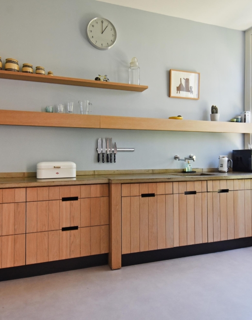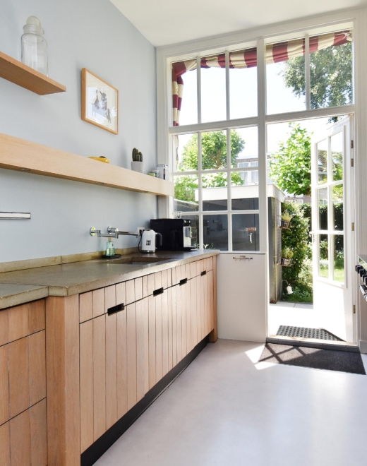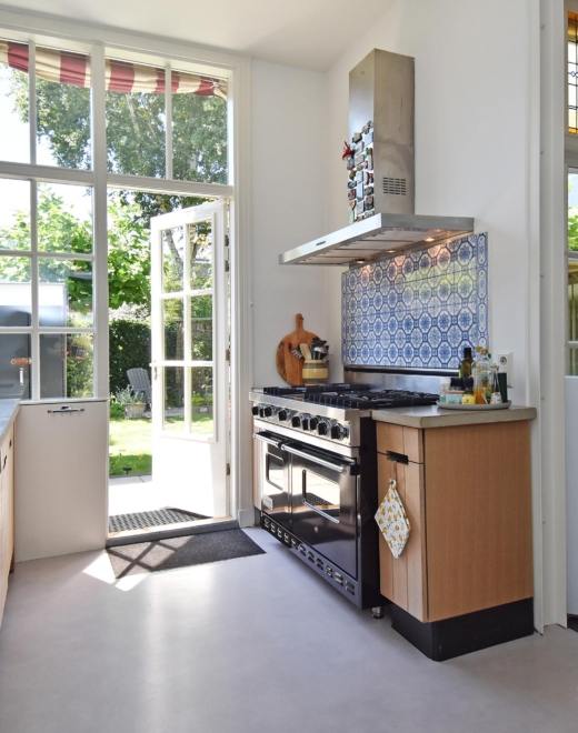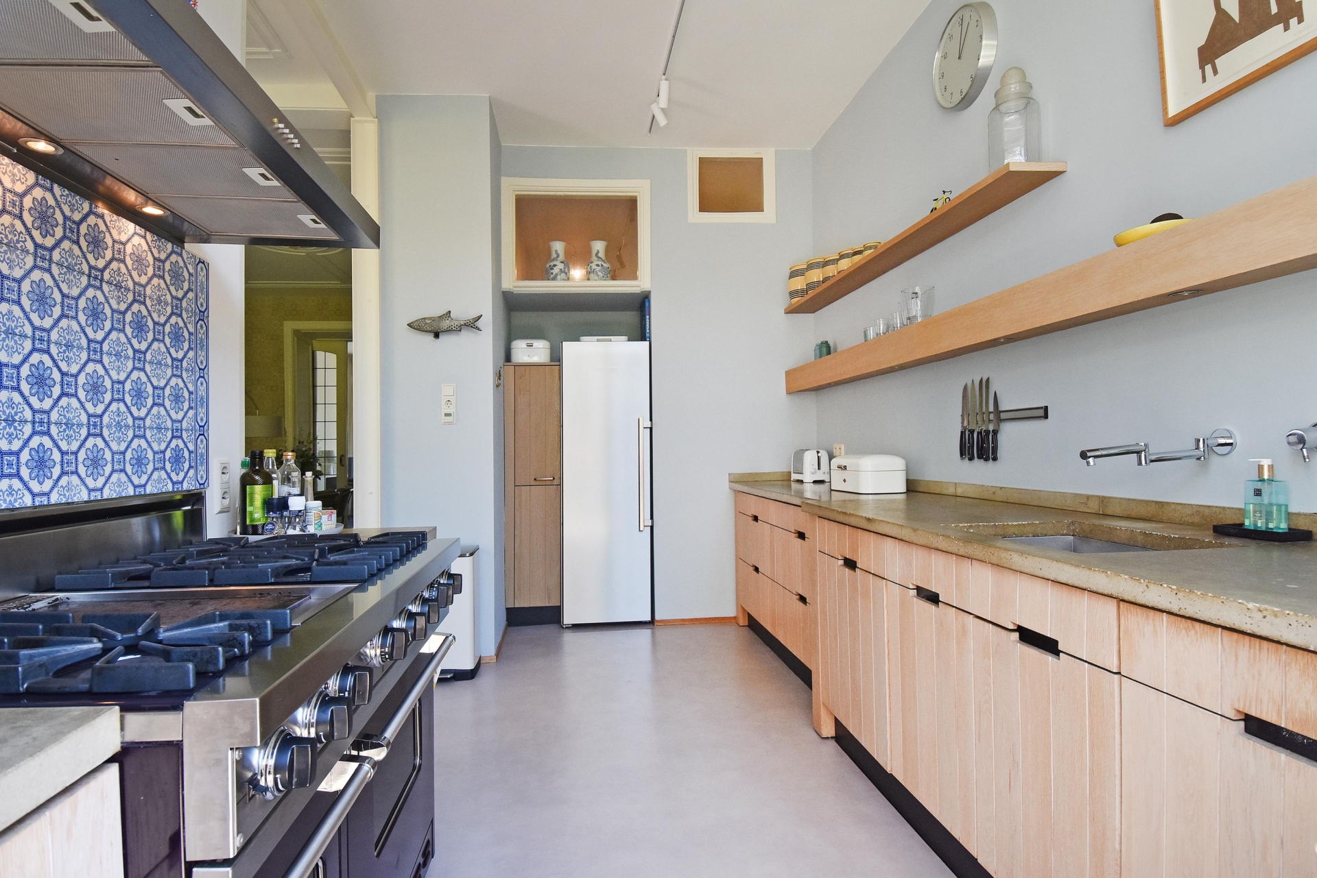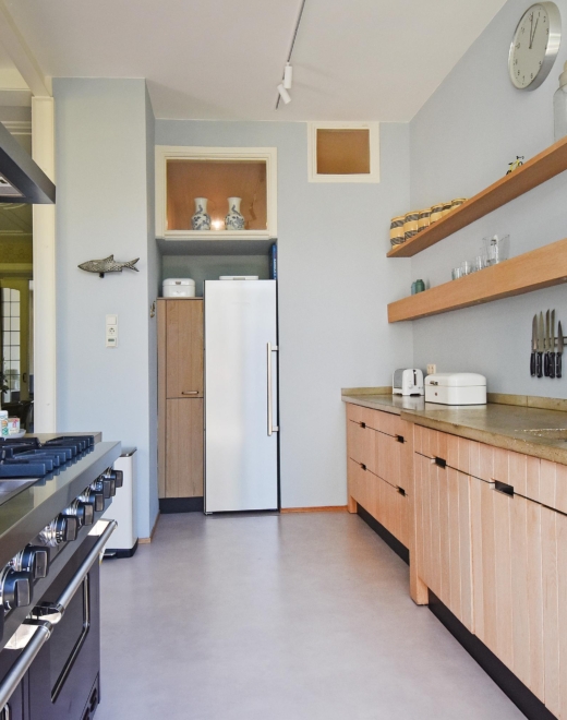 the semi-open kitchen is a real eye-catcher: solid oak cabinetry, a robust concrete countertop, and an impressive viking range with double oven. naturally, it’s equipped with a dishwasher, refrigerator, extractor hood and close-in boiler.