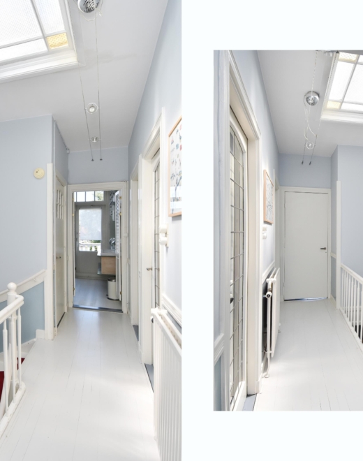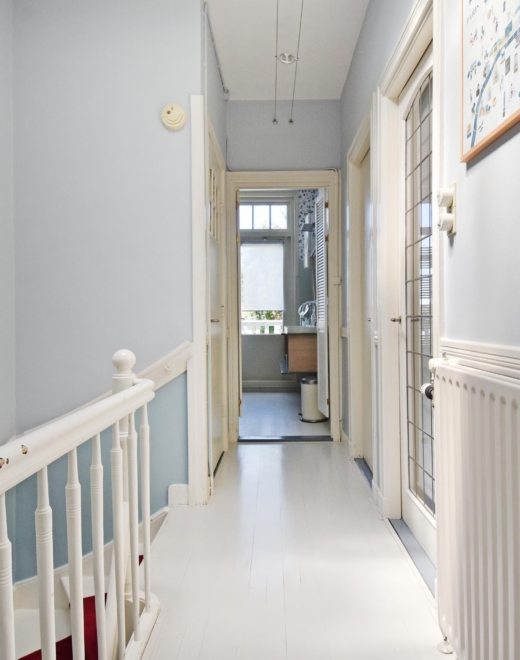 the spacious primary bedroom includes built-in wardrobes and direct access to the modern bathroom, which features underfloor heating, a large walk-in shower and a stylish vanity unit. from here, you step right onto the sunny balcony. at the front, you’ll find another charming bedroom with bay window and stained glass, as well as a cosy study or child’s room. the landing offers a separate toilet and a laundry area.