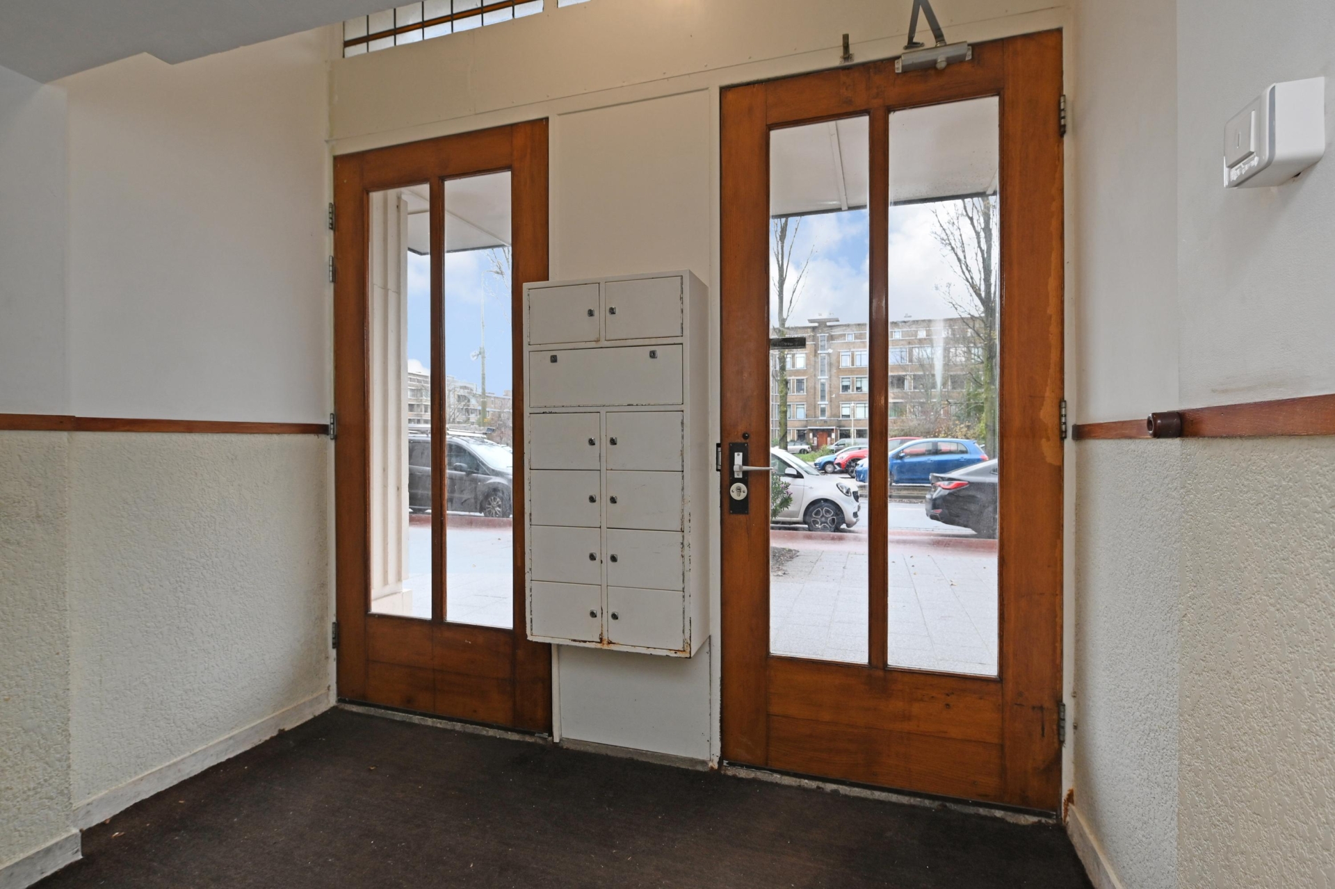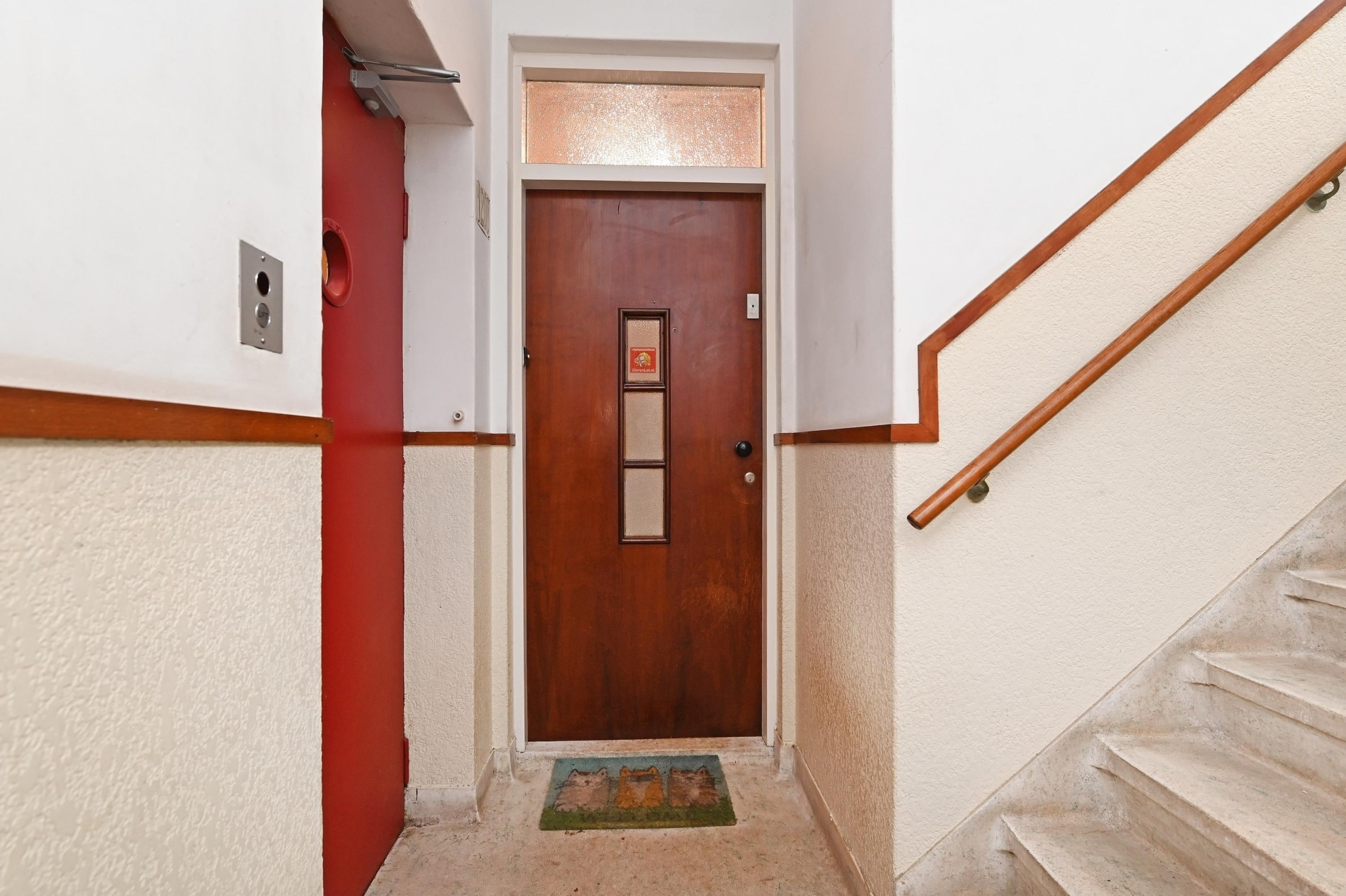 through the secured communal entrance, you enter the neat hallway of the building.