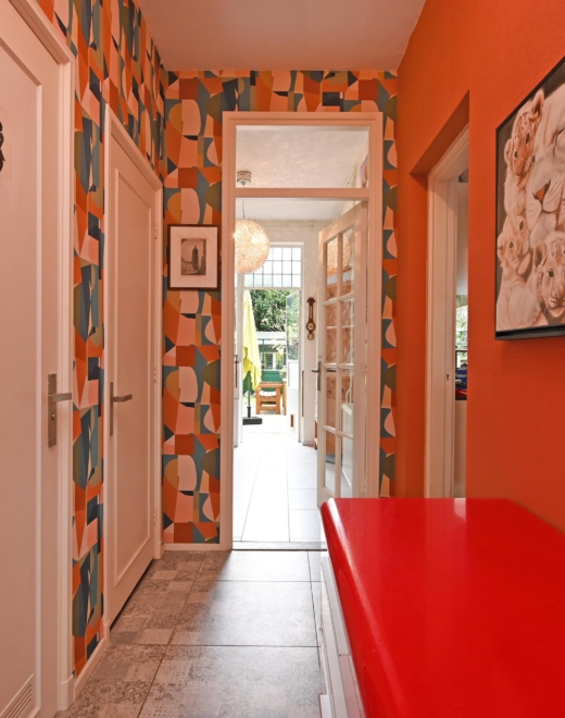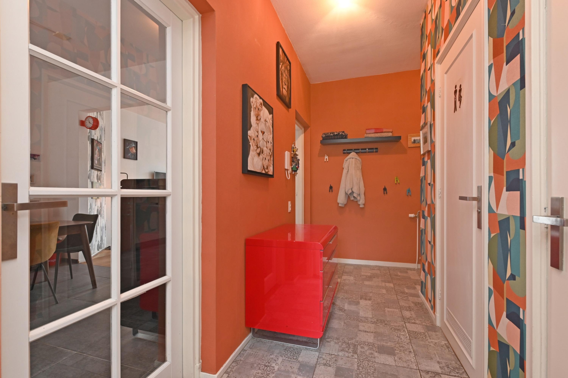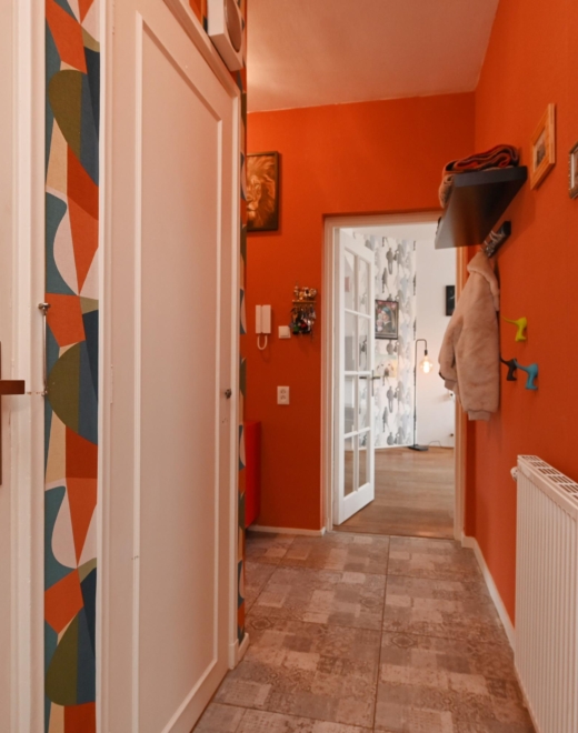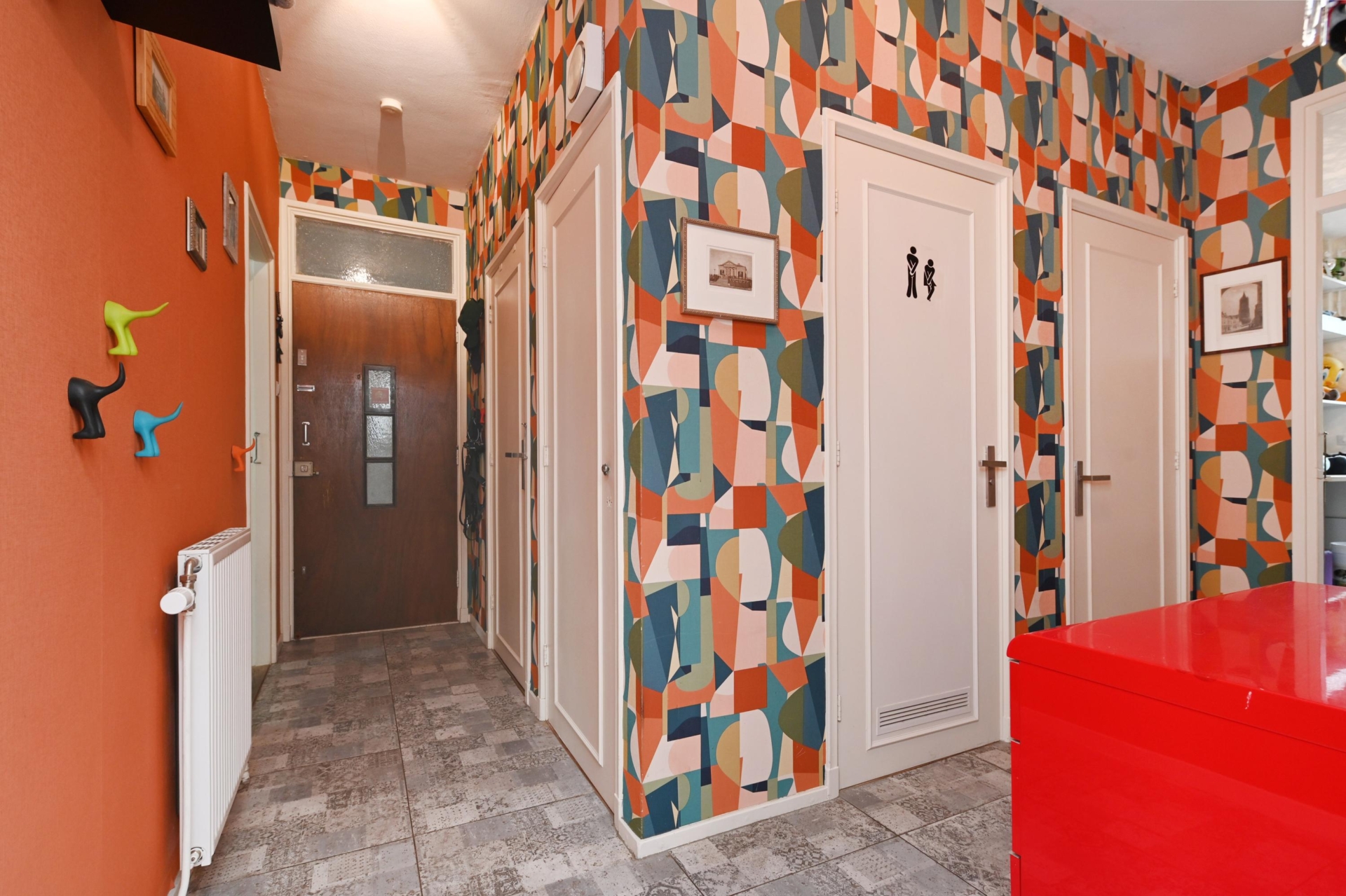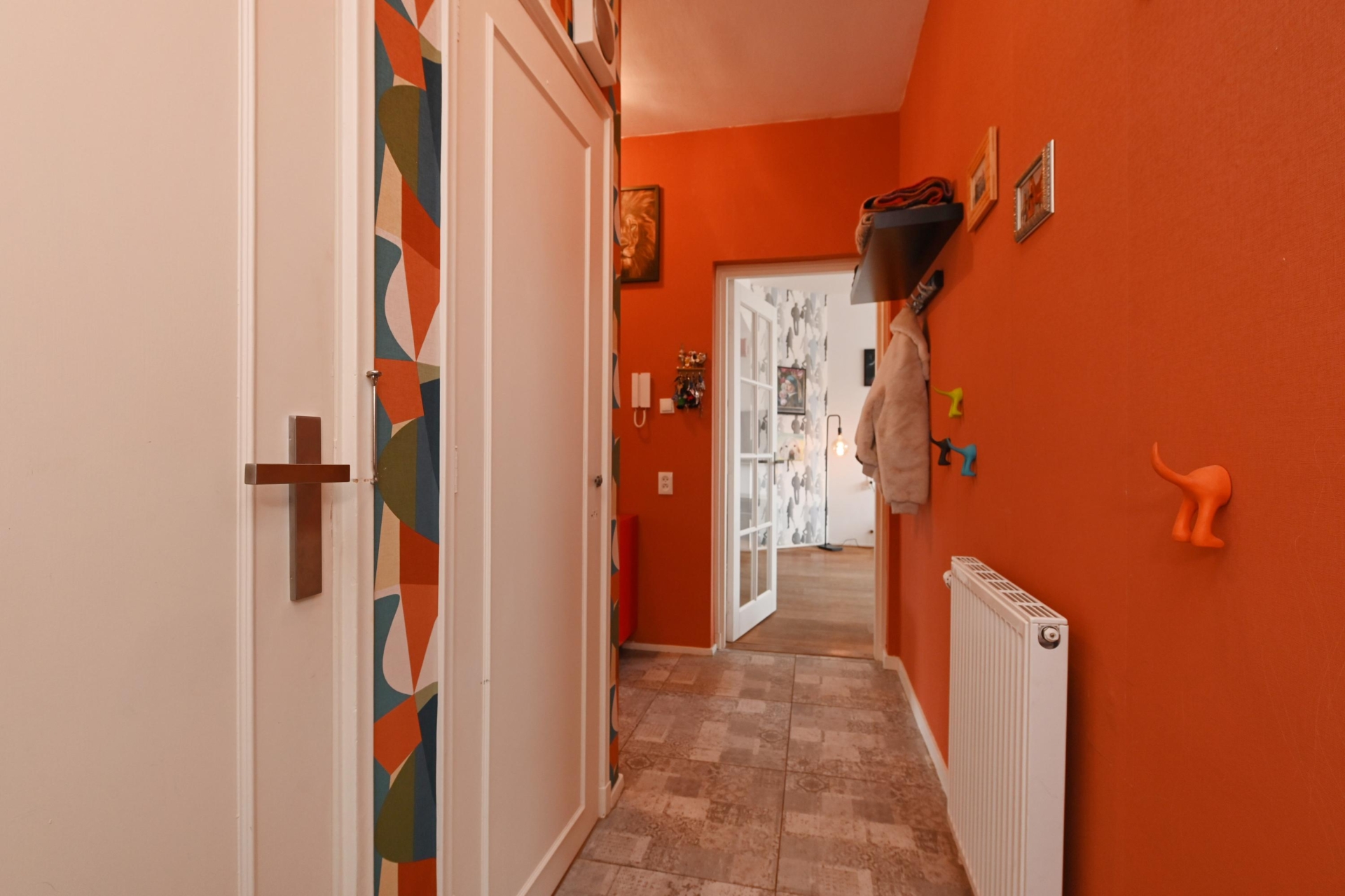 you step into a hallway with modern tiling (2021), built-in storage space and access to almost all rooms.