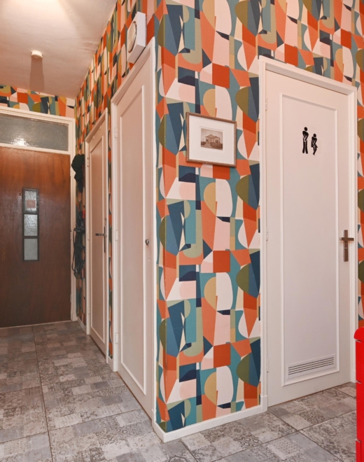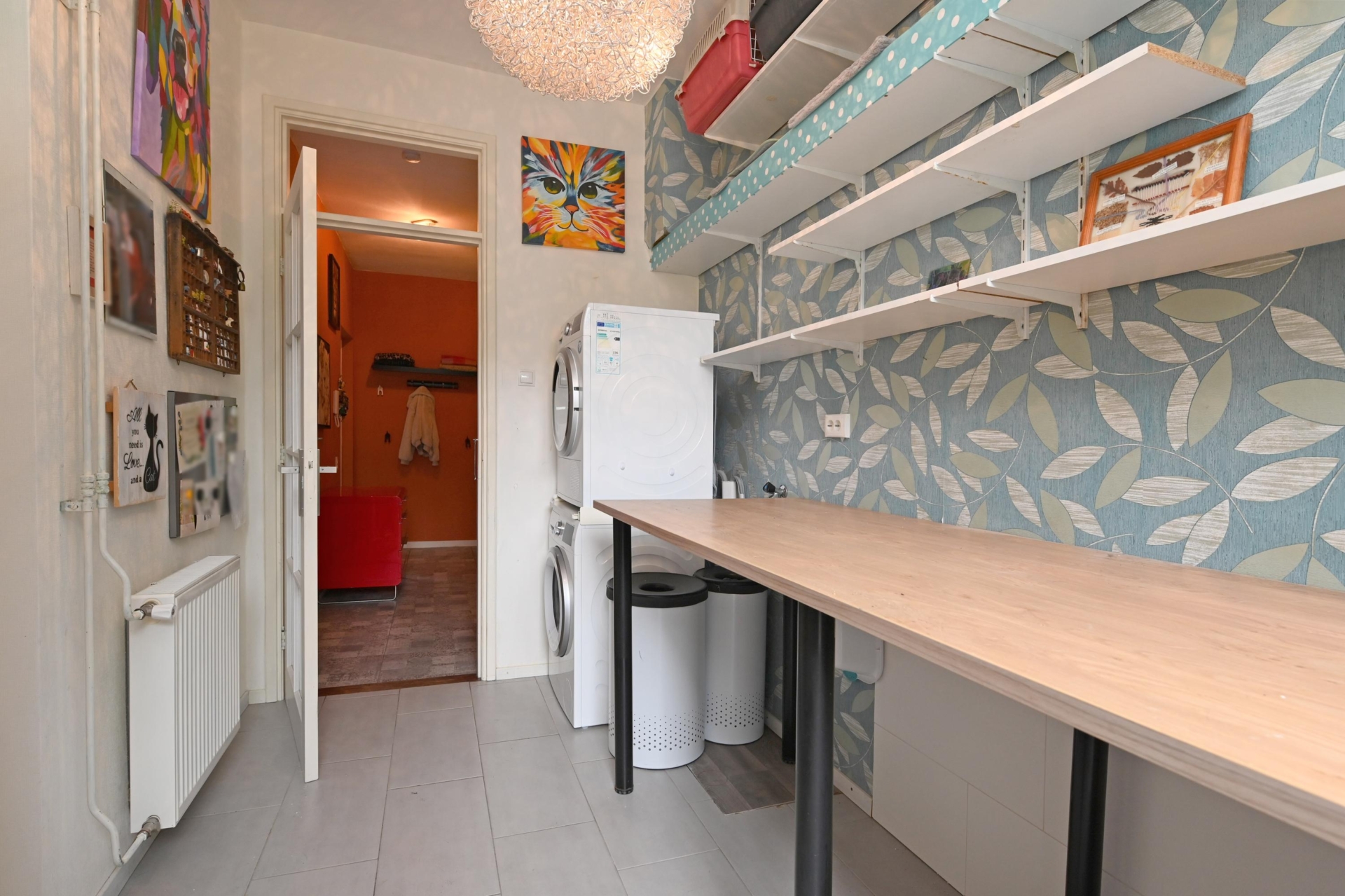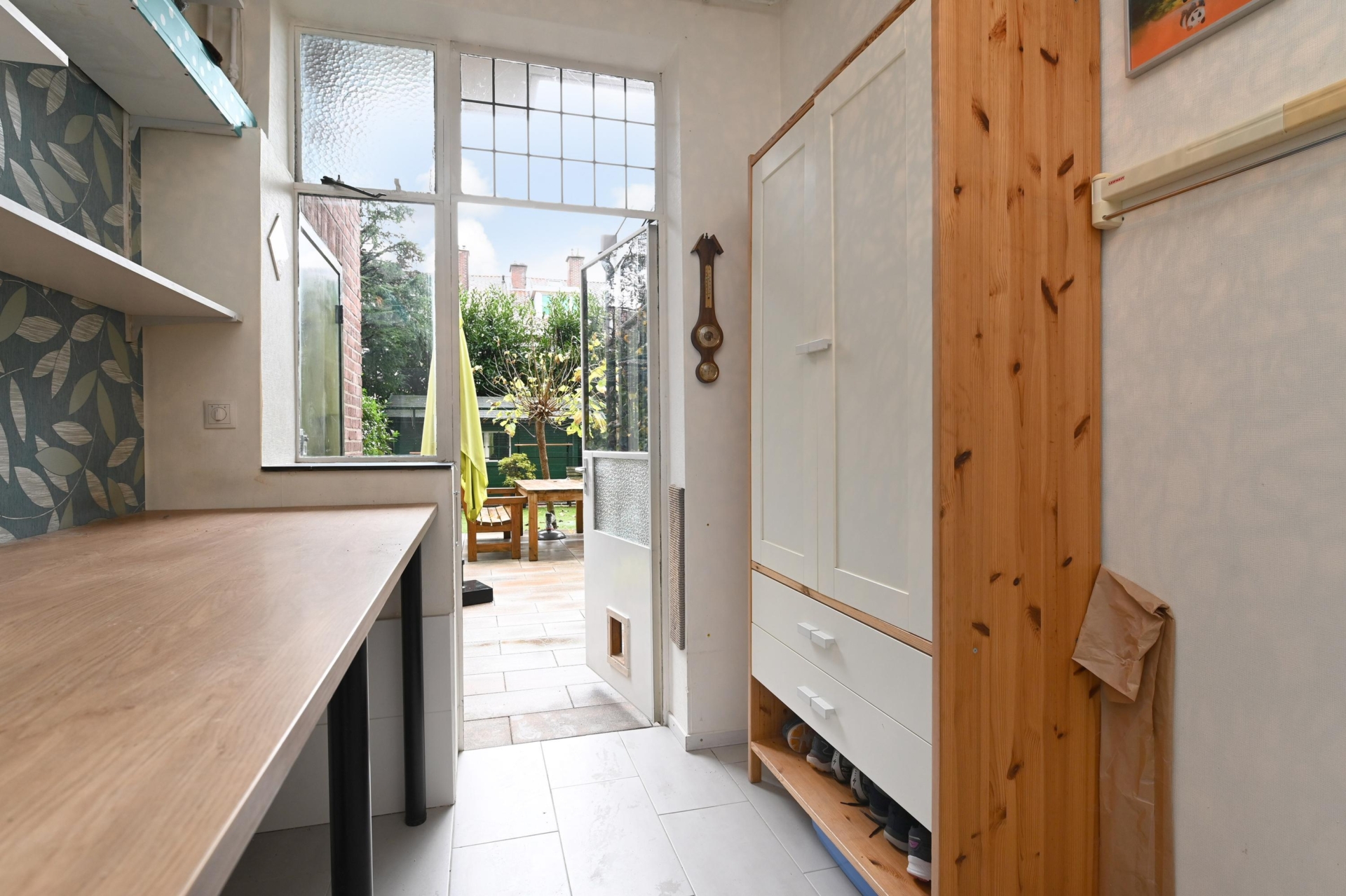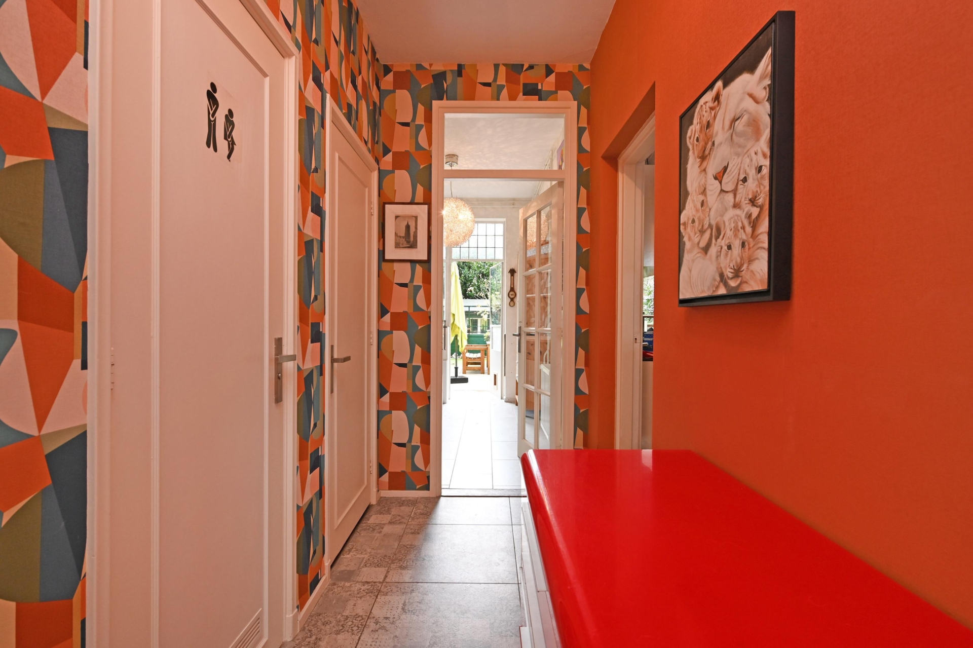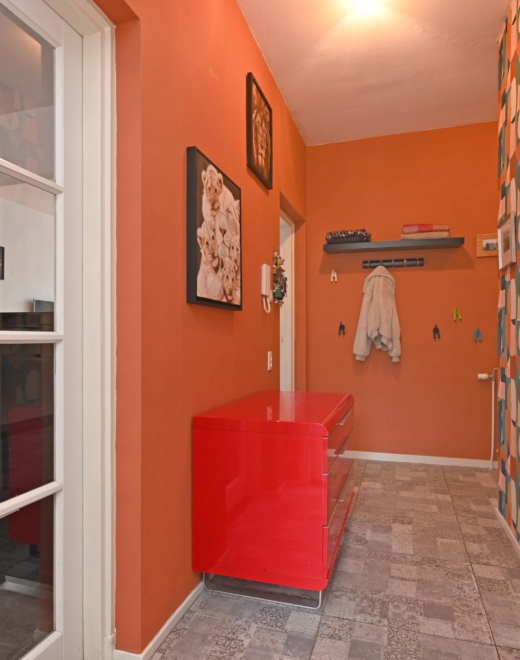 you step into a hallway with modern tiling (2021), built-in storage space and access to almost all rooms.