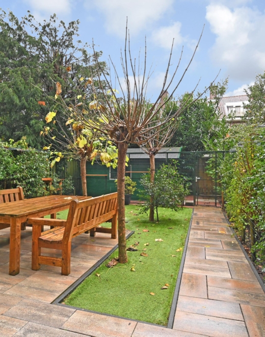 the lush rear garden is beautifully landscaped, wonderfully sunny, south east-facing, and features a garden shed (2017) and a back entrance. there are also two storage cabinets, and the fencing has been renewed.