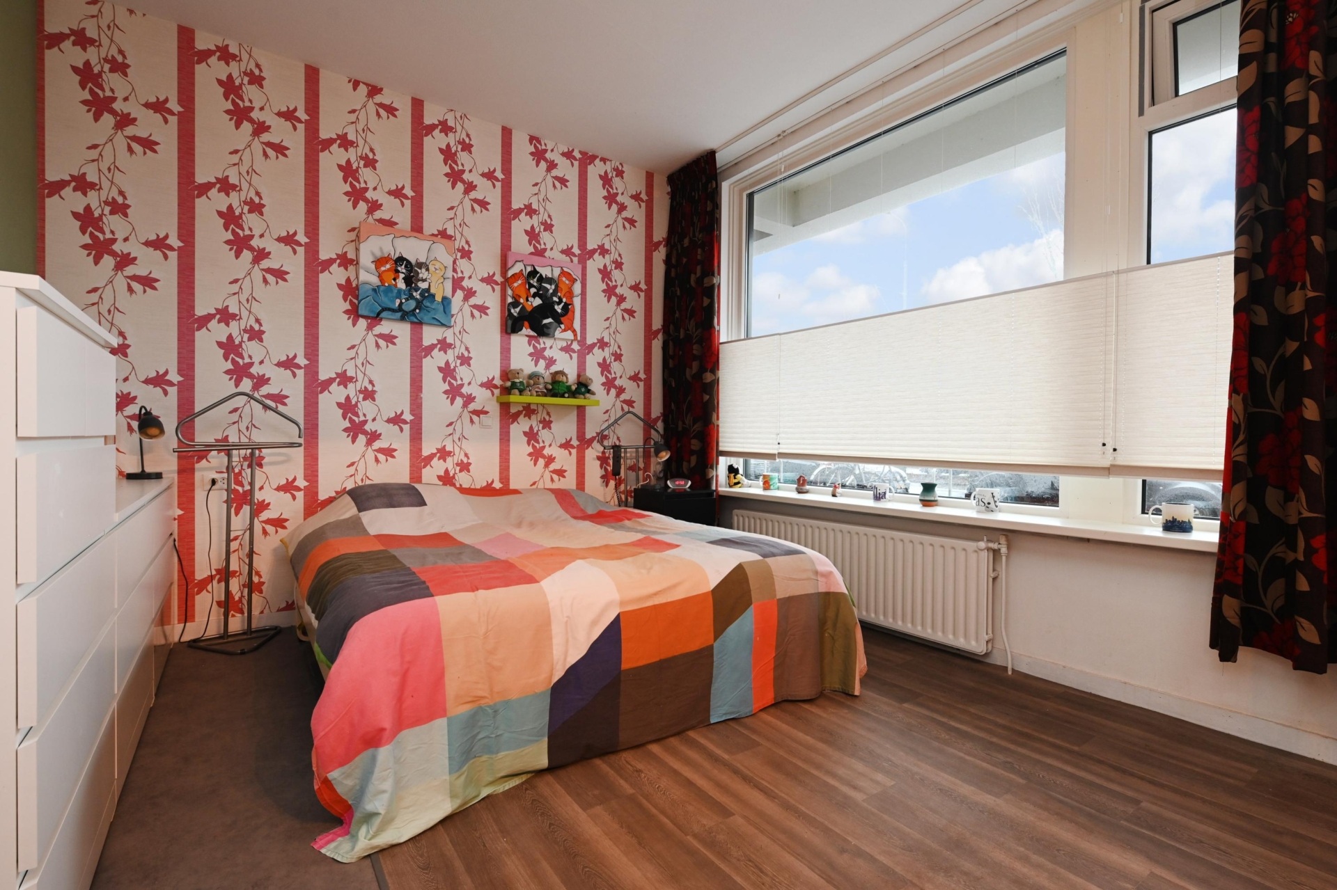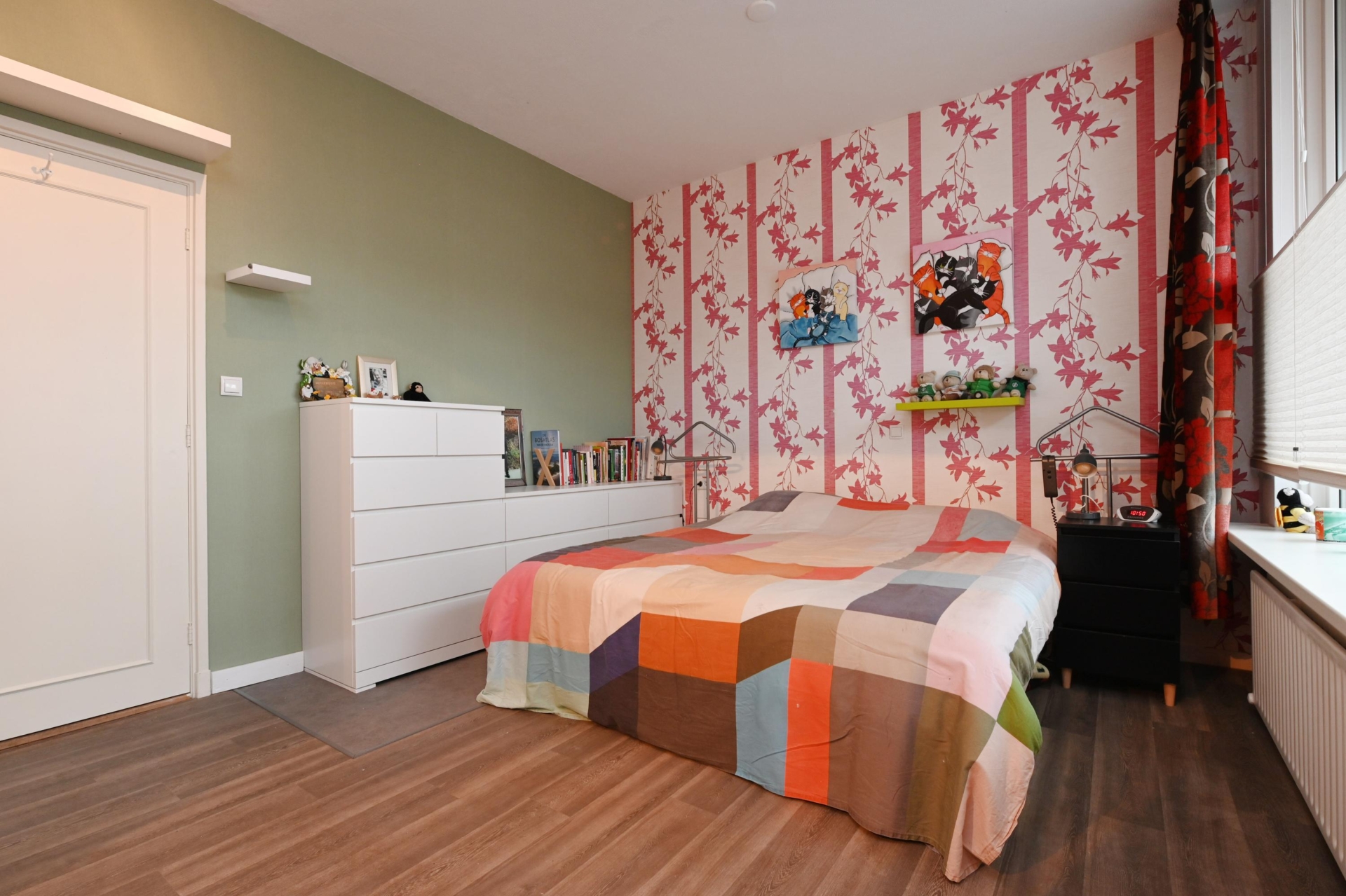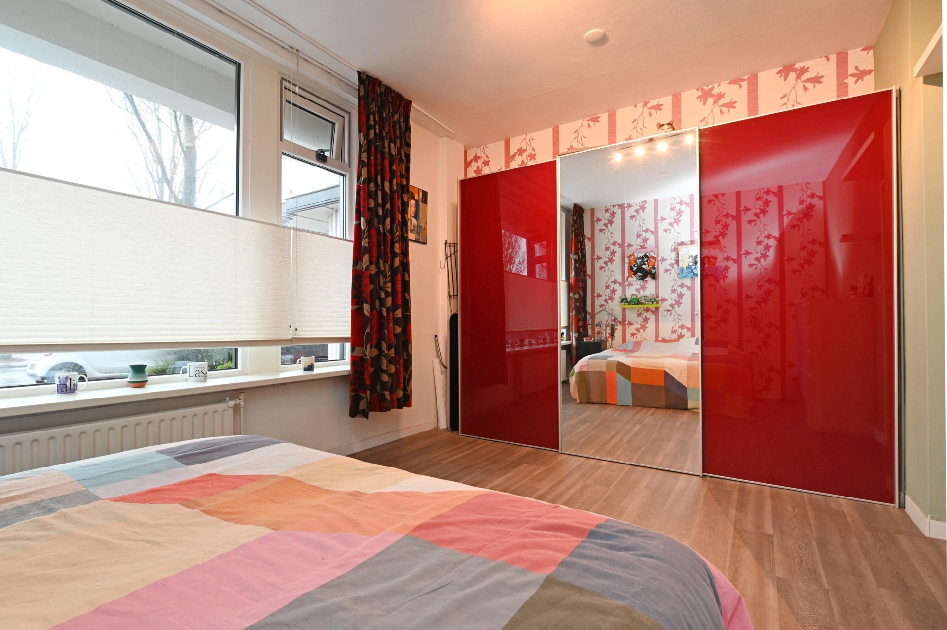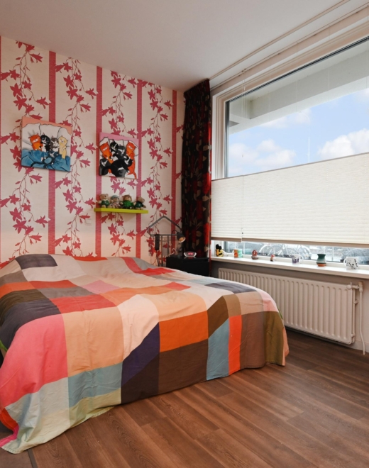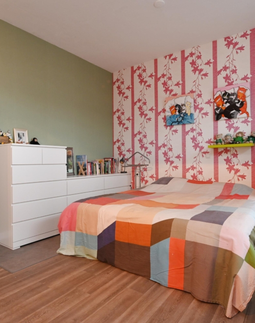 at the front lies the generous bedroom with a wardrobe; in 2025, new flooring was installed here.