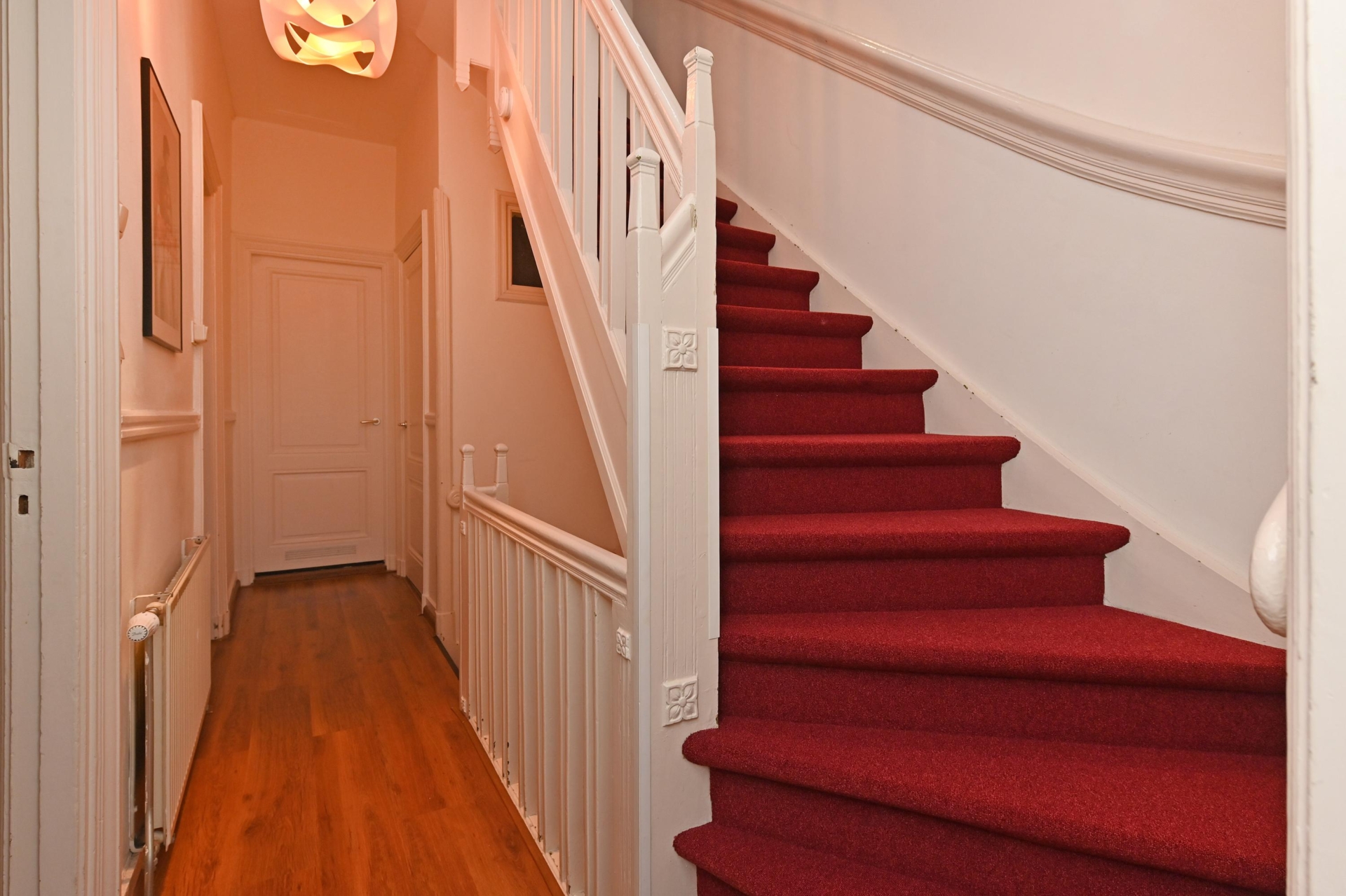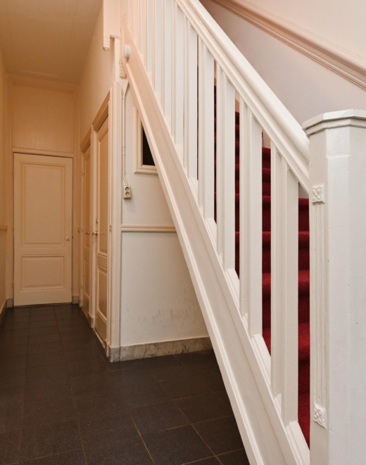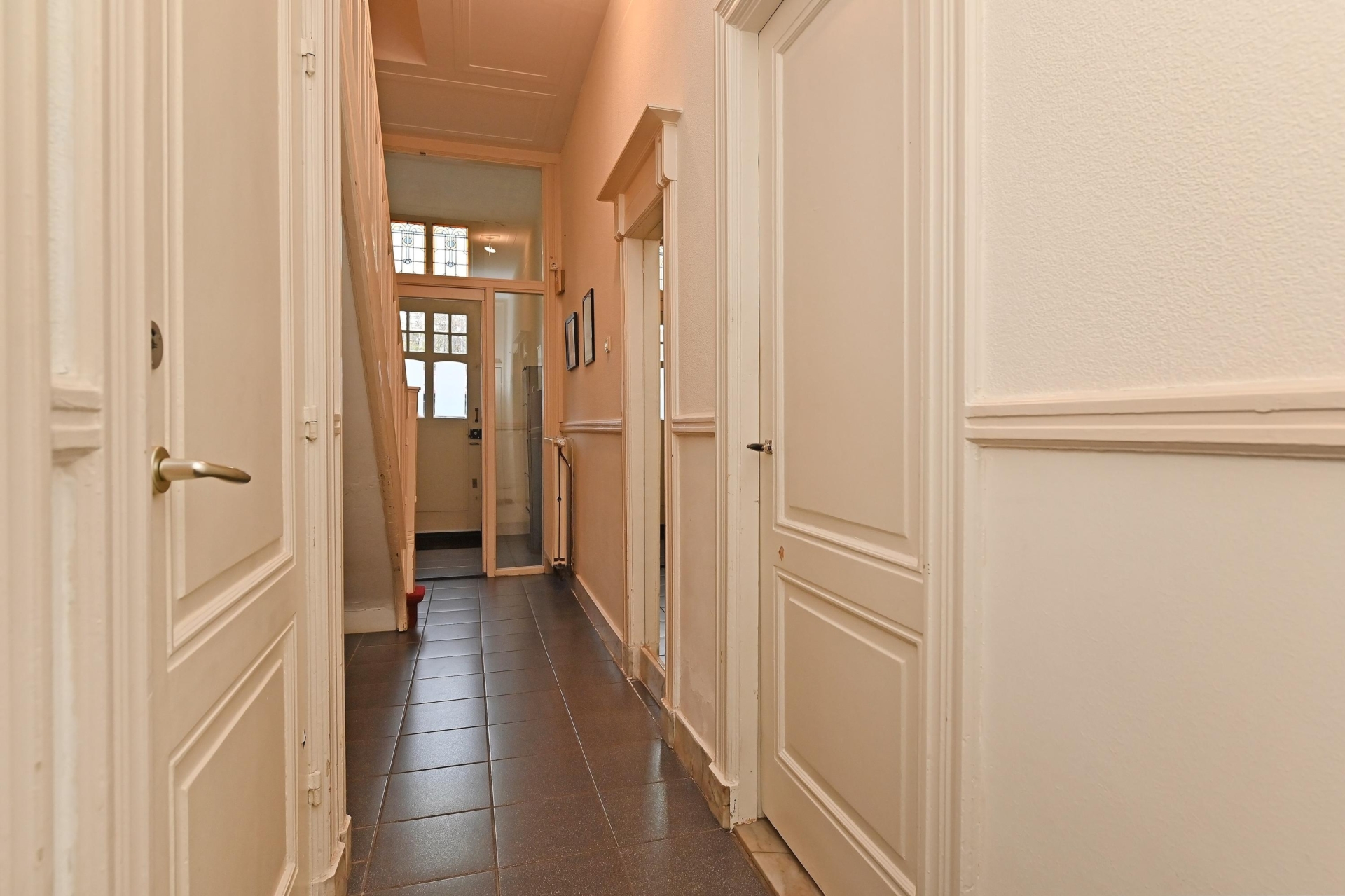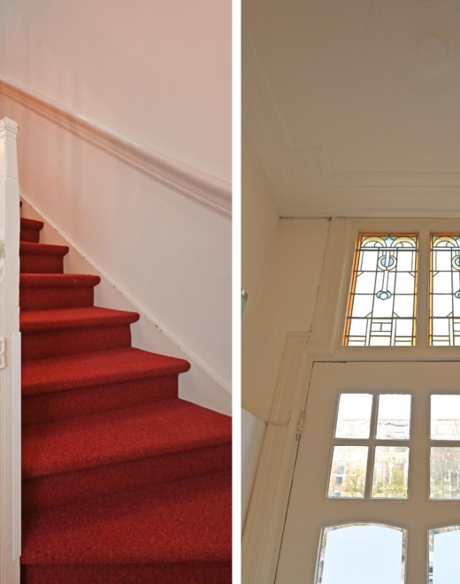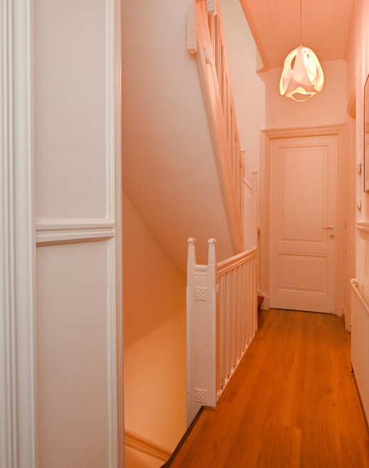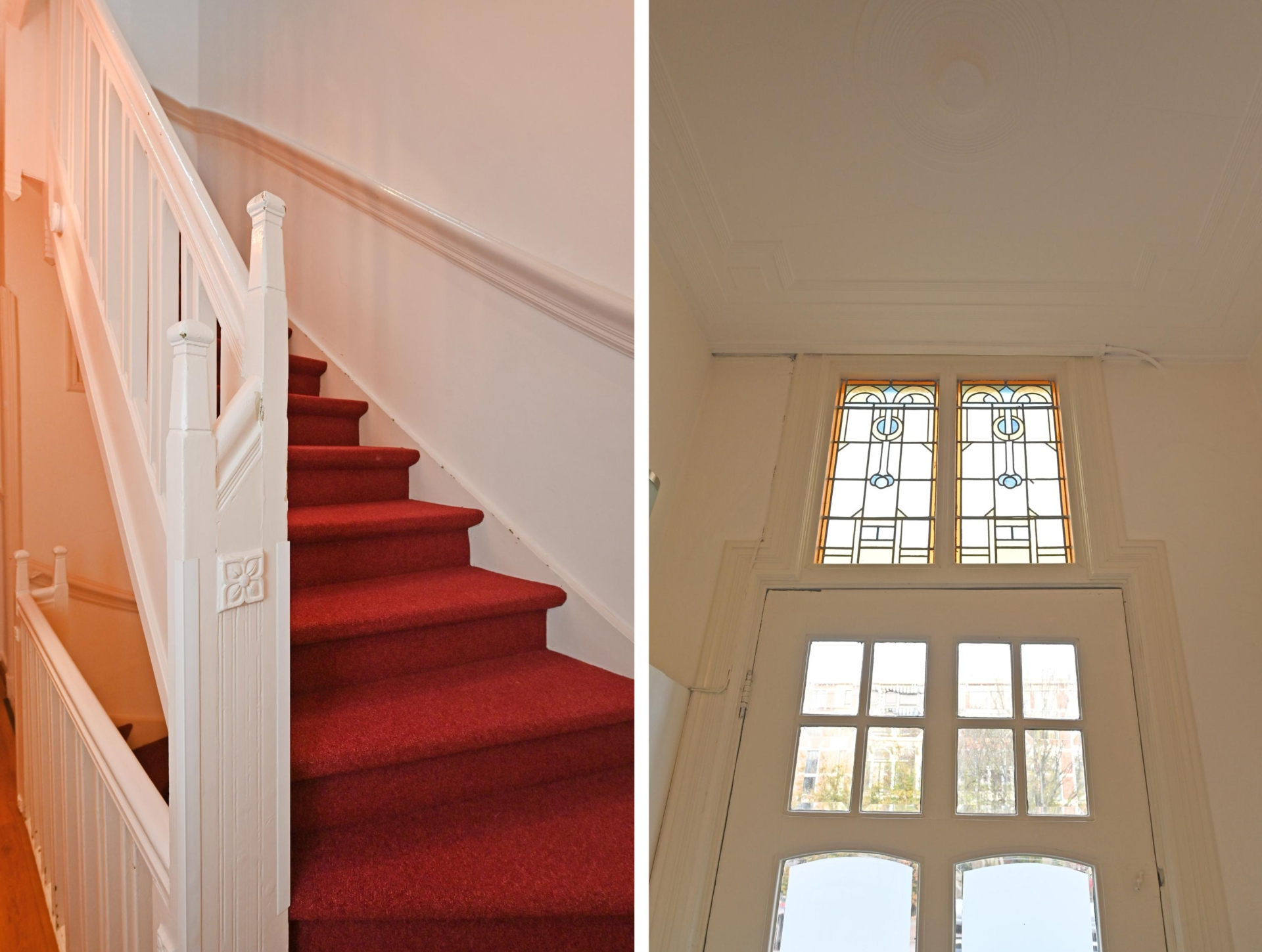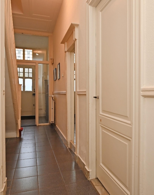 entrance with beautiful stained-glass detail above the front door, a vestibule with meter cupboard, spacious hallway and a large storage closet. the property also features a generous (wine) cellar and a modern toilet with wash basin.