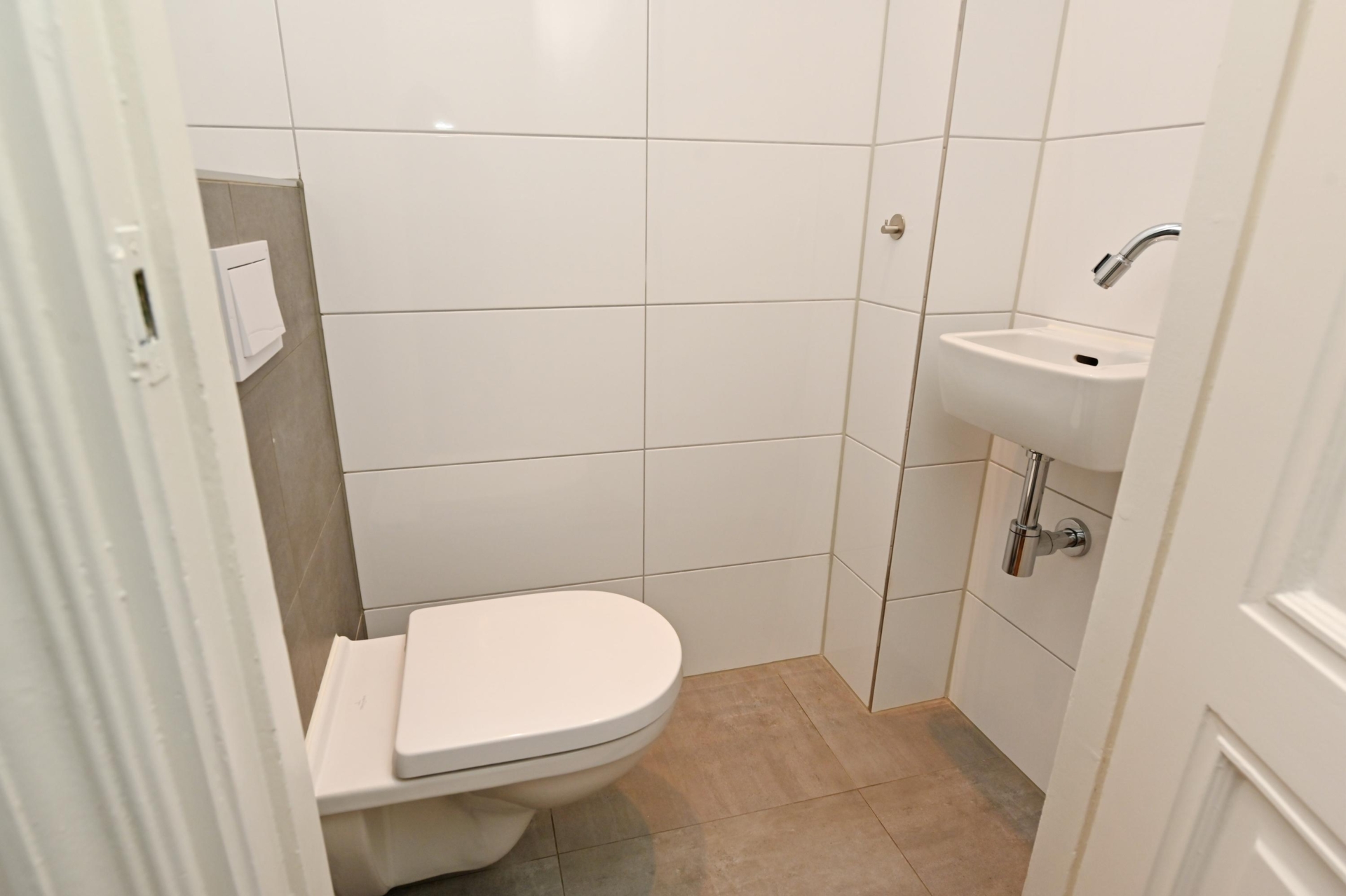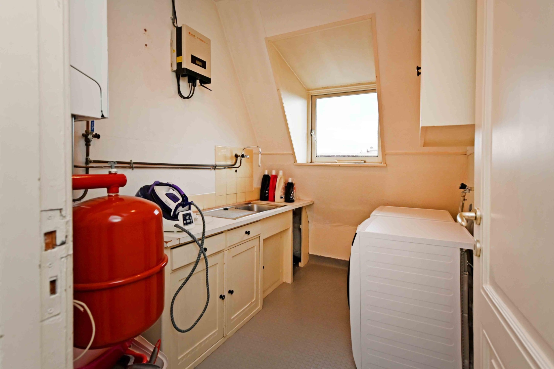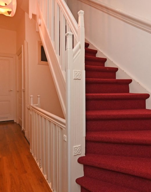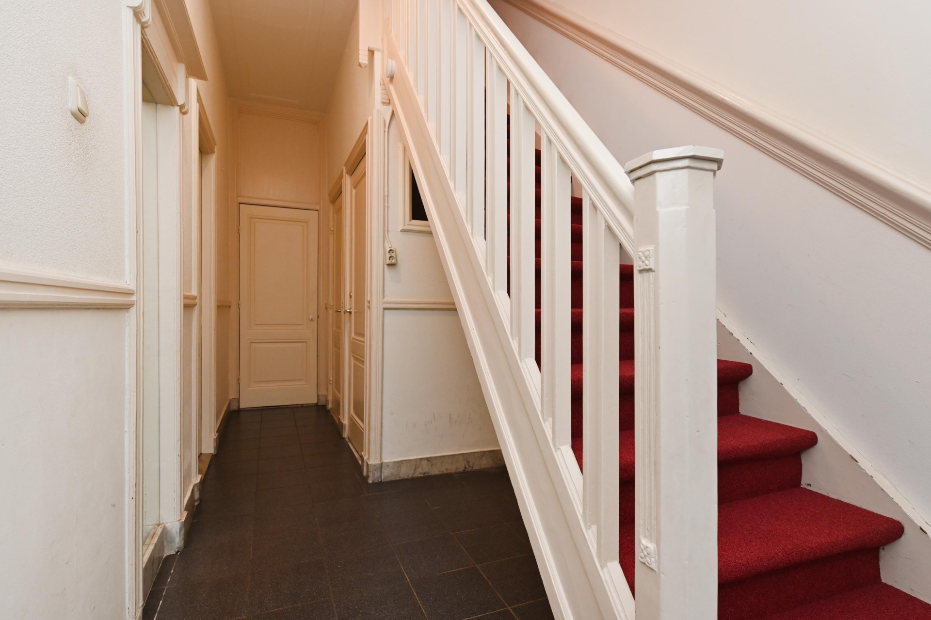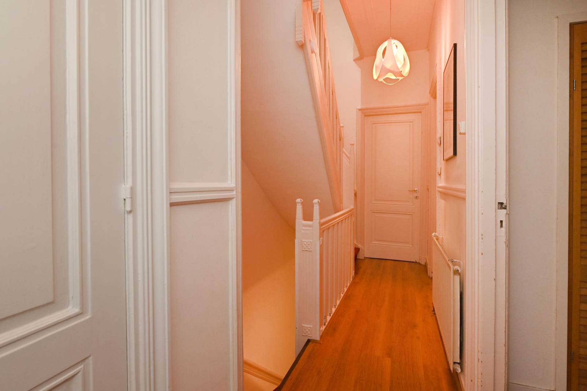 entrance with beautiful stained-glass detail above the front door, a vestibule with meter cupboard, spacious hallway and a large storage closet. the property also features a generous (wine) cellar and a modern toilet with wash basin.