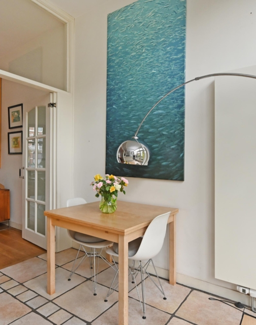 the expansive living and dining room (formerly en suite) boasts a solid oak parquet floor and connects, via a practical separation, to the inviting and wide kitchen-diner. the kitchen is equipped with a large miele steam oven, miele dishwasher, 5-burner gas hob with wok burner (atag), extractor hood and a bosch fridge-freezer. french doors open out onto the sunny, spacious south-facing garden, complete with two convenient storage sheds.