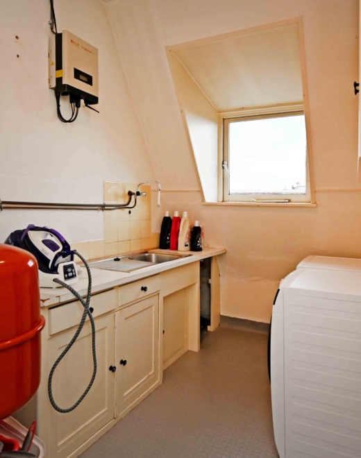 the second floor offers a bright landing and a very spacious room (28 m²) with an extended side room, where two or even three bedrooms can easily be created, with access to the back balcony. in addition, there is a very light front bedroom (also suitable for division), a second neat bathroom with toilet, shower and wash basin, and a practical laundry room with an additional electrical group, solar panel inverter, central heating system and a useful kitchenette.