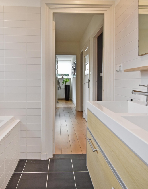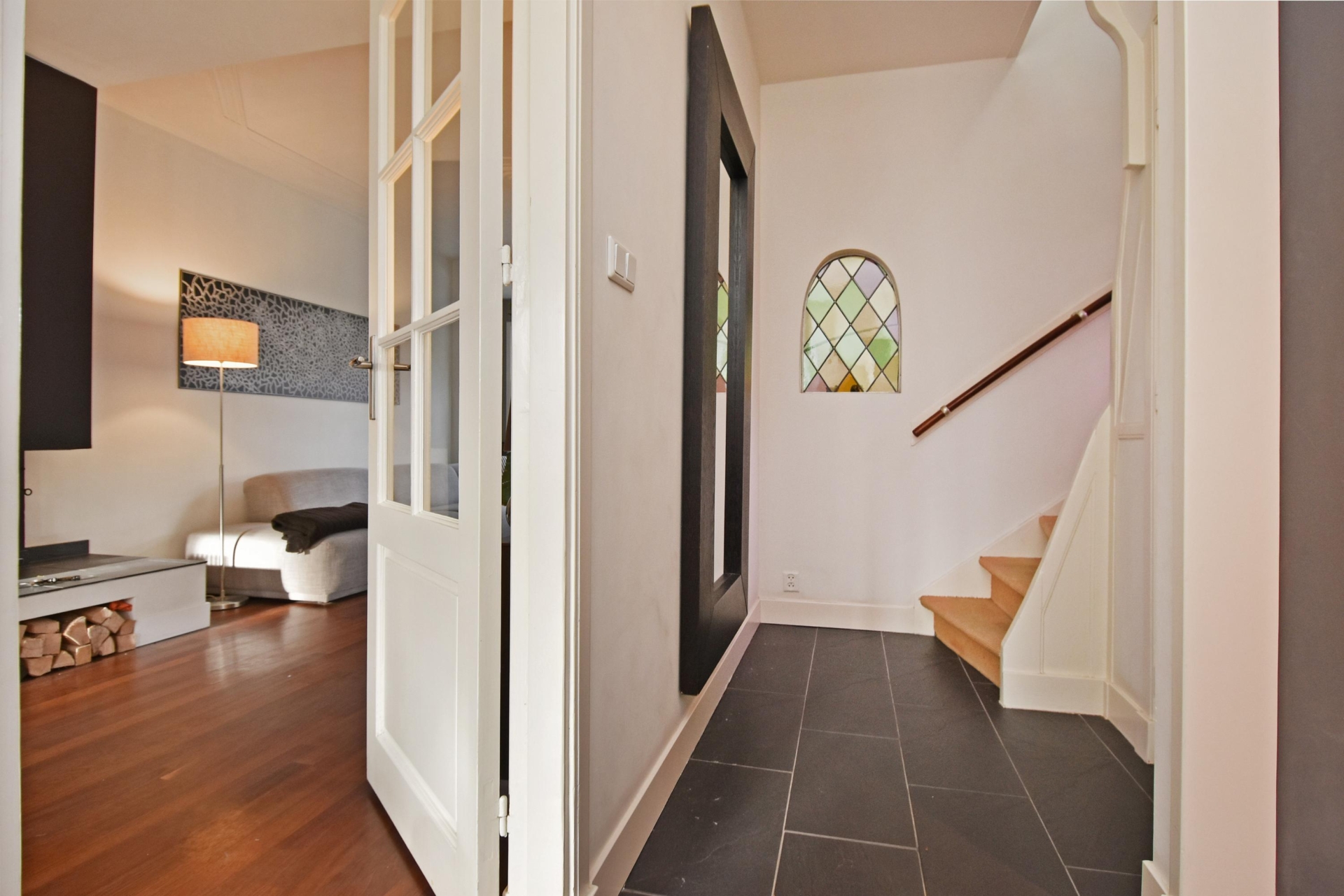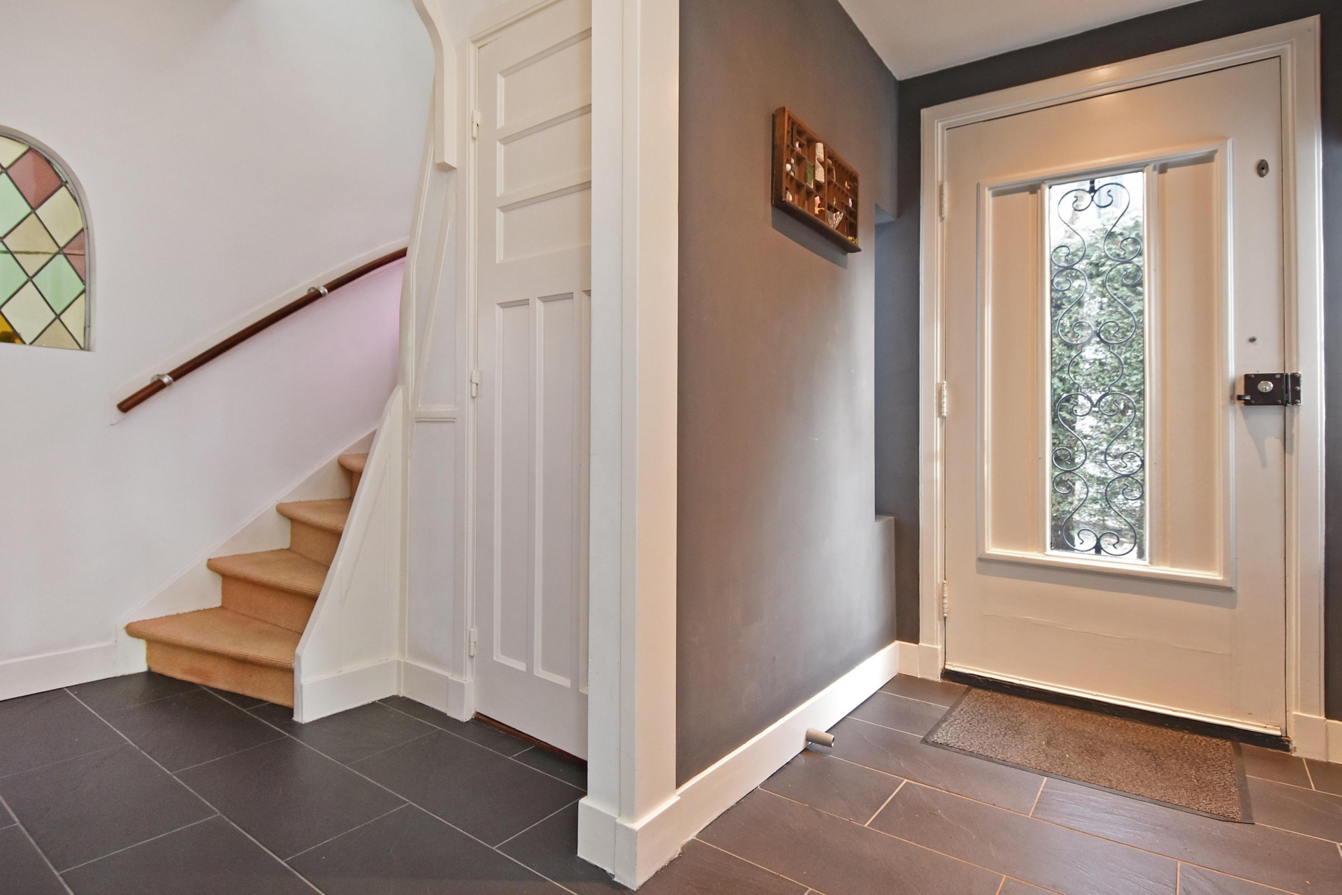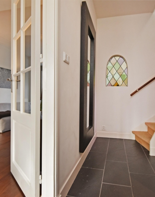 upon entering this charming corner house, you step into a well-maintained hallway with a modern appearance. here you will find a wall-hung, stylishly tiled toilet and a practical under-stairs storage cupboard. the finish is sleek and contemporary, creating a pleasant first impression.