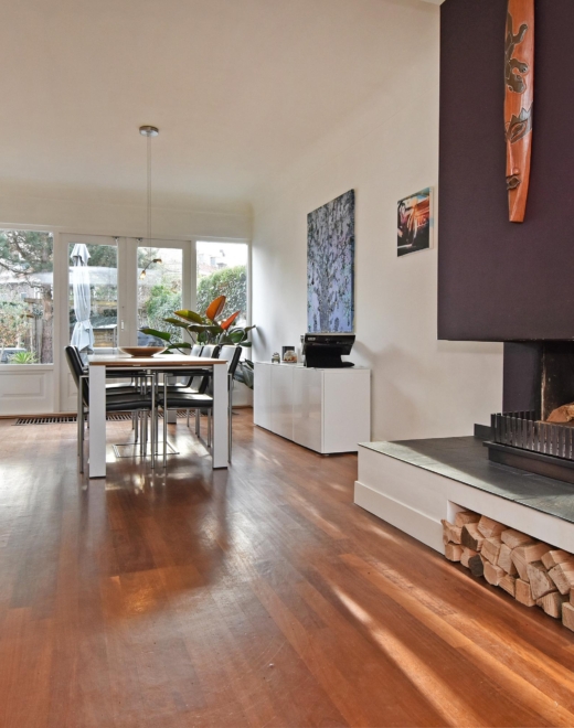 the spacious l-shaped living/dining room is wonderfully bright thanks to its corner position and features a cosy, wood-burning fireplace. the open-plan kitchen is directly connected to the living room and is arranged in a practical l-shape with a tumbled natural stone worktop and various built-in appliances, including a fridge with freezer compartment, combination microwave/oven, five-burner hob and dishwasher. from the living room, french doors provide access to the sunny, south-facing backyard.