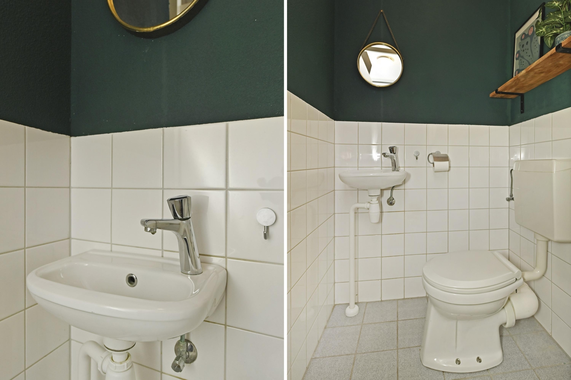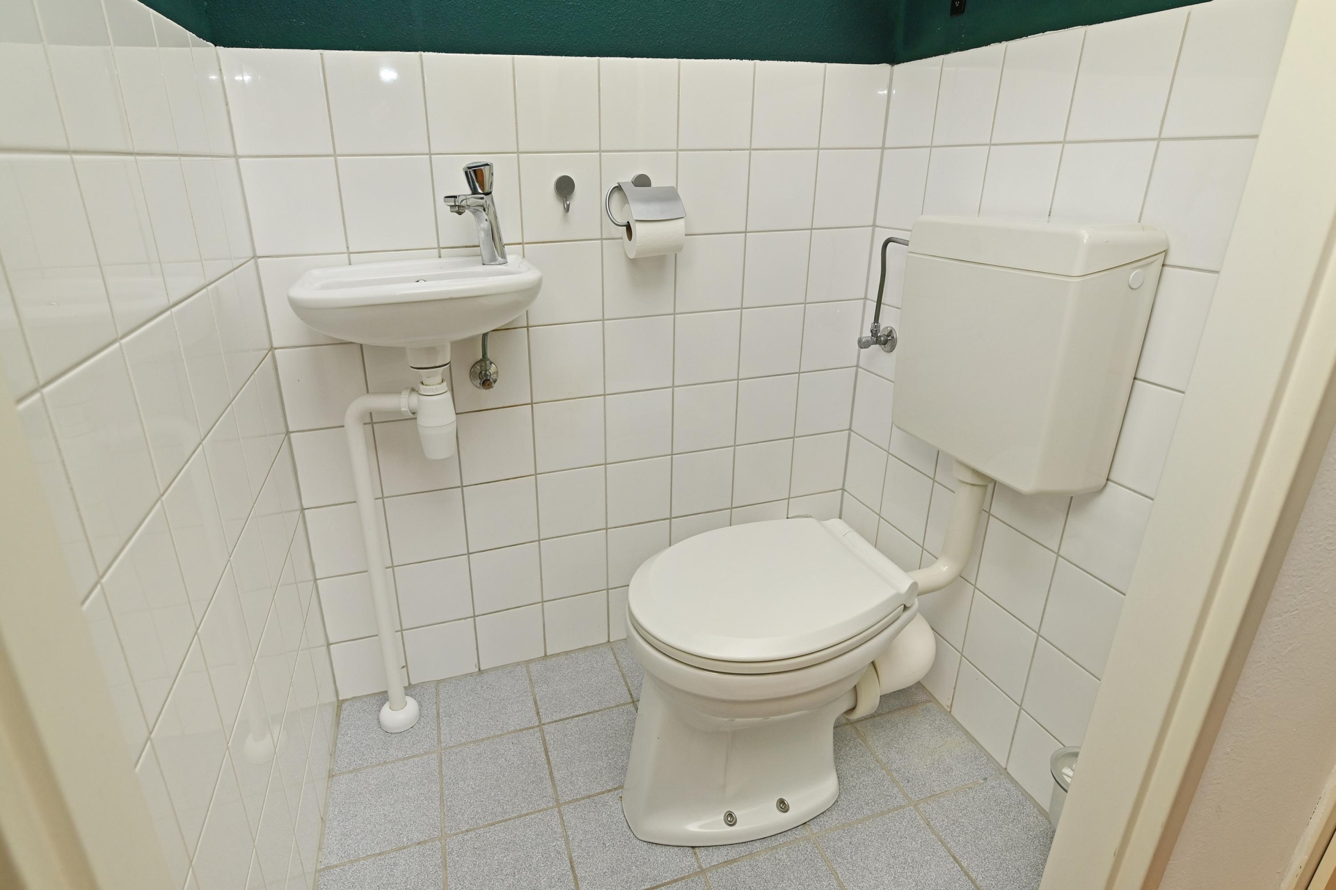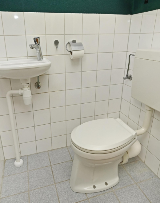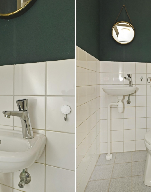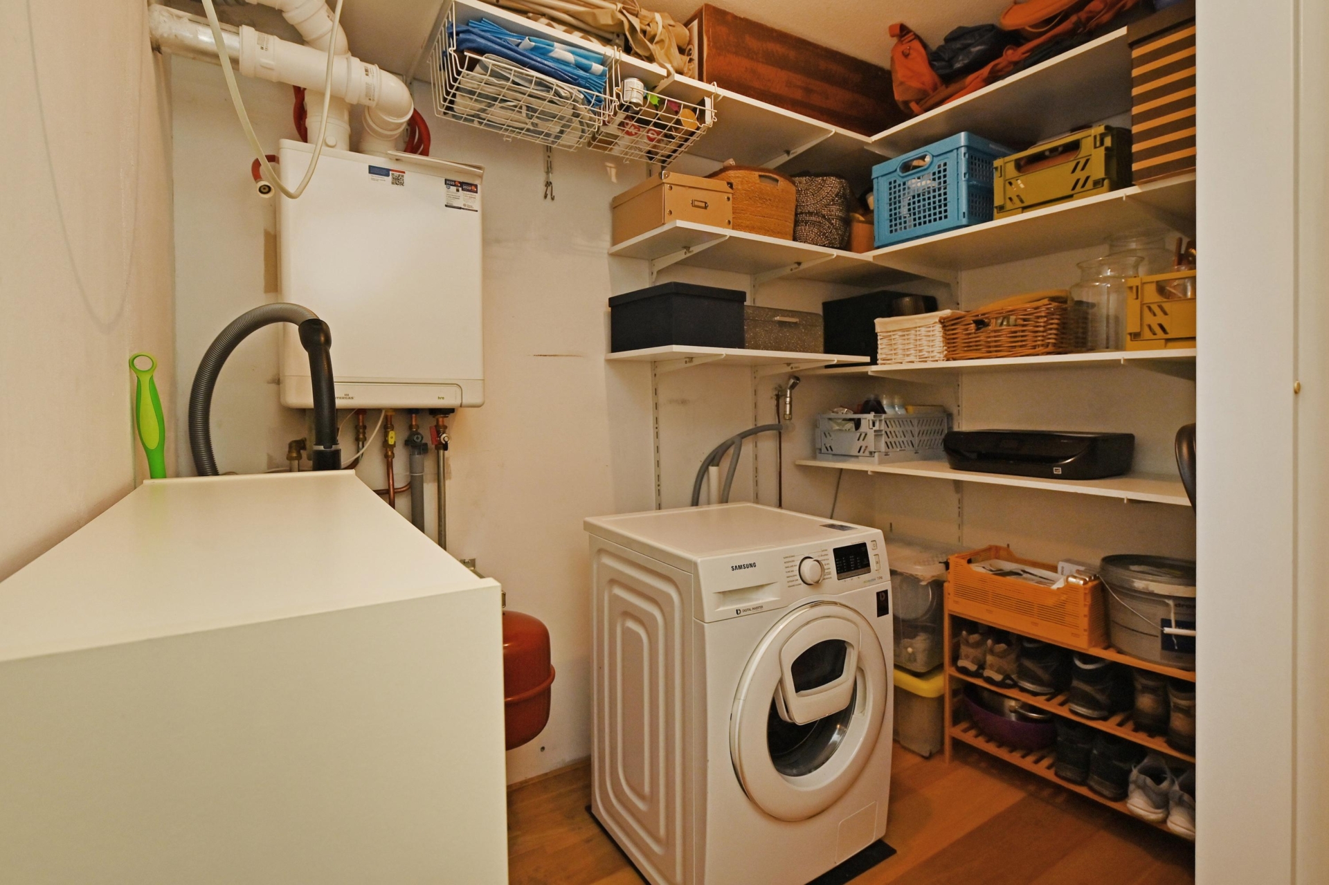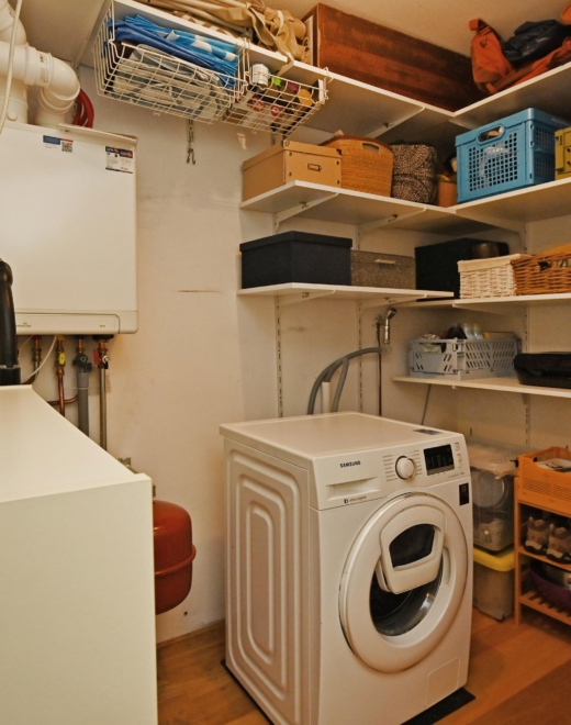 the spacious hallway includes a meter cupboard and a practical storage room housing the central heating system and the washing machine connection. the modernised toilet is fitted with a small washbasin.