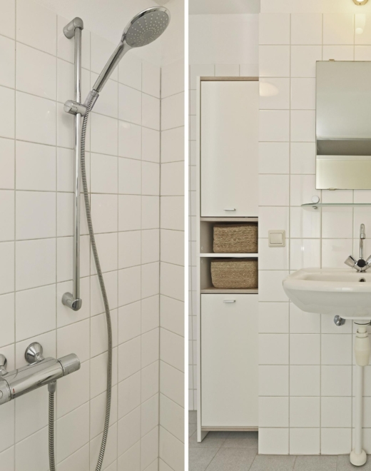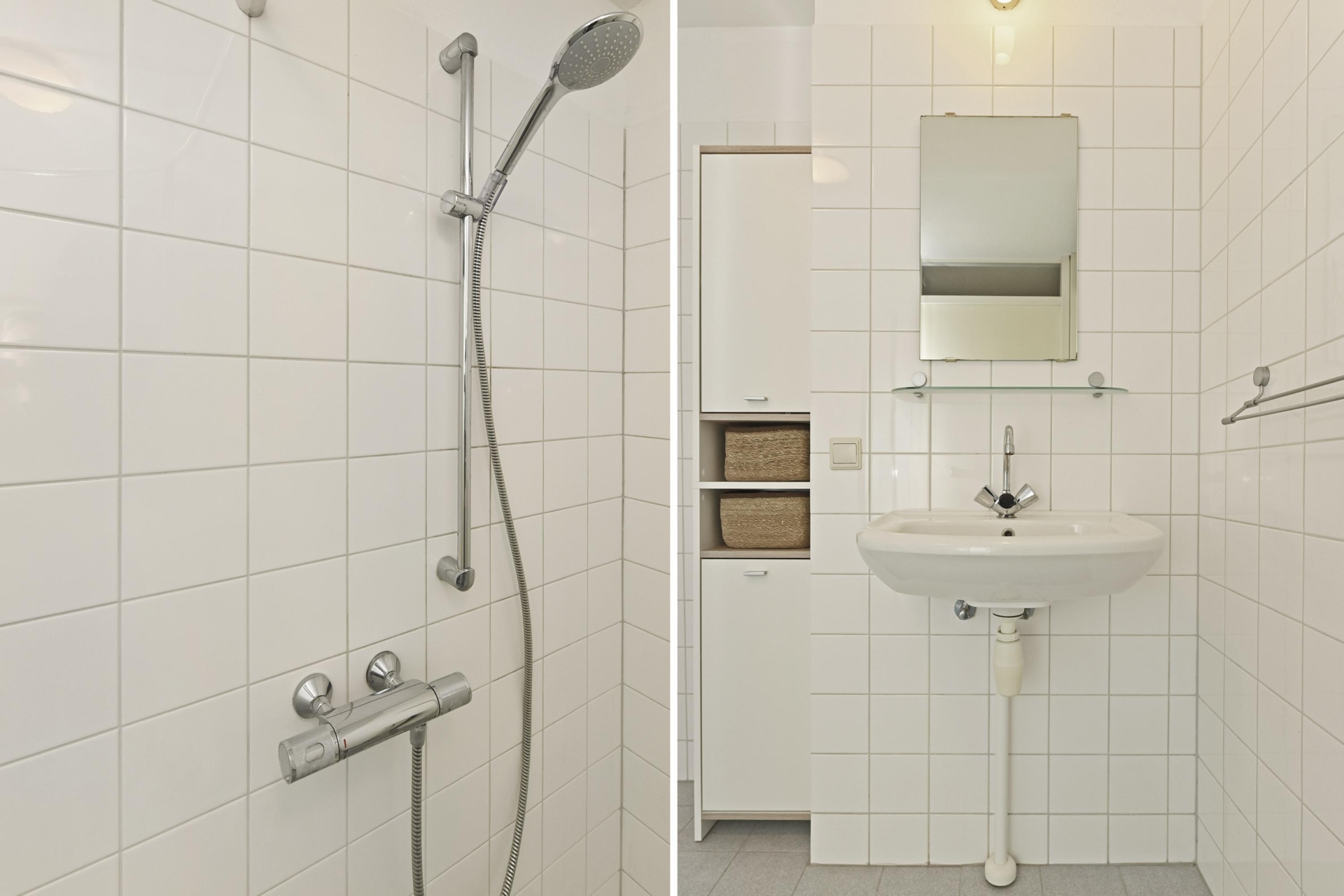 the apartment offers two bedrooms: the spacious bedroom on the quiet street side also provides access to the balcony, while the second bedroom, located on the gallery side, is equally tranquil. the modern bathroom—accessible from both the hallway and the main bedroom—features a generous walk-in shower with a glass door, a washbasin and a radiator.