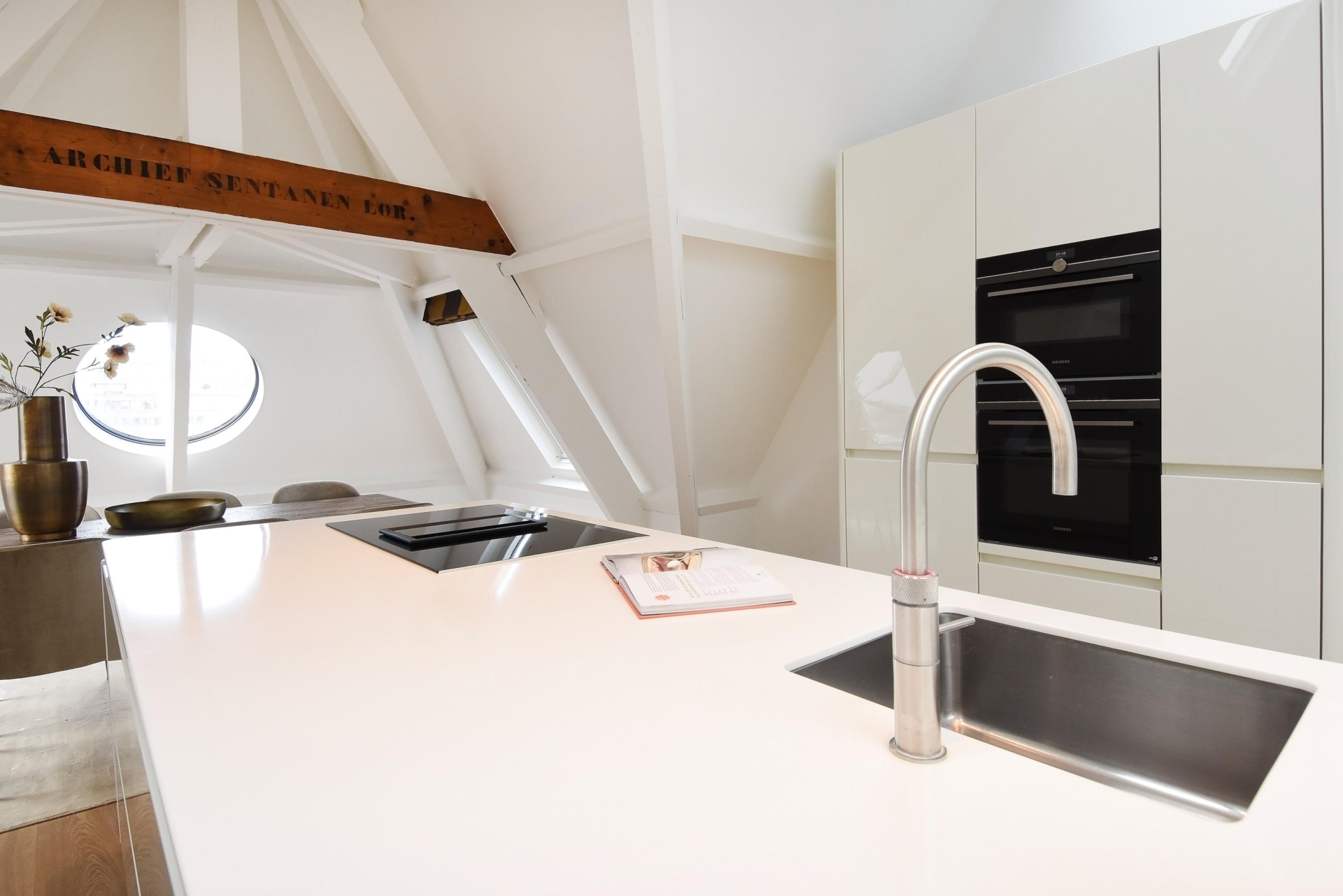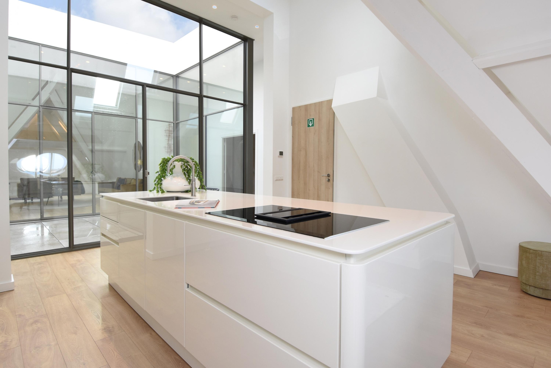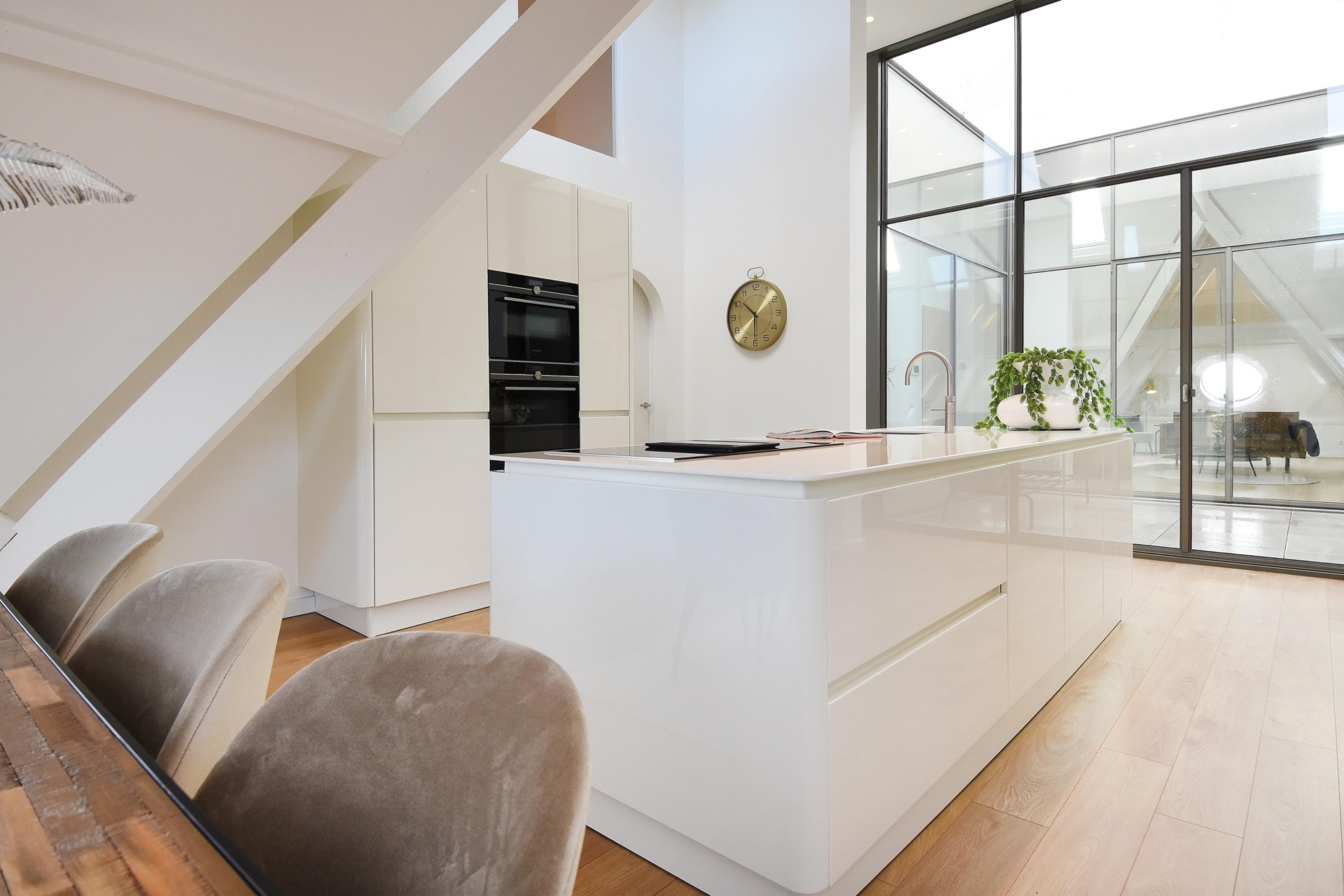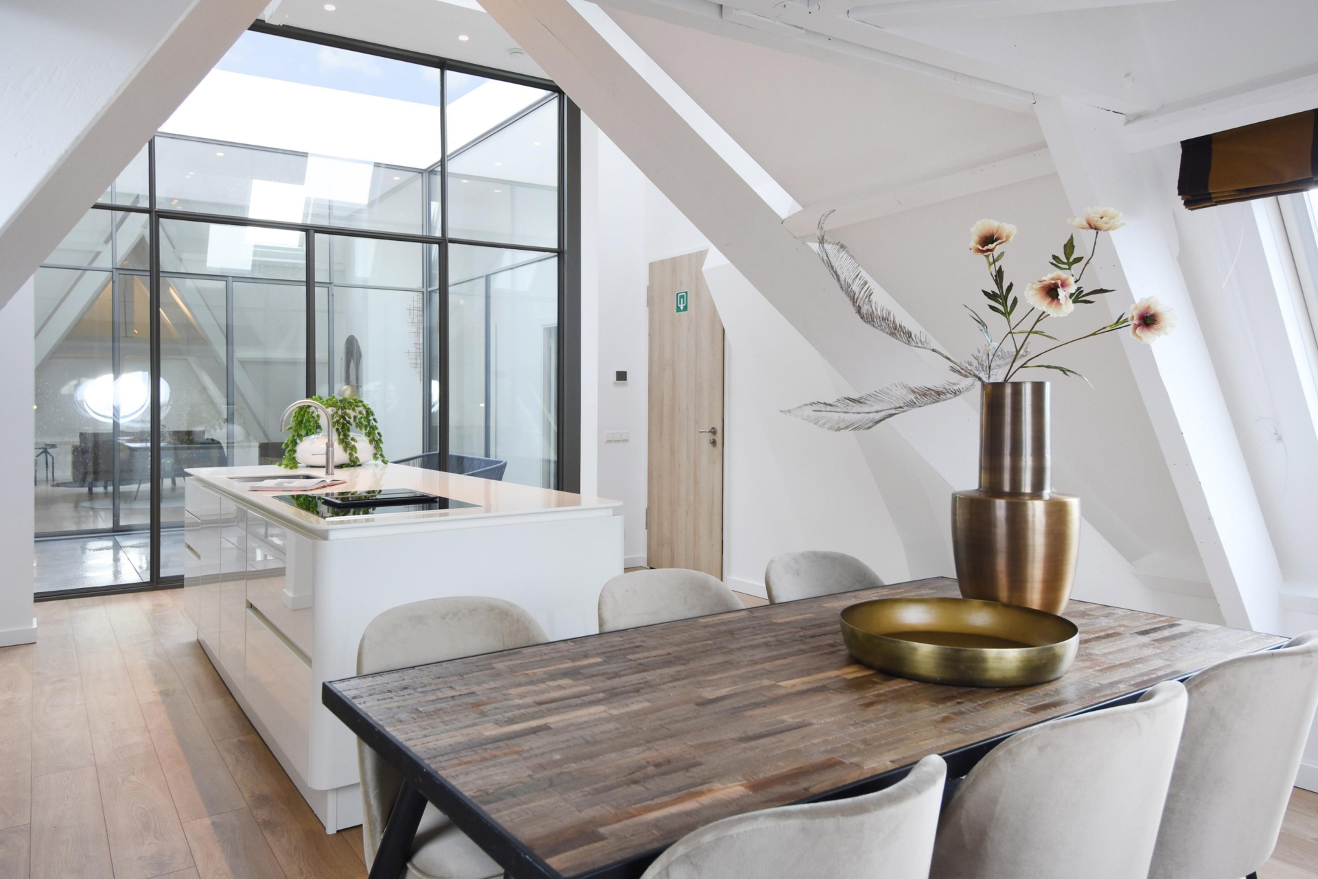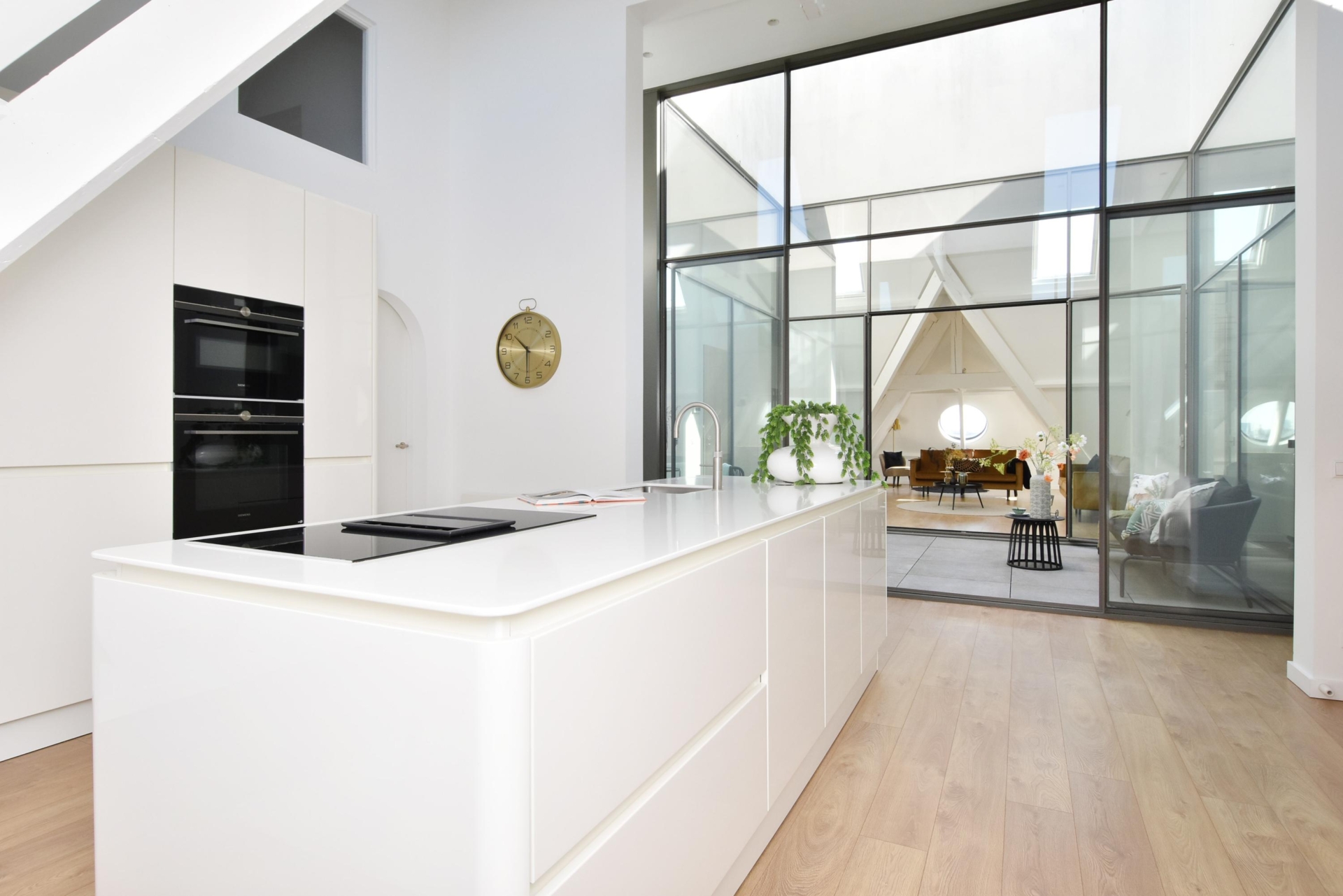 the high ceilings, original beams, and numerous (roof) windows create a unique bright space with panoramic views over the hague. the next125 high-gloss kitchen (28 m²) with a freestanding cooking island featuring a corian countertop is equipped with siemens built-in appliances, including a dishwasher, downdraft induction cooktop, quooker, multifunctional oven, and microwave.