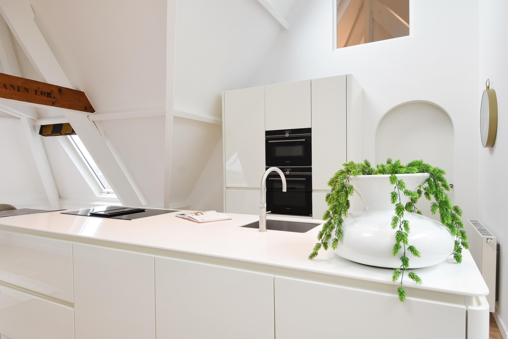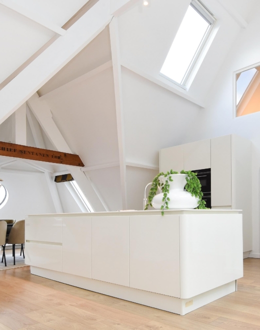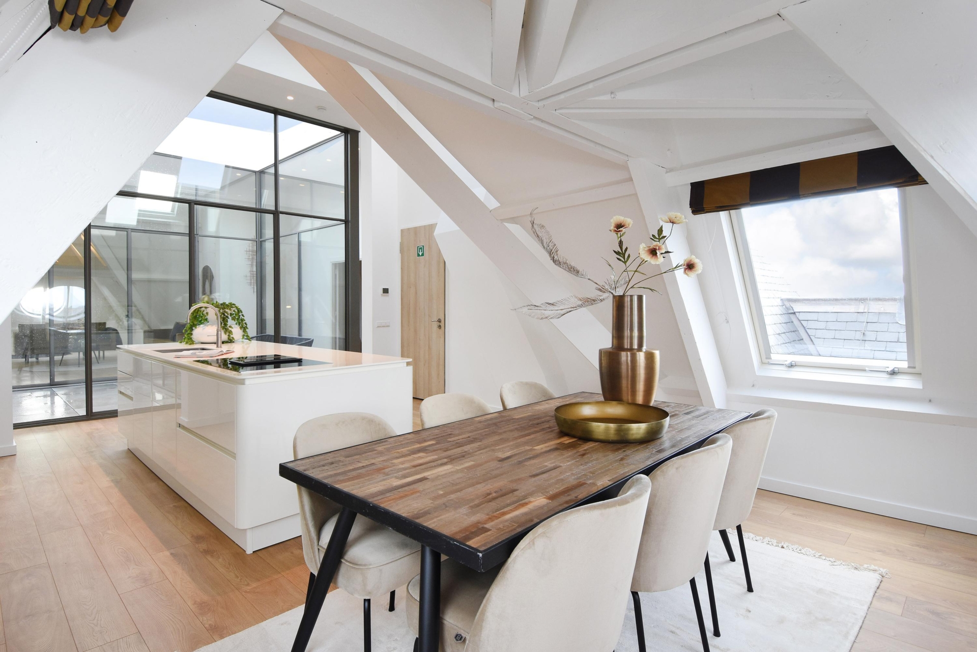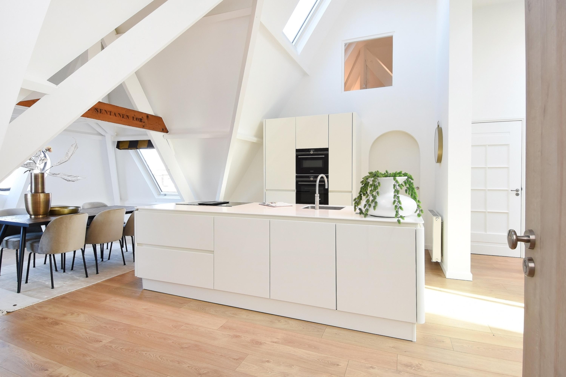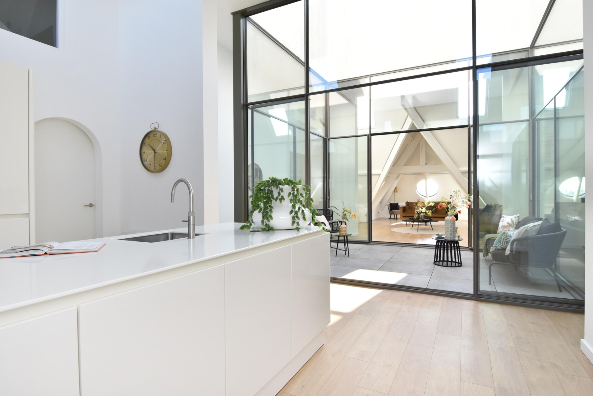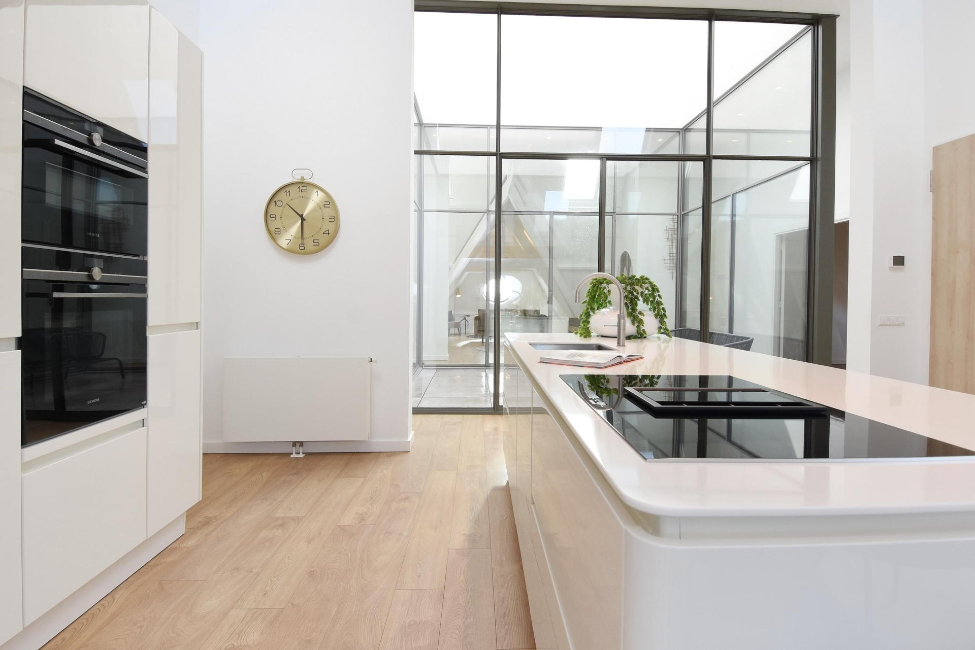 the high ceilings, original beams, and numerous (roof) windows create a unique bright space with panoramic views over the hague. the next125 high-gloss kitchen (28 m²) with a freestanding cooking island featuring a corian countertop is equipped with siemens built-in appliances, including a dishwasher, downdraft induction cooktop, quooker, multifunctional oven, and microwave.