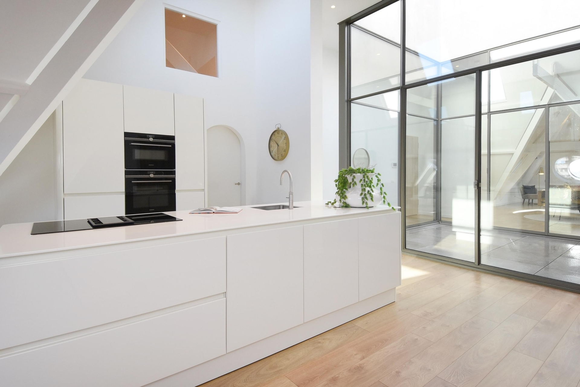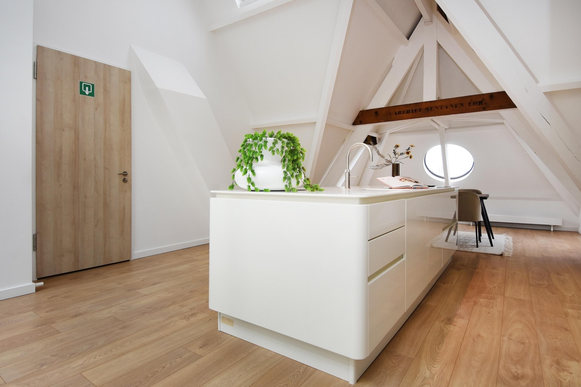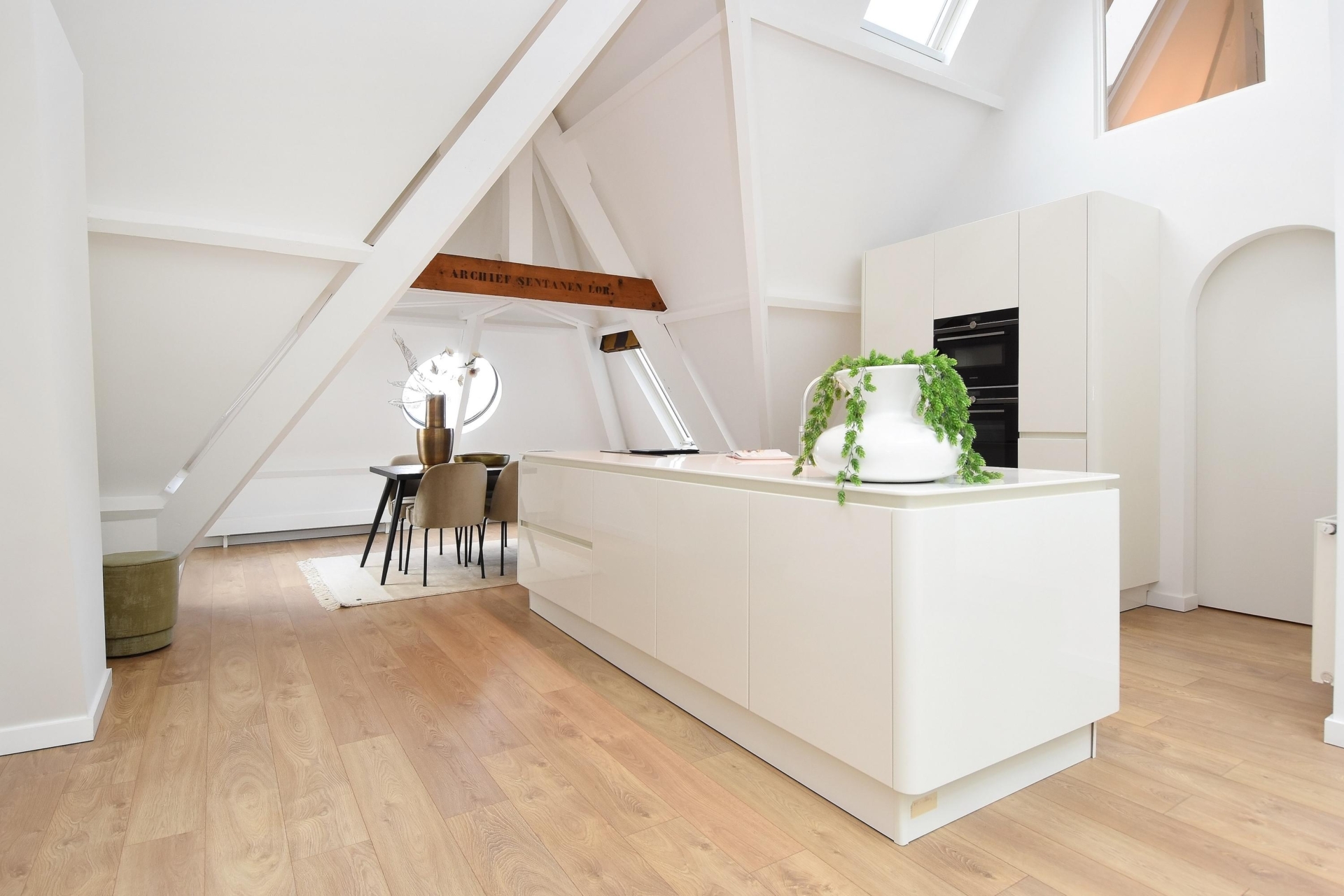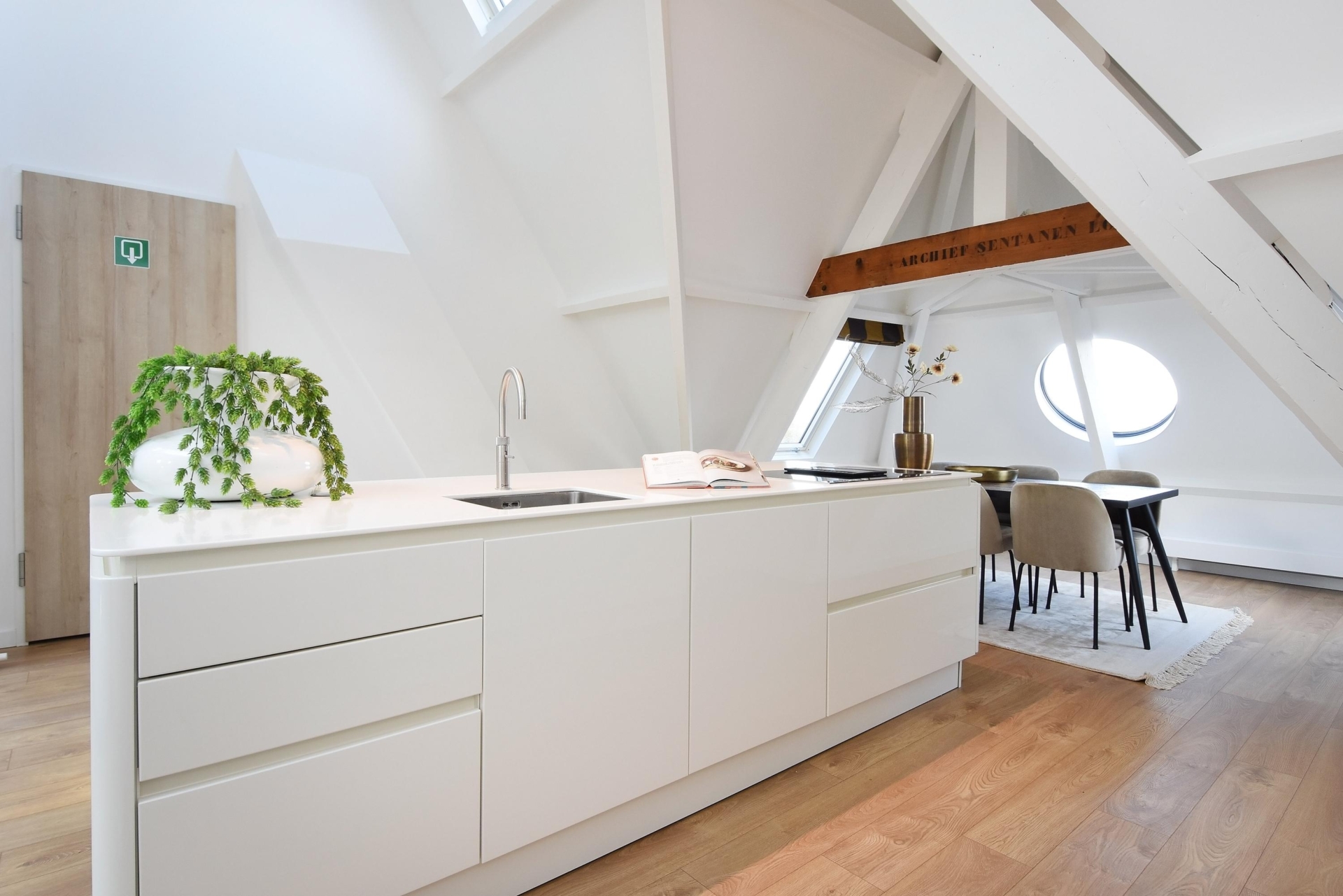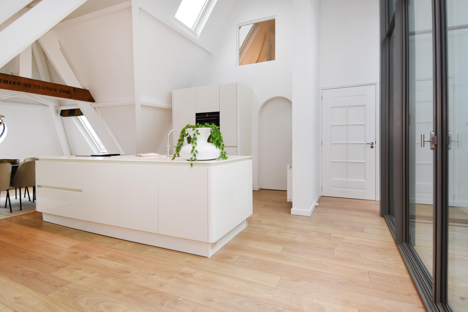 the high ceilings, original beams, and numerous (roof) windows create a unique bright space with panoramic views over the hague. the next125 high-gloss kitchen (28 m²) with a freestanding cooking island featuring a corian countertop is equipped with siemens built-in appliances, including a dishwasher, downdraft induction cooktop, quooker, multifunctional oven, and microwave.
