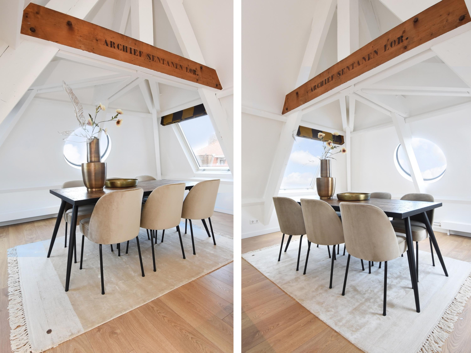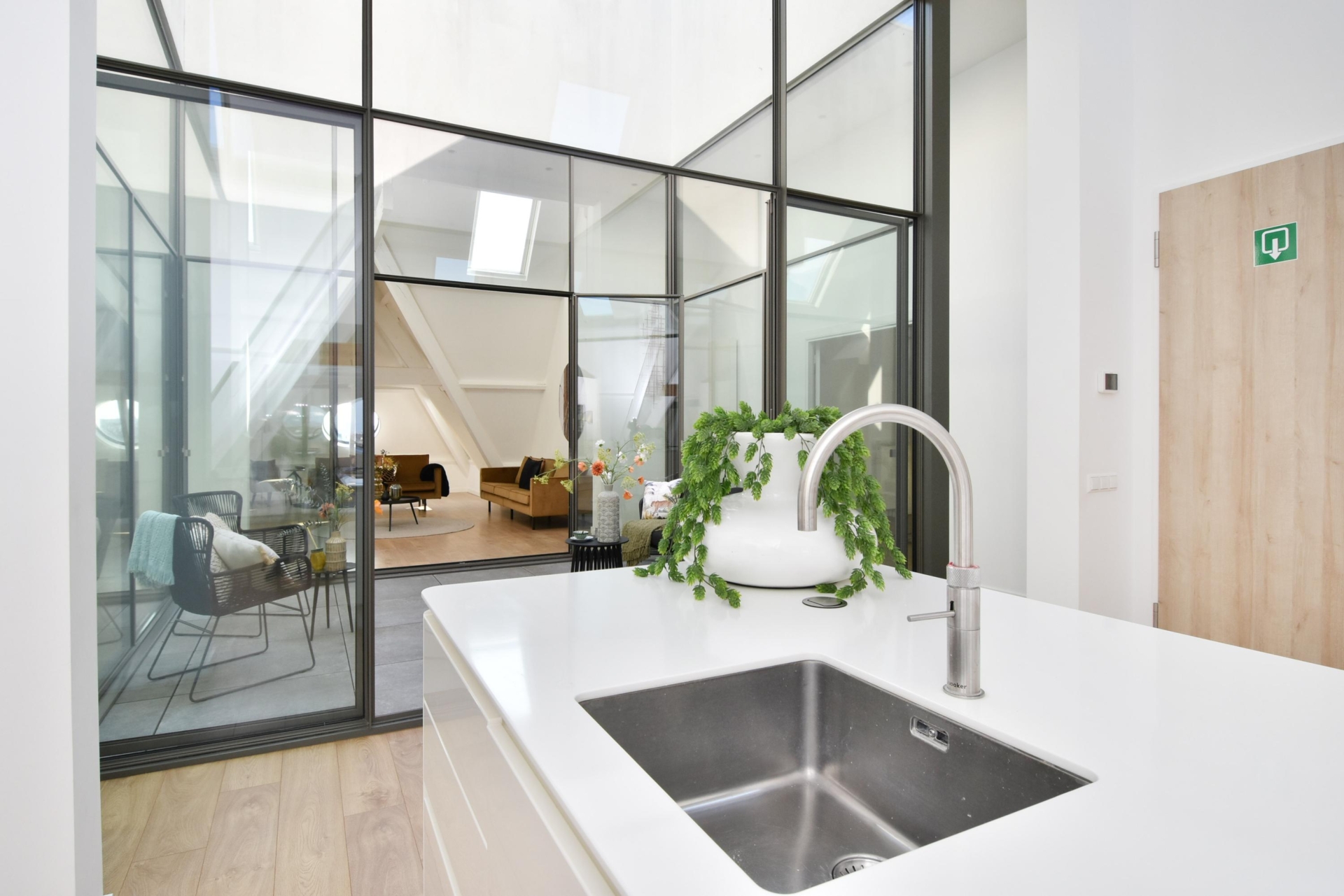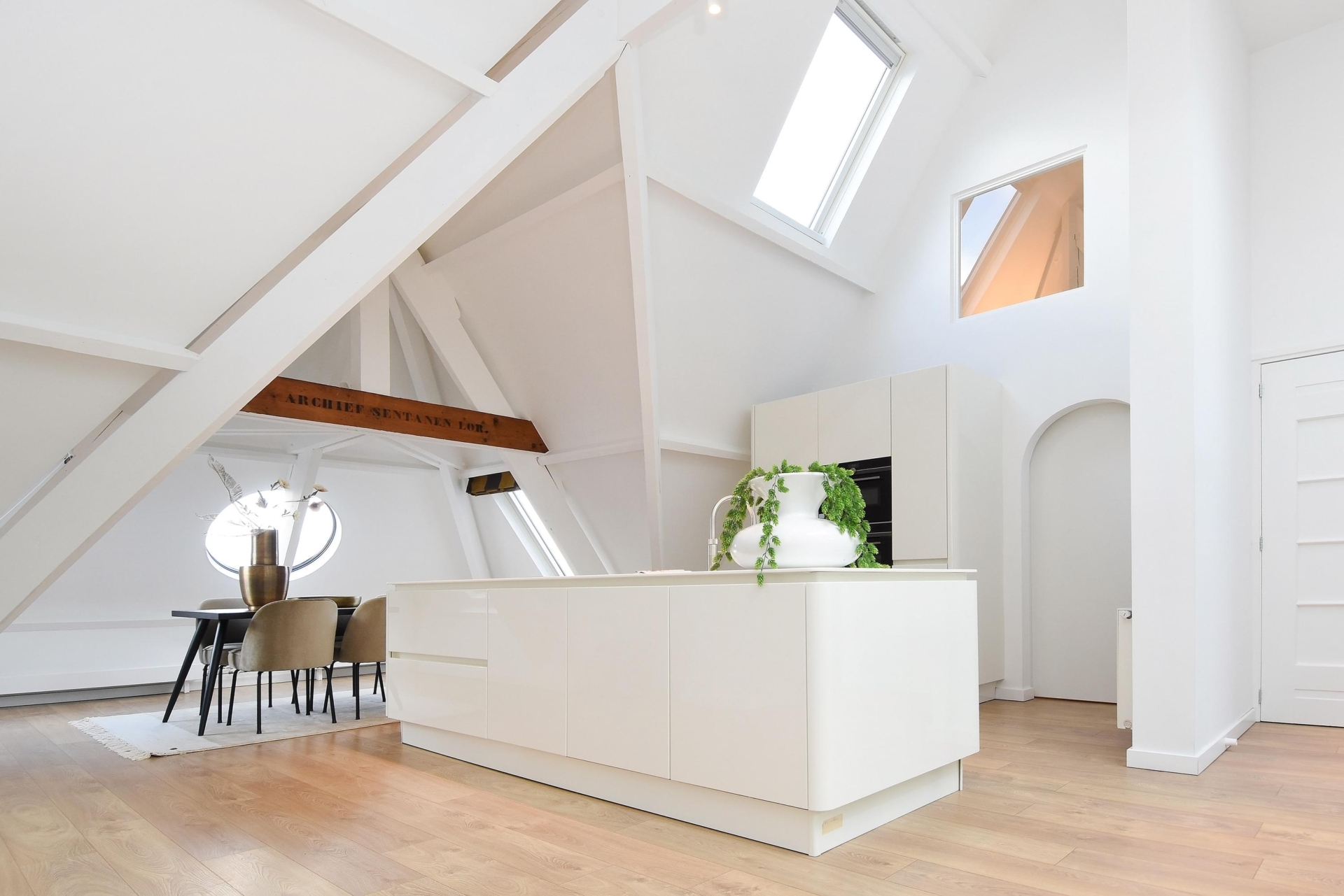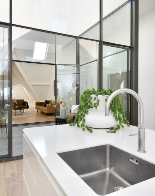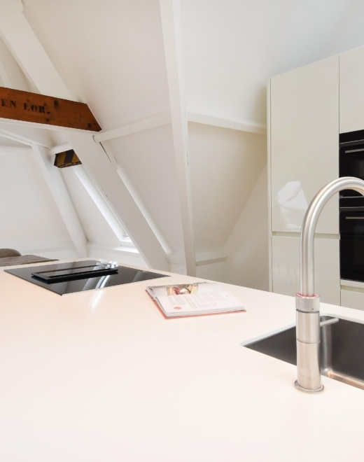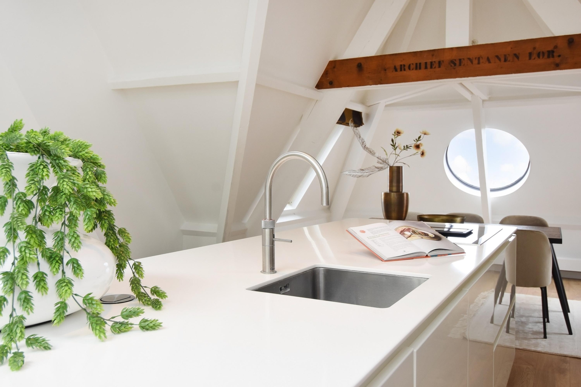the high ceilings, original beams, and numerous (roof) windows create a unique bright space with panoramic views over the hague. the next125 high-gloss kitchen (28 m²) with a freestanding cooking island featuring a corian countertop is equipped with siemens built-in appliances, including a dishwasher, downdraft induction cooktop, quooker, multifunctional oven, and microwave.