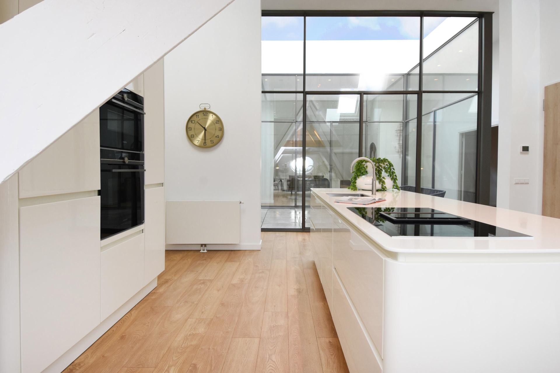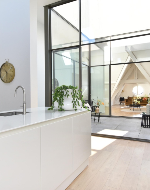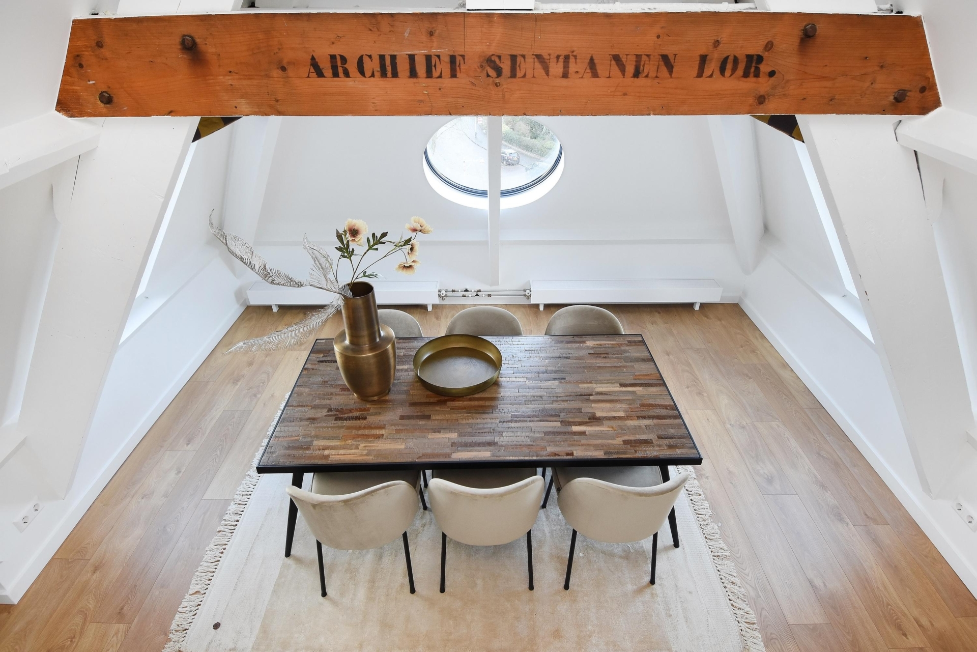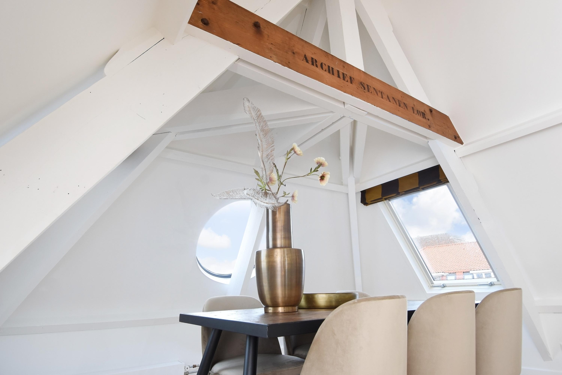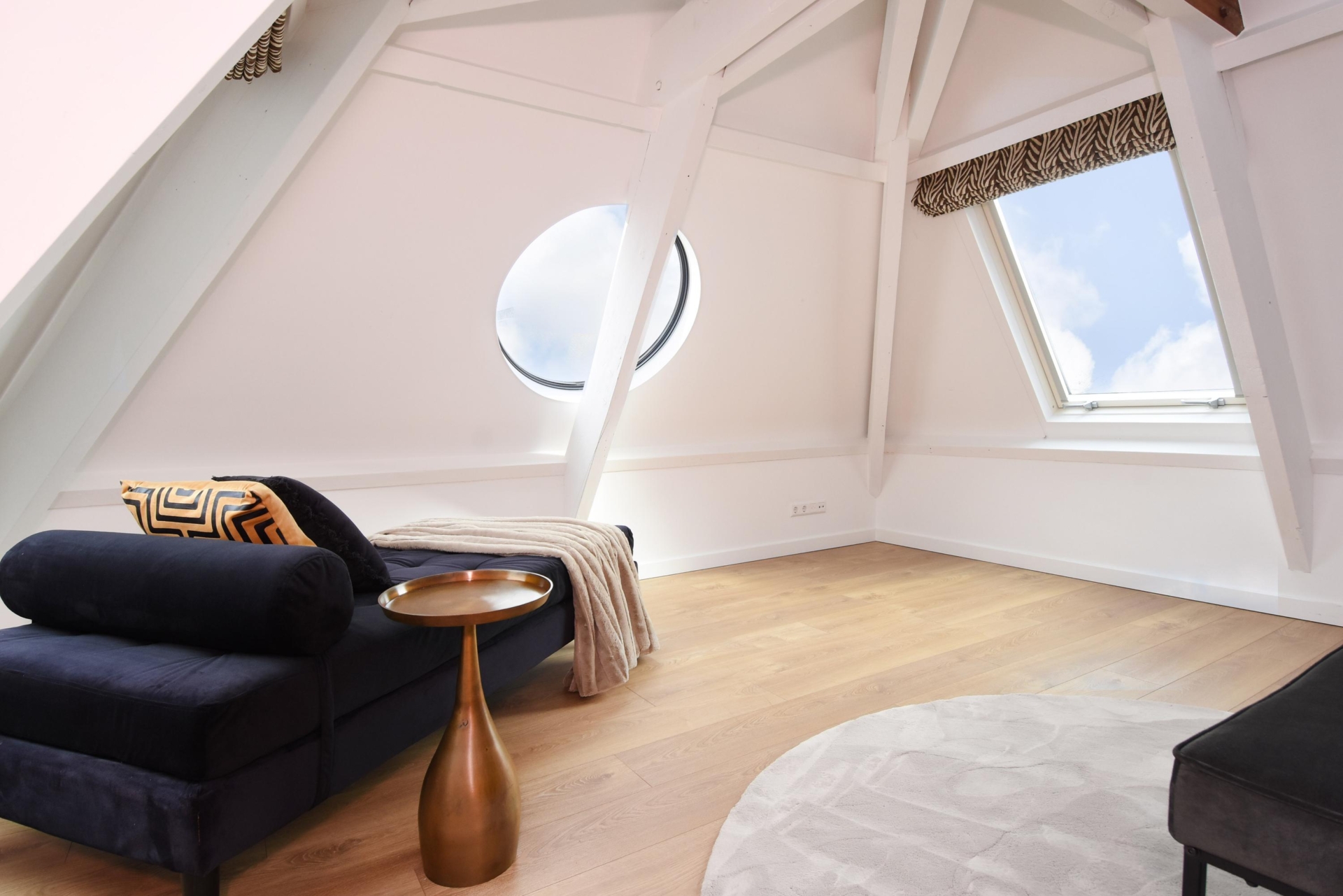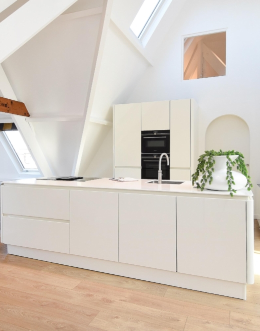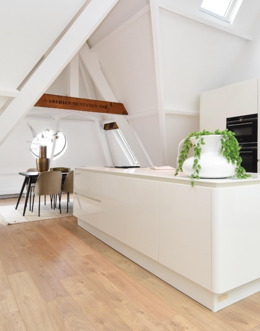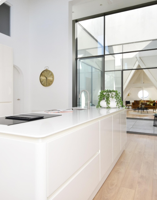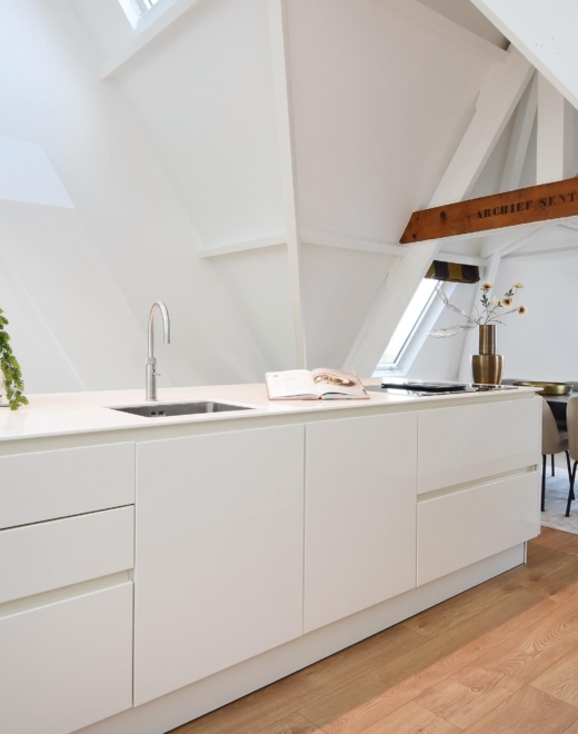 the high ceilings, original beams, and numerous (roof) windows create a unique bright space with panoramic views over the hague. the next125 high-gloss kitchen (28 m²) with a freestanding cooking island featuring a corian countertop is equipped with siemens built-in appliances, including a dishwasher, downdraft induction cooktop, quooker, multifunctional oven, and microwave.