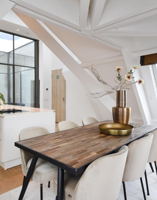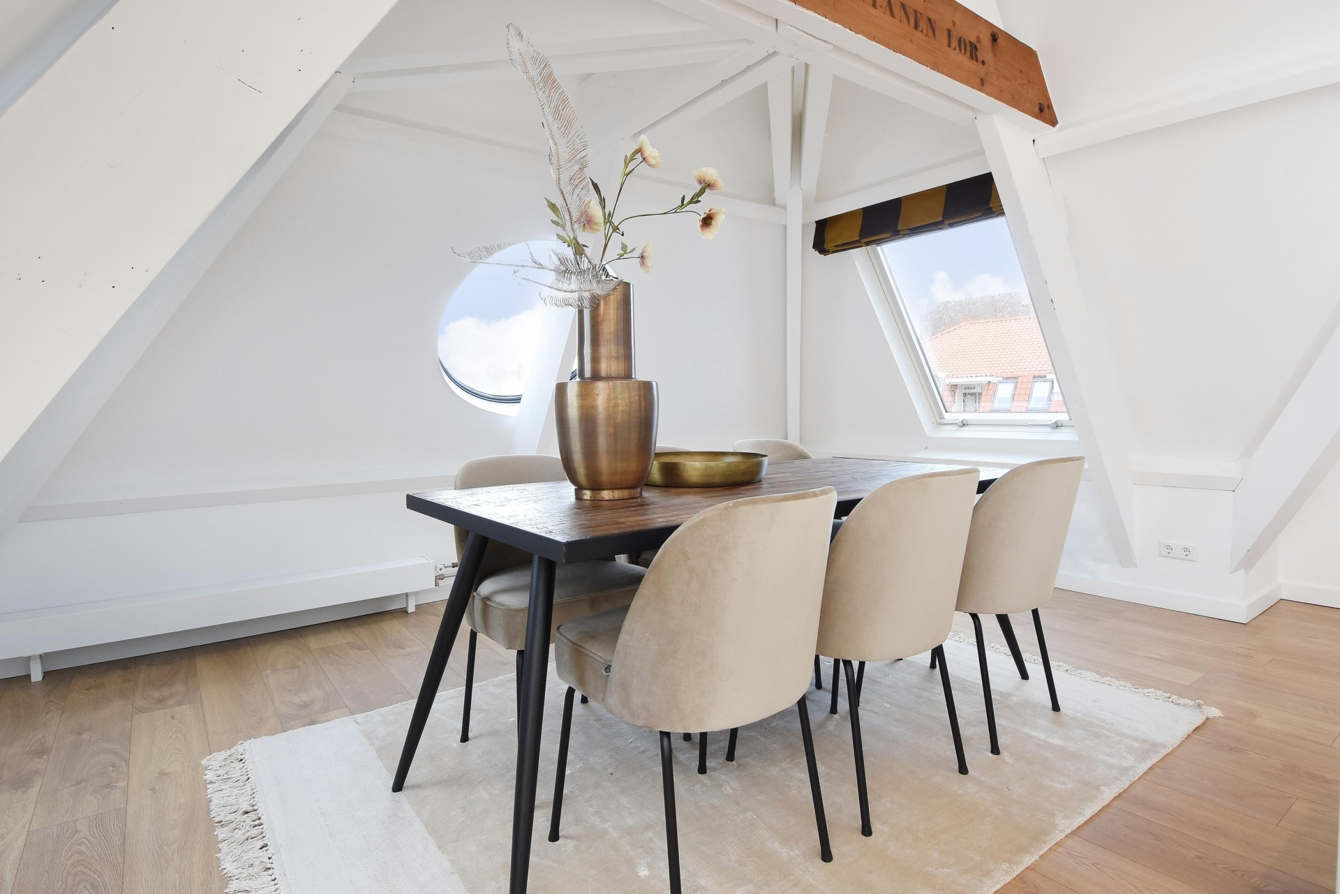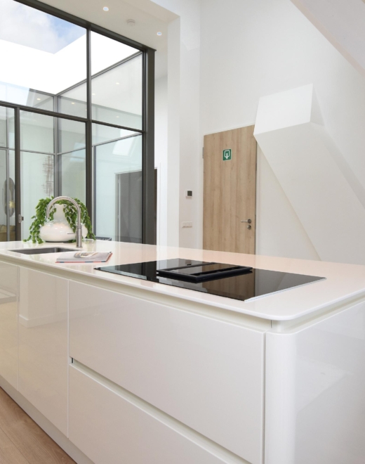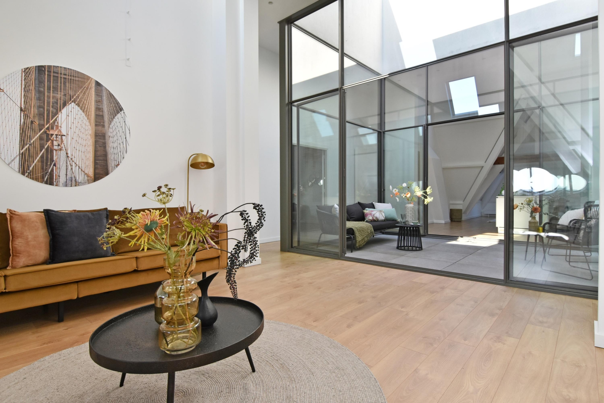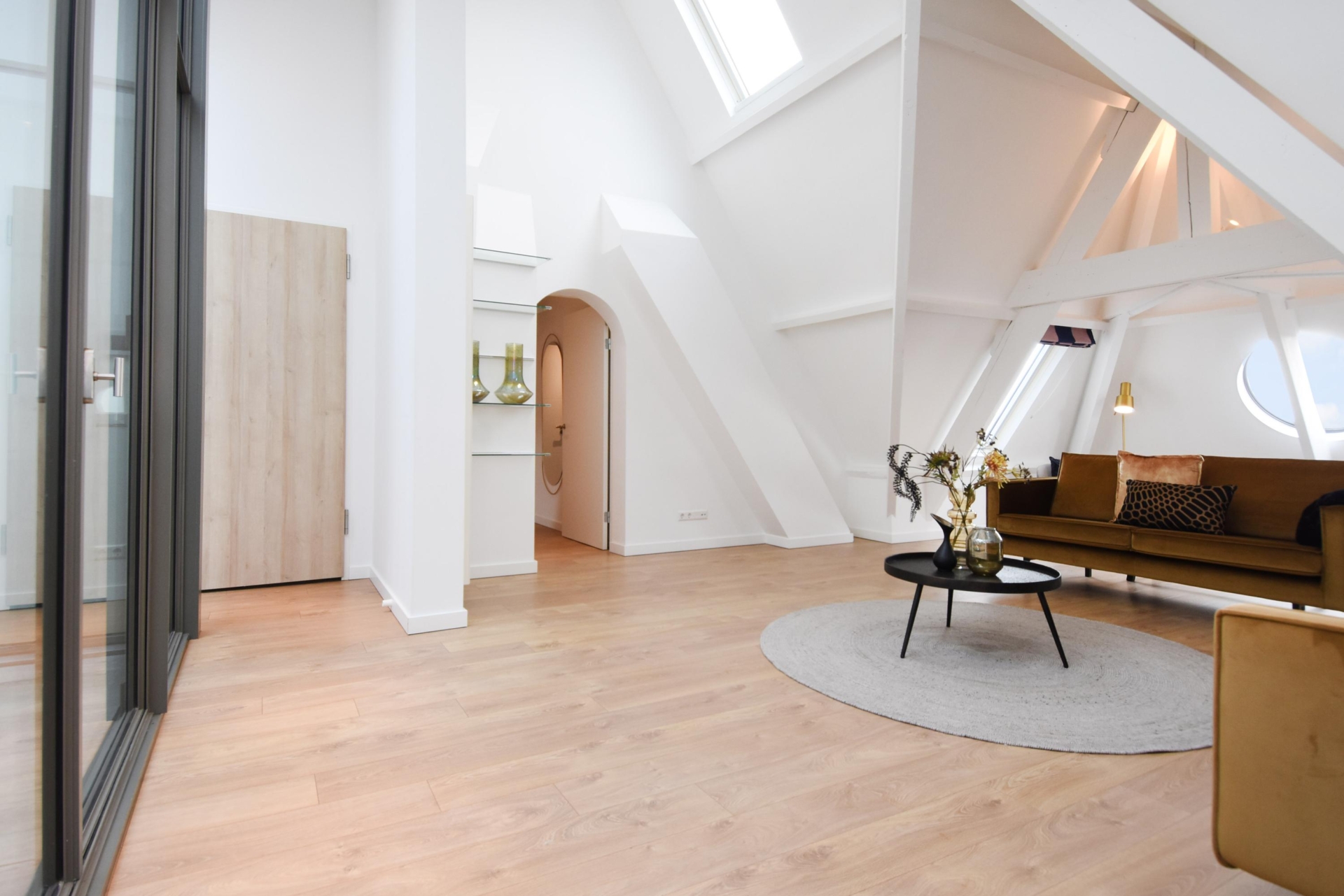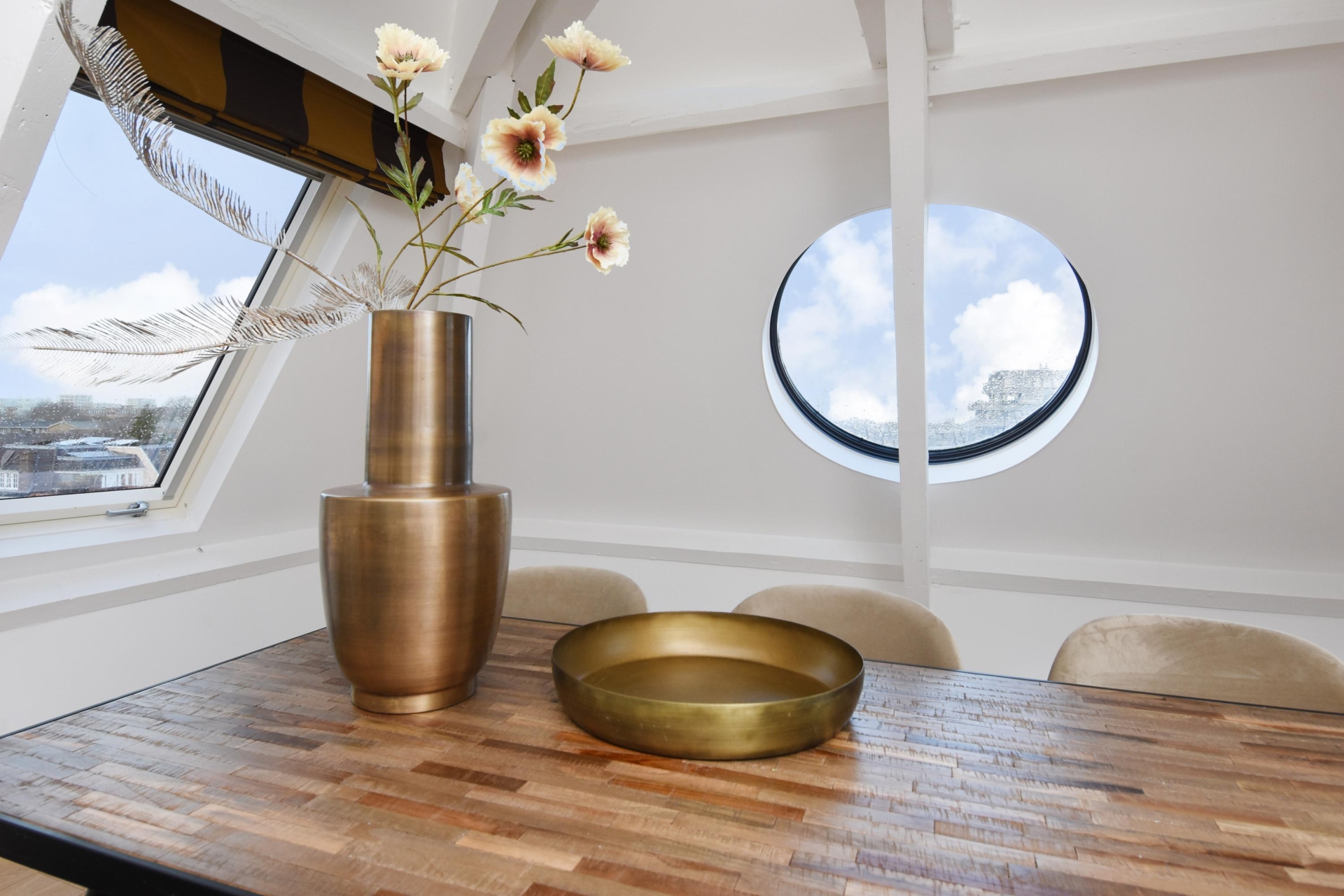 the high ceilings, original beams, and numerous (roof) windows create a unique bright space with panoramic views over the hague. the next125 high-gloss kitchen (28 m²) with a freestanding cooking island featuring a corian countertop is equipped with siemens built-in appliances, including a dishwasher, downdraft induction cooktop, quooker, multifunctional oven, and microwave.