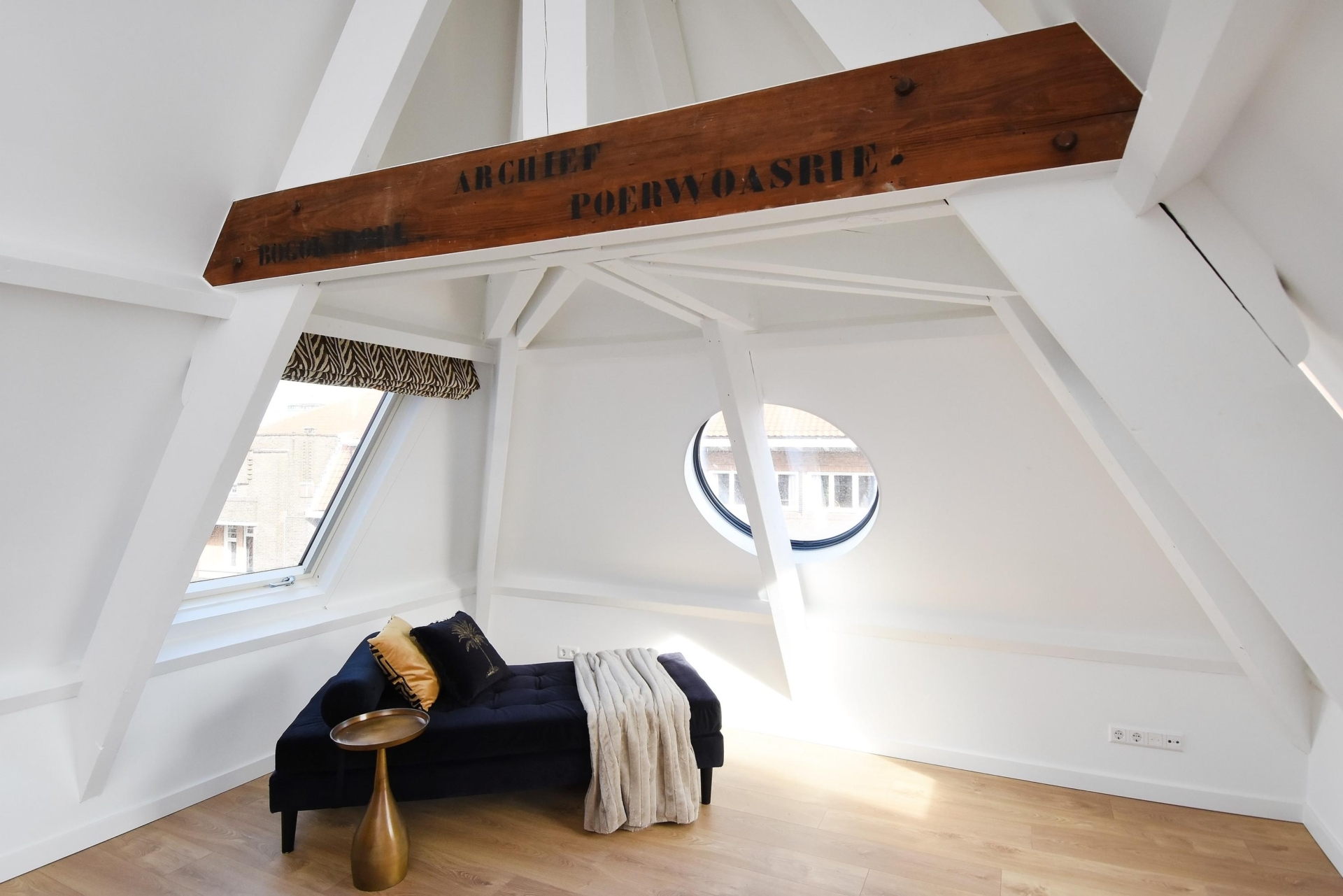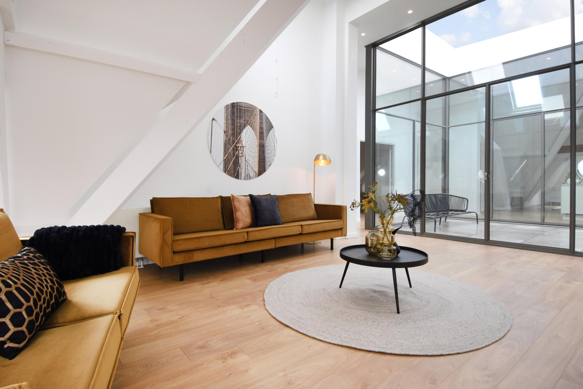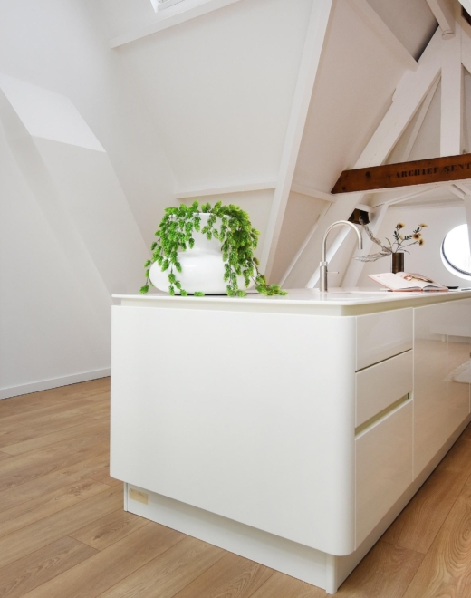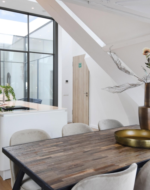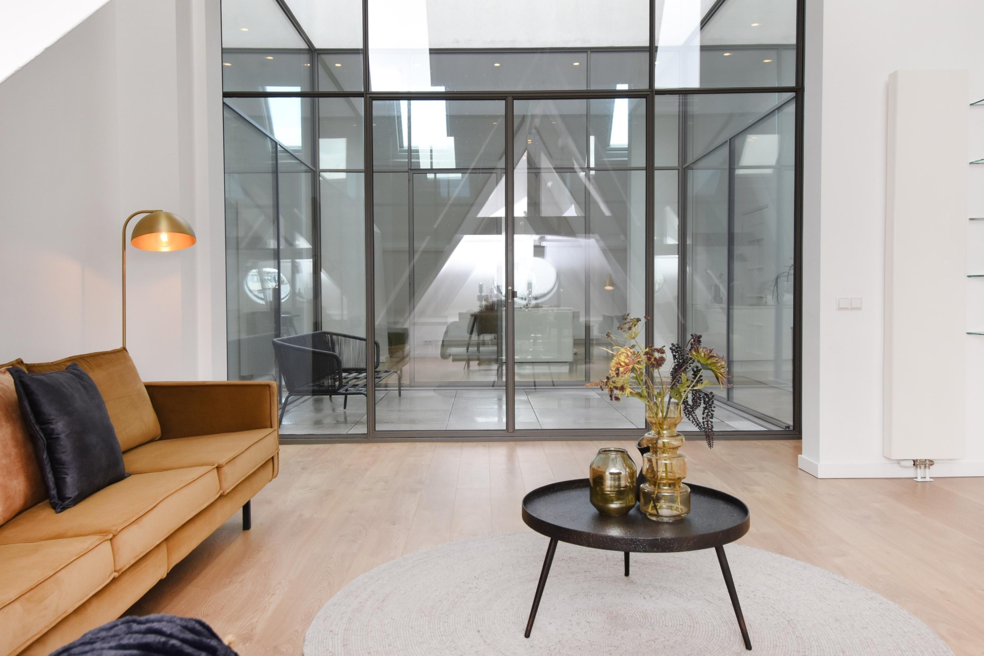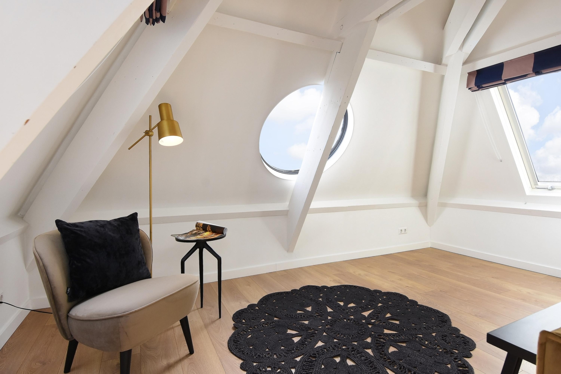 the high ceilings, original beams, and numerous (roof) windows create a unique bright space with panoramic views over the hague. the next125 high-gloss kitchen (28 m²) with a freestanding cooking island featuring a corian countertop is equipped with siemens built-in appliances, including a dishwasher, downdraft induction cooktop, quooker, multifunctional oven, and microwave.