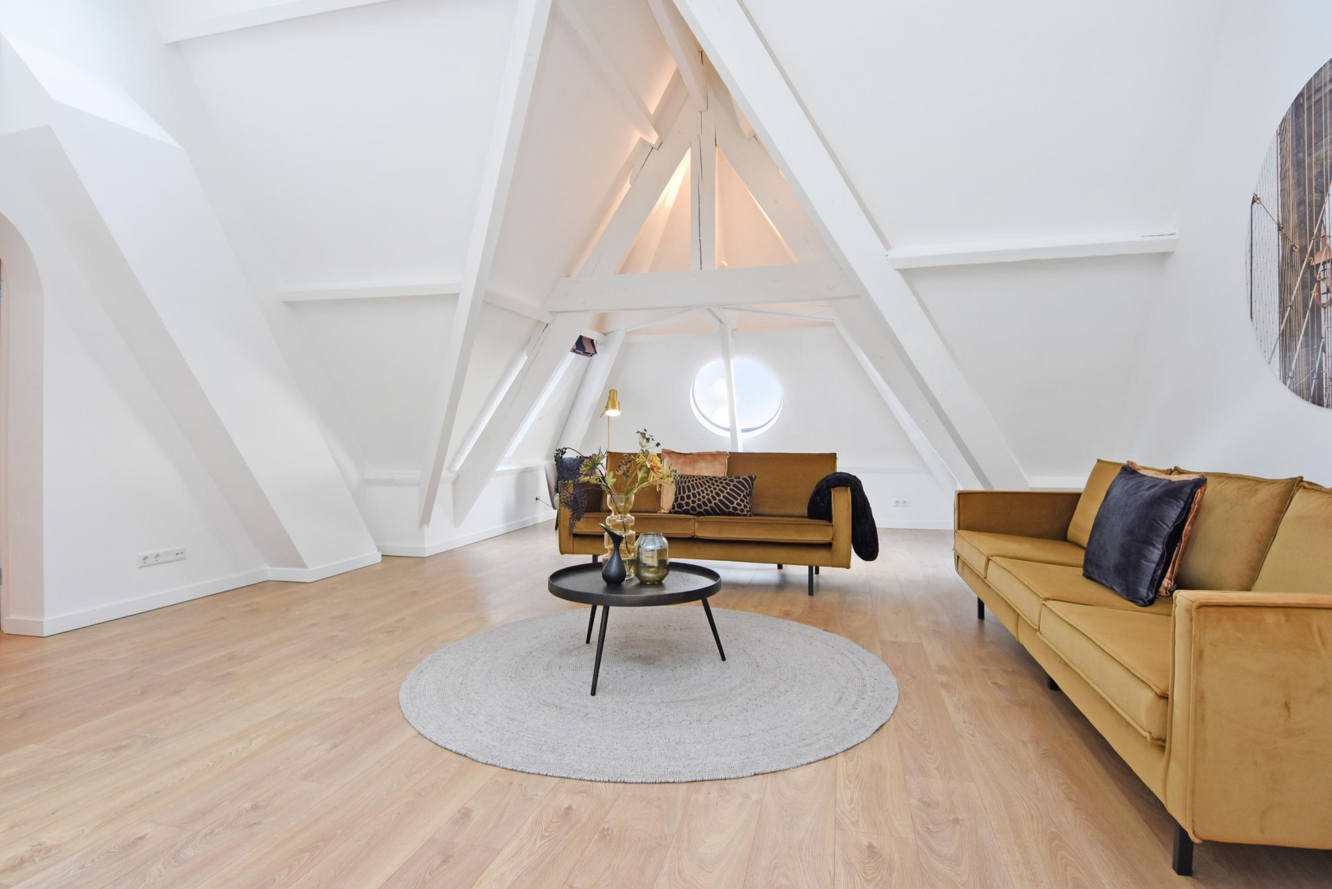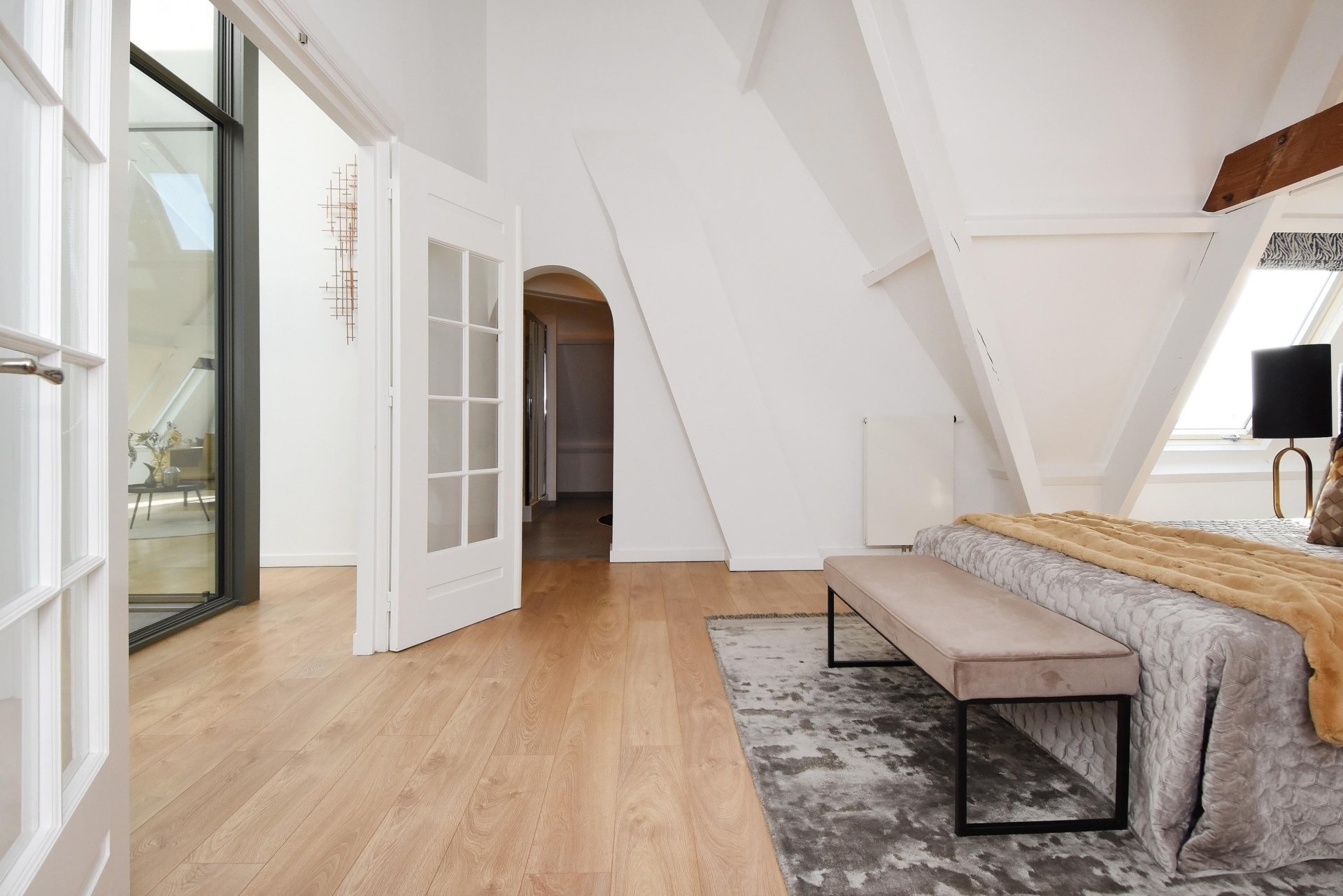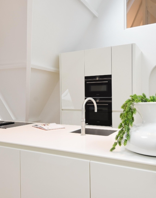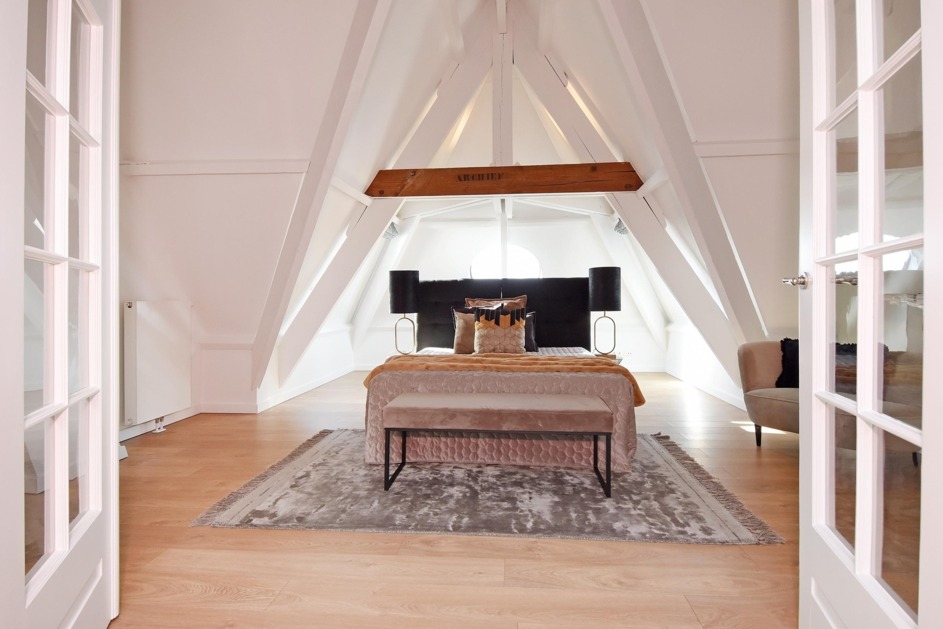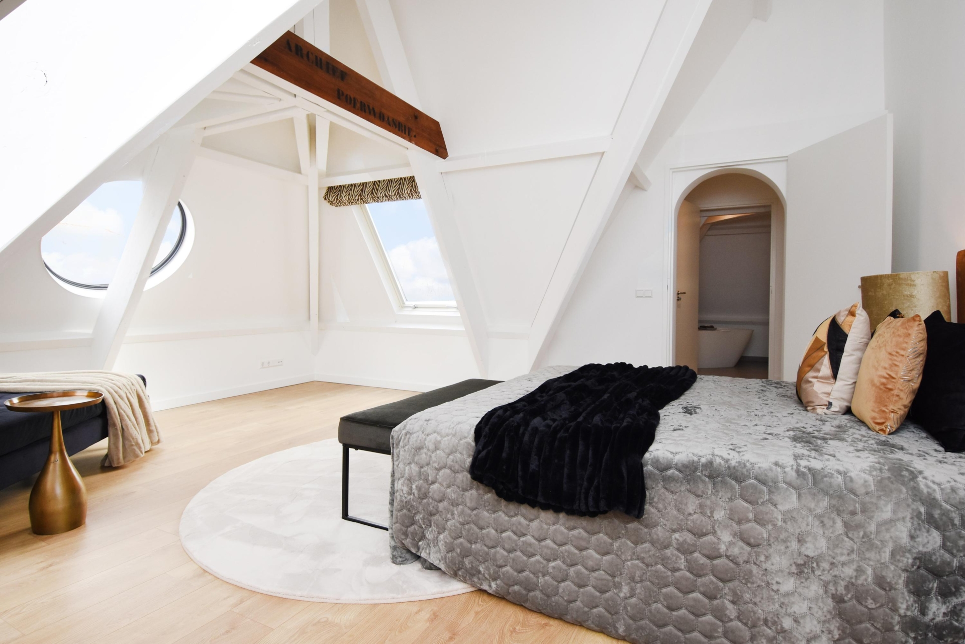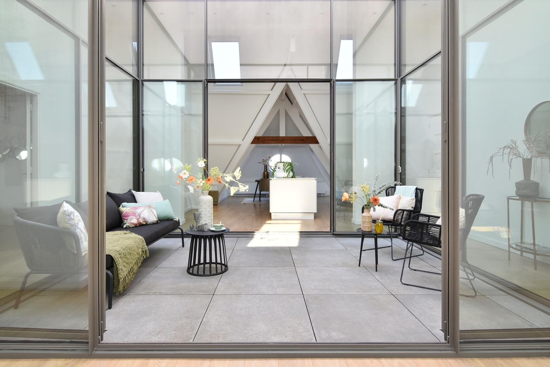 the high ceilings, original beams, and numerous (roof) windows create a unique bright space with panoramic views over the hague. the next125 high-gloss kitchen (28 m²) with a freestanding cooking island featuring a corian countertop is equipped with siemens built-in appliances, including a dishwasher, downdraft induction cooktop, quooker, multifunctional oven, and microwave.