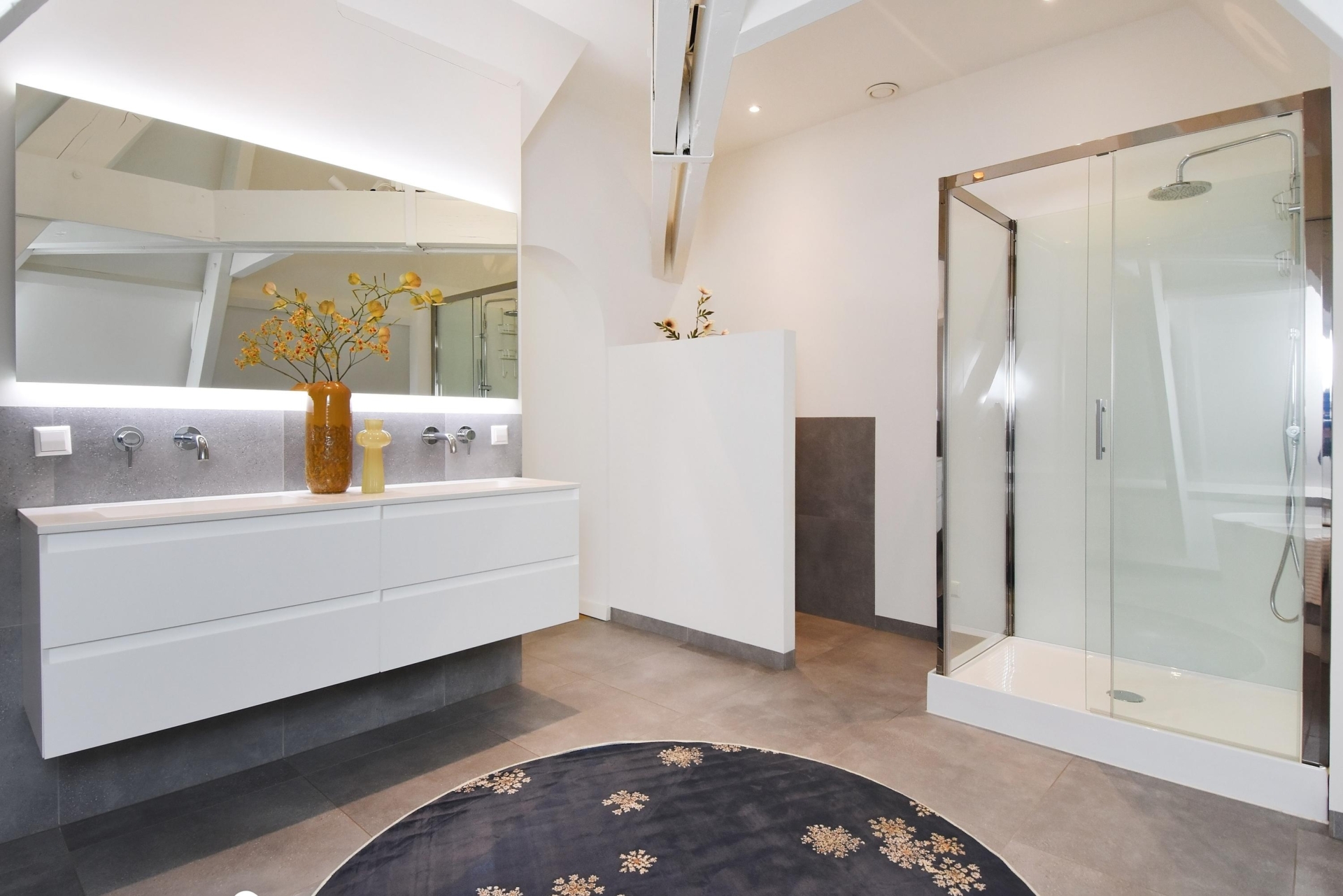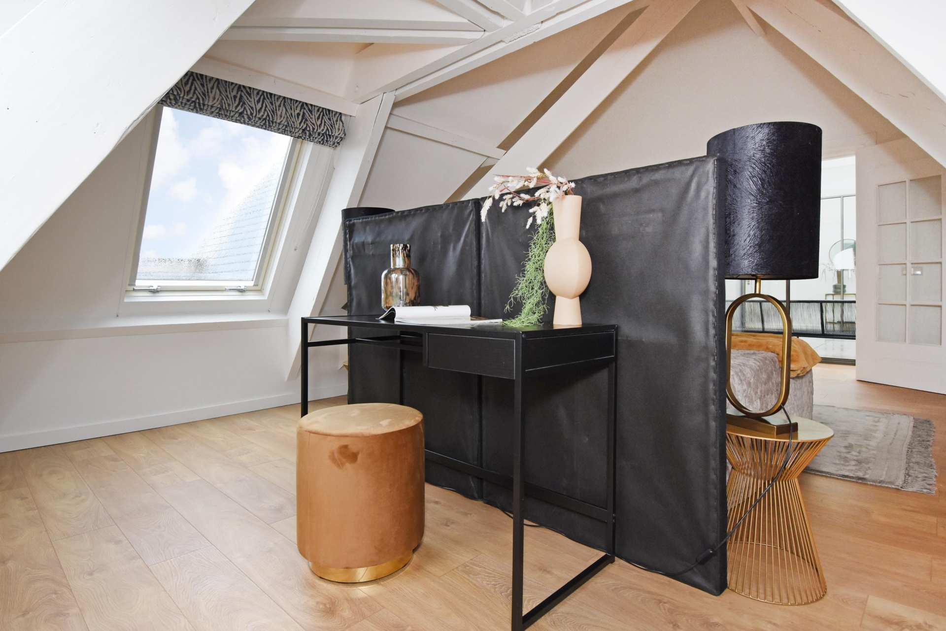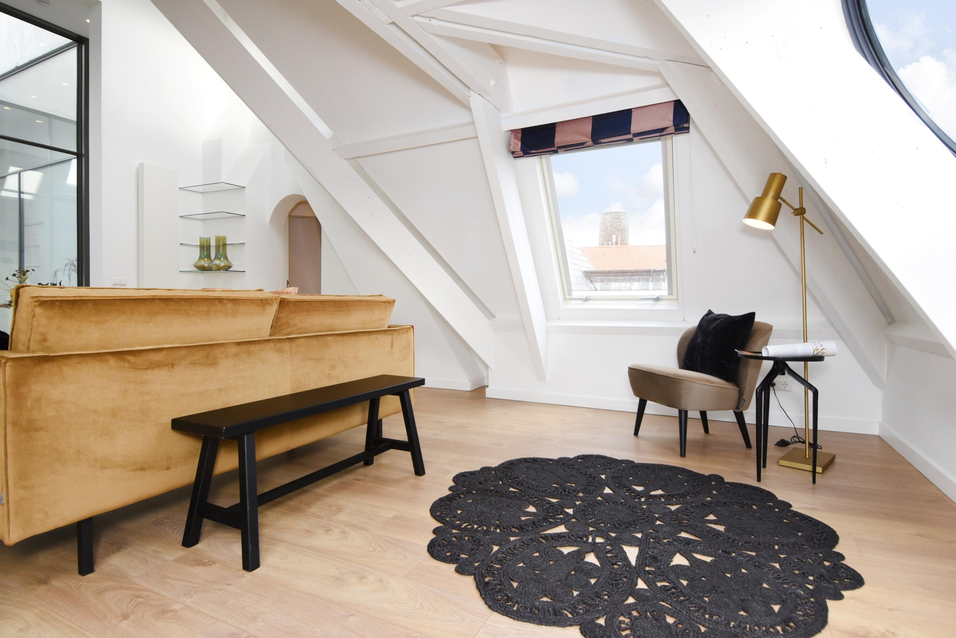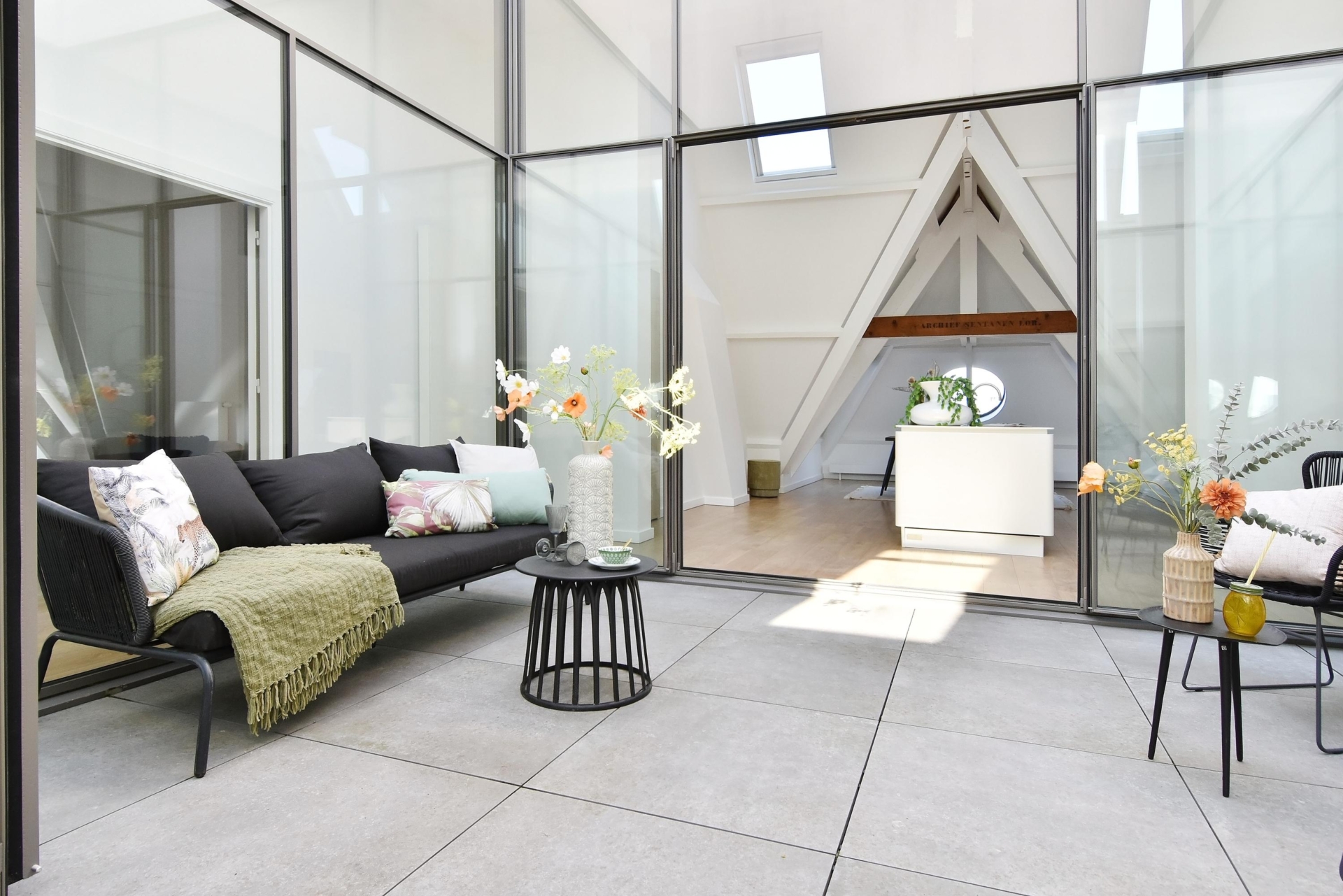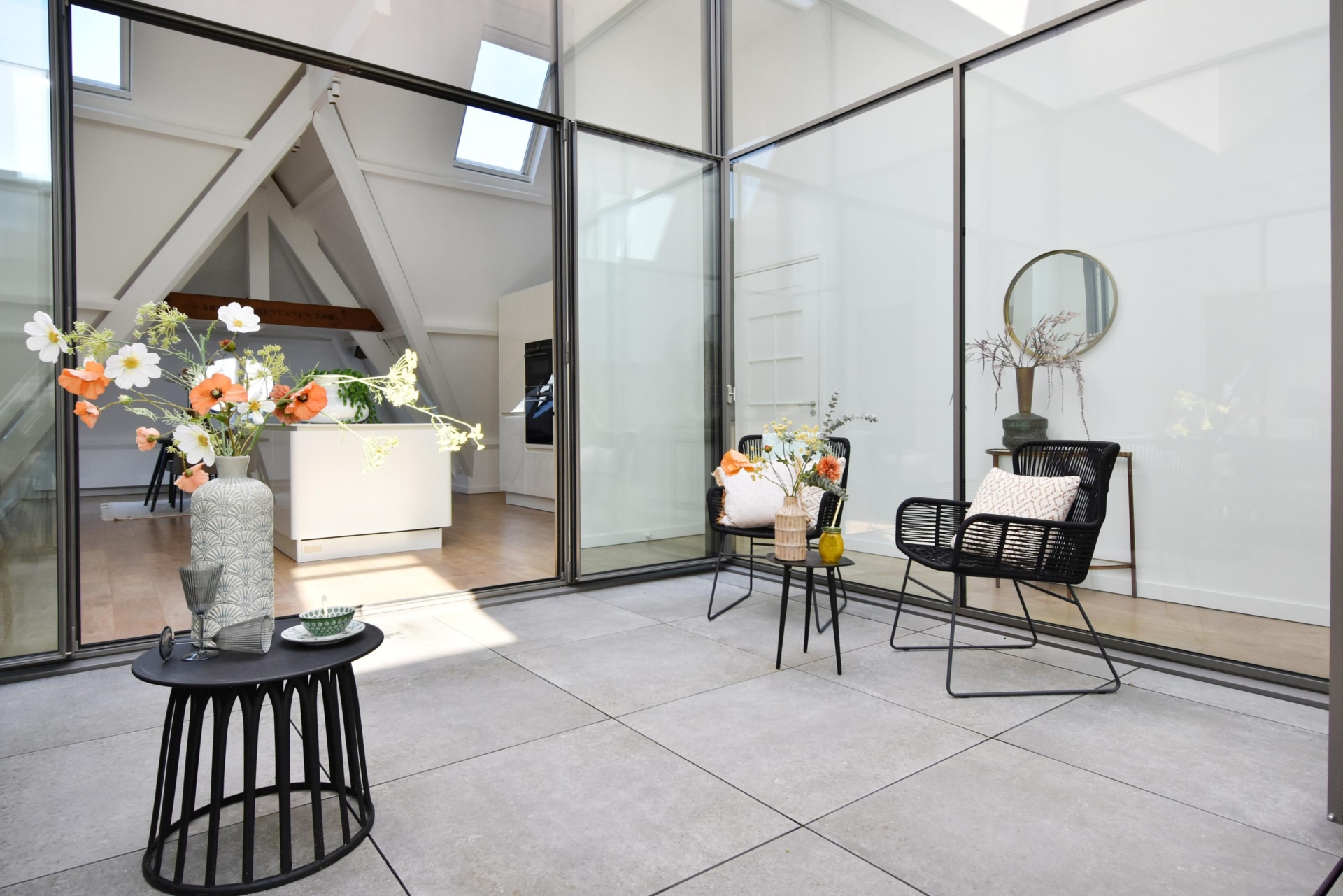 the high ceilings, original beams, and numerous (roof) windows create a unique bright space with panoramic views over the hague. the next125 high-gloss kitchen (28 m²) with a freestanding cooking island featuring a corian countertop is equipped with siemens built-in appliances, including a dishwasher, downdraft induction cooktop, quooker, multifunctional oven, and microwave.