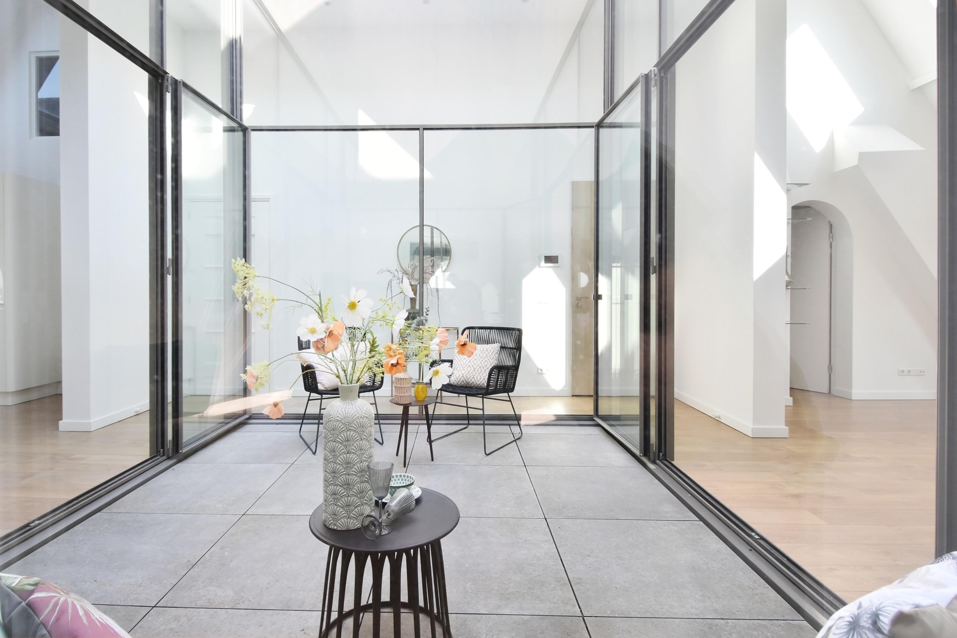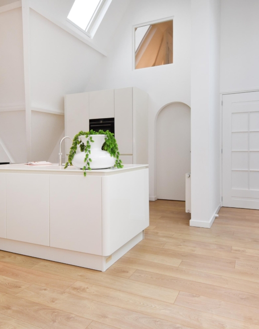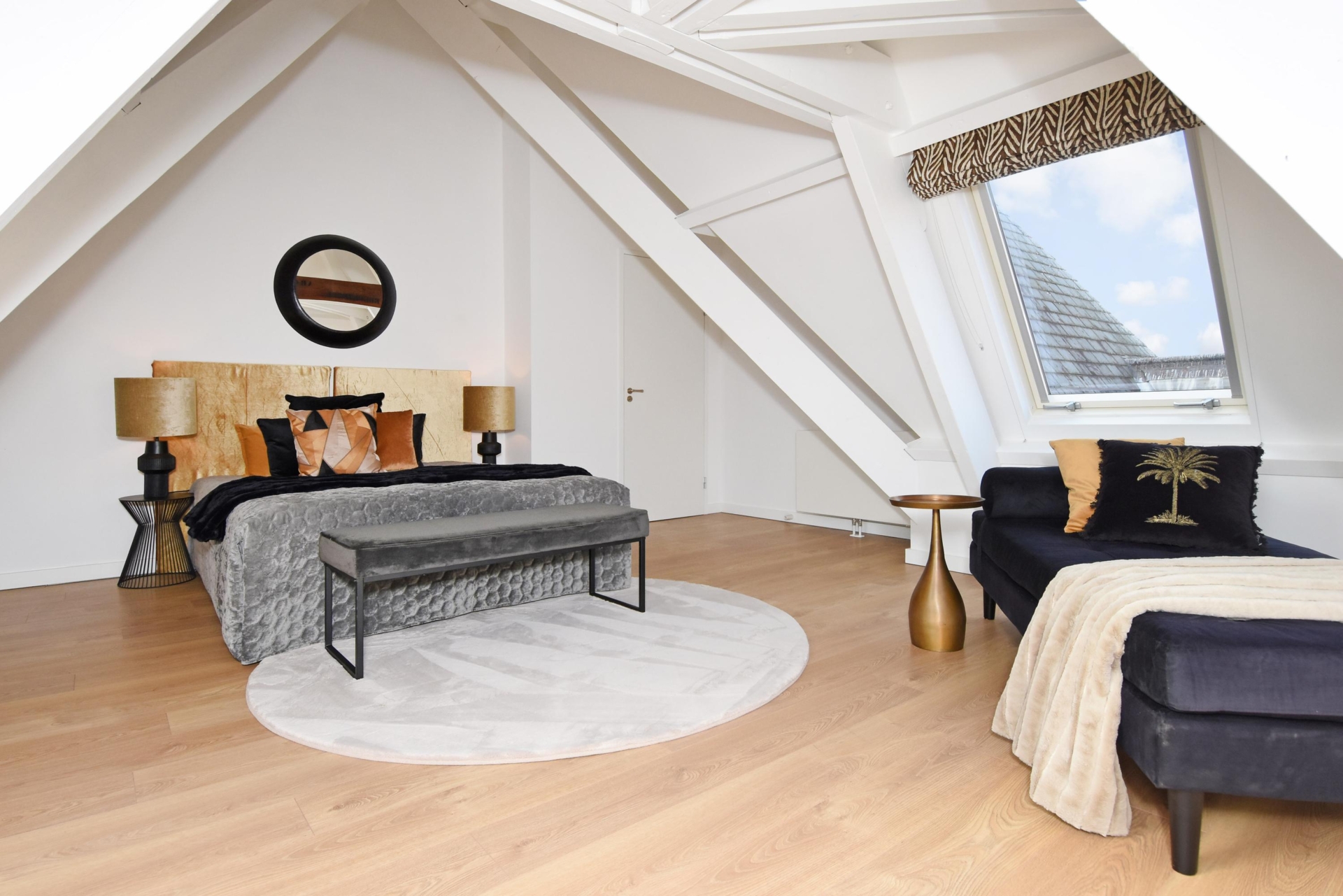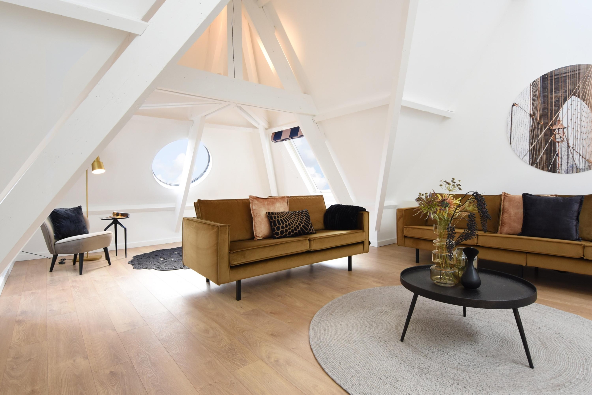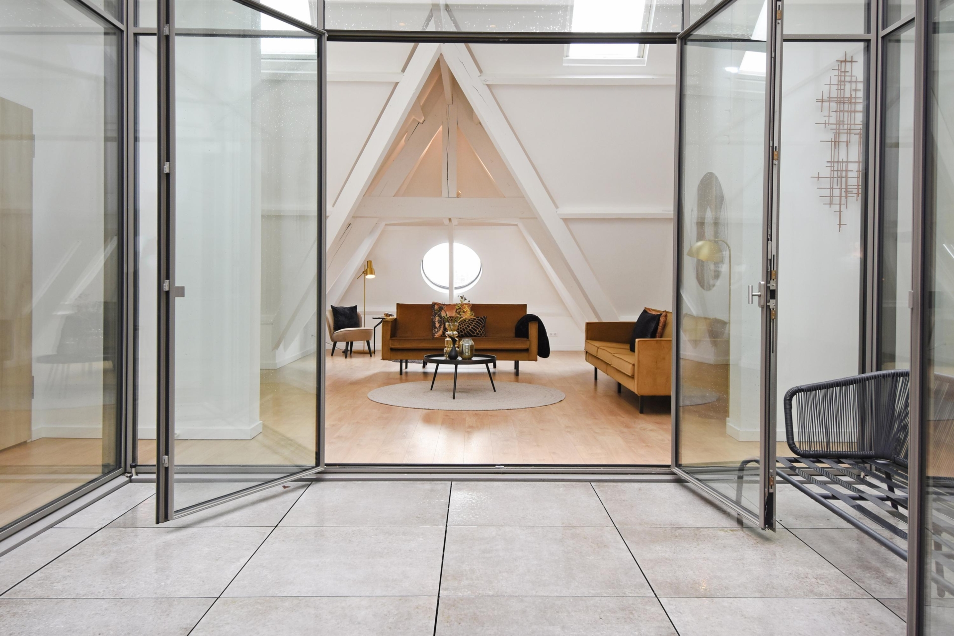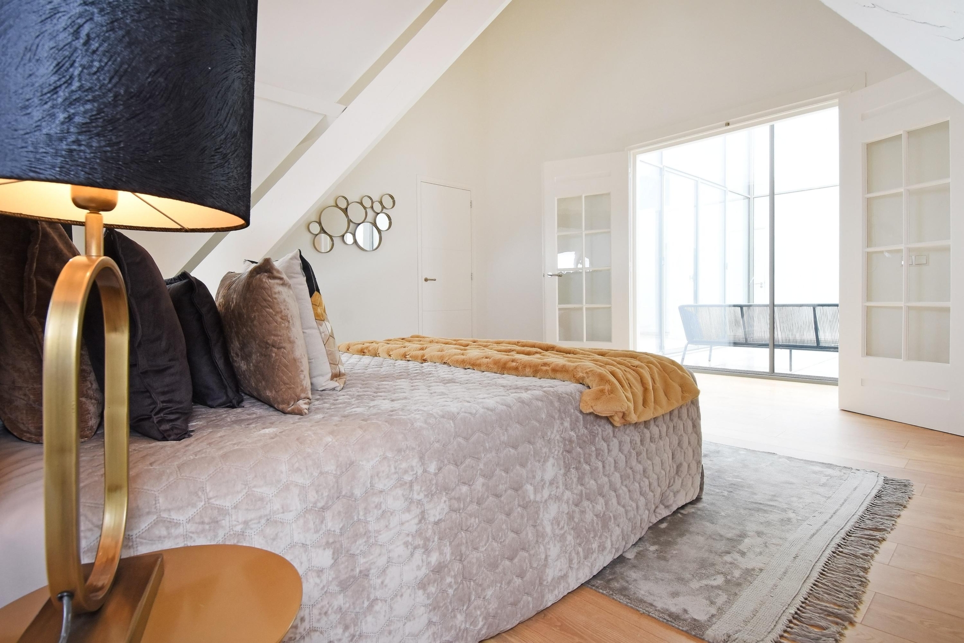 the high ceilings, original beams, and numerous (roof) windows create a unique bright space with panoramic views over the hague. the next125 high-gloss kitchen (28 m²) with a freestanding cooking island featuring a corian countertop is equipped with siemens built-in appliances, including a dishwasher, downdraft induction cooktop, quooker, multifunctional oven, and microwave.
