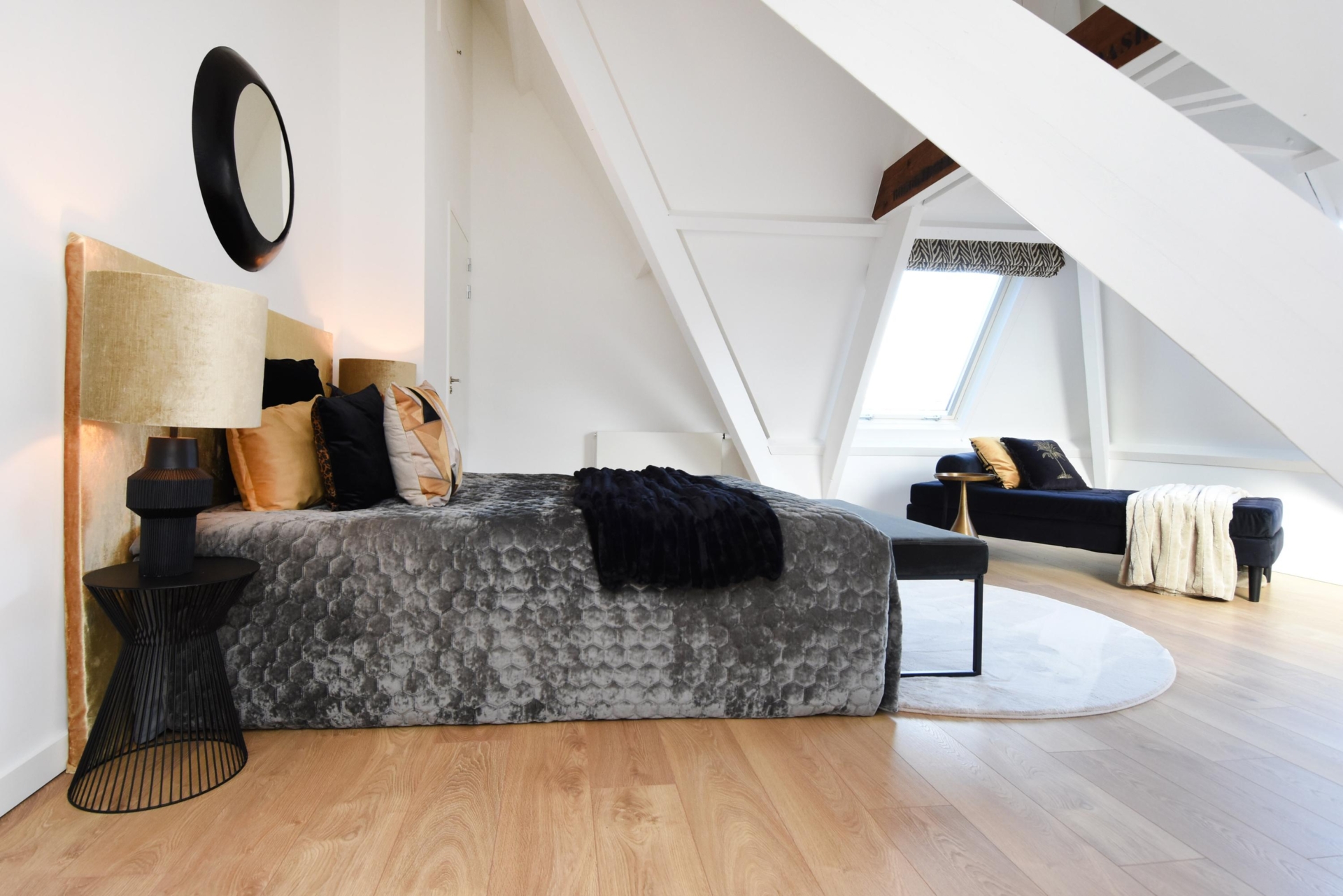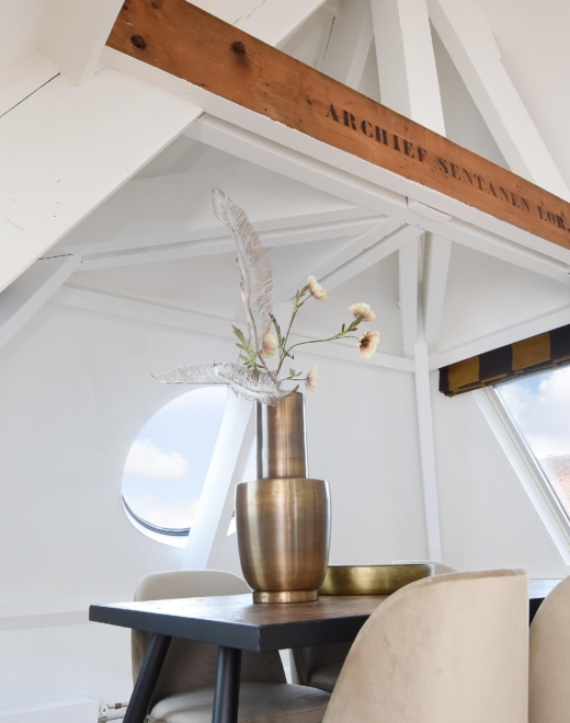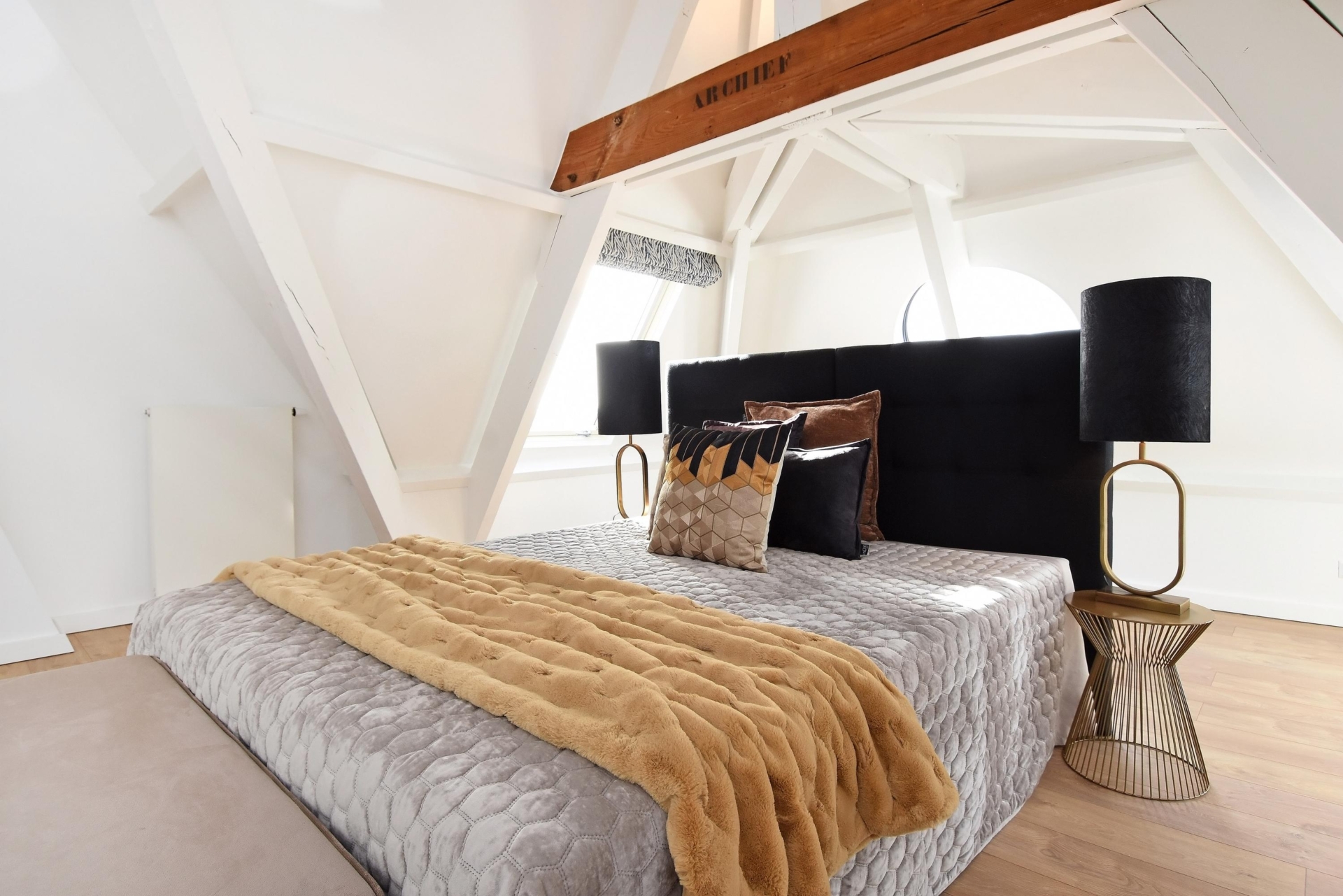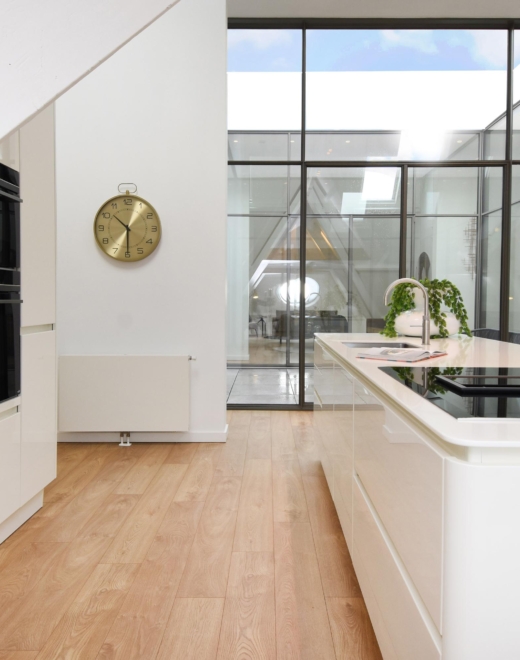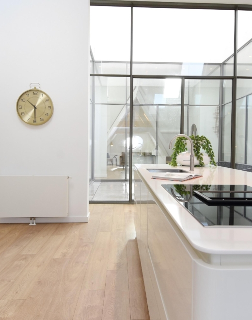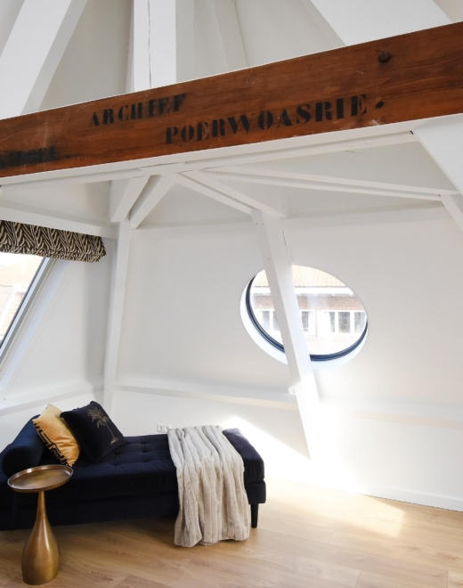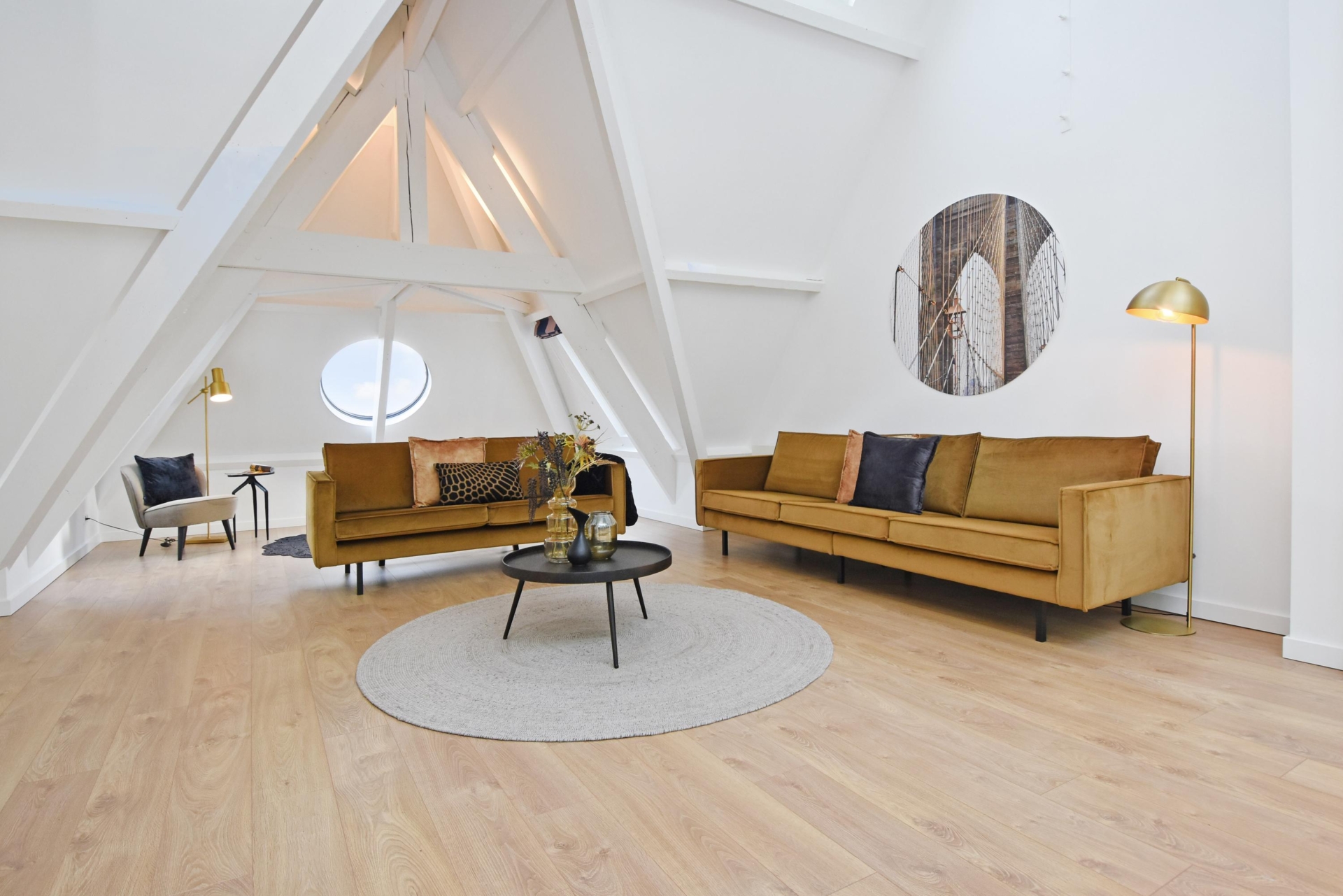 the high ceilings, original beams, and numerous (roof) windows create a unique bright space with panoramic views over the hague. the next125 high-gloss kitchen (28 m²) with a freestanding cooking island featuring a corian countertop is equipped with siemens built-in appliances, including a dishwasher, downdraft induction cooktop, quooker, multifunctional oven, and microwave.