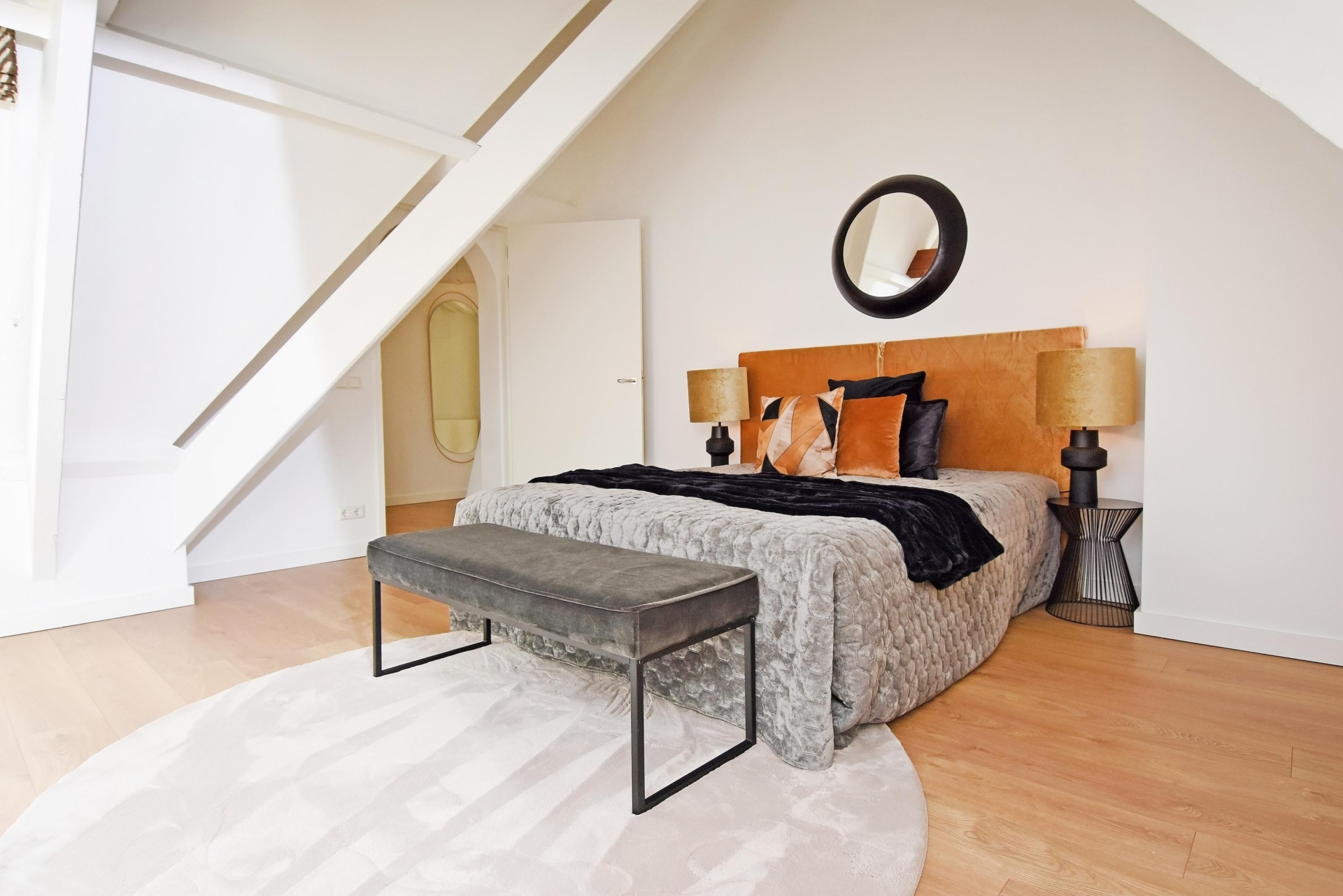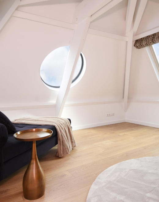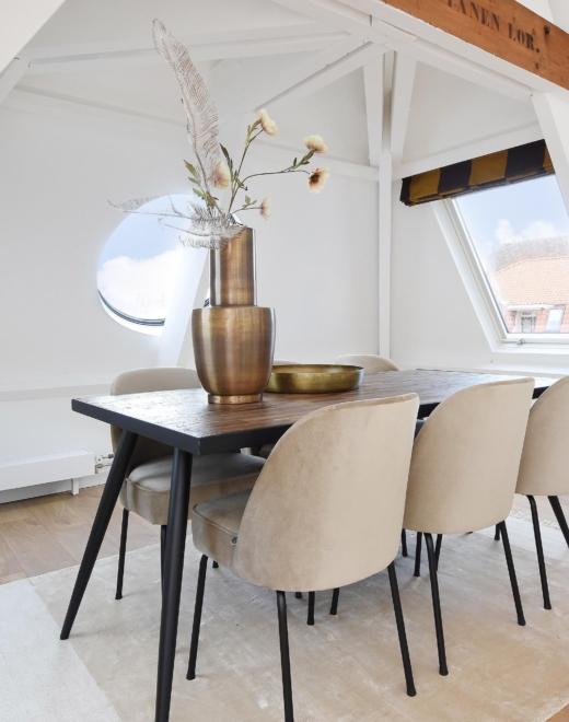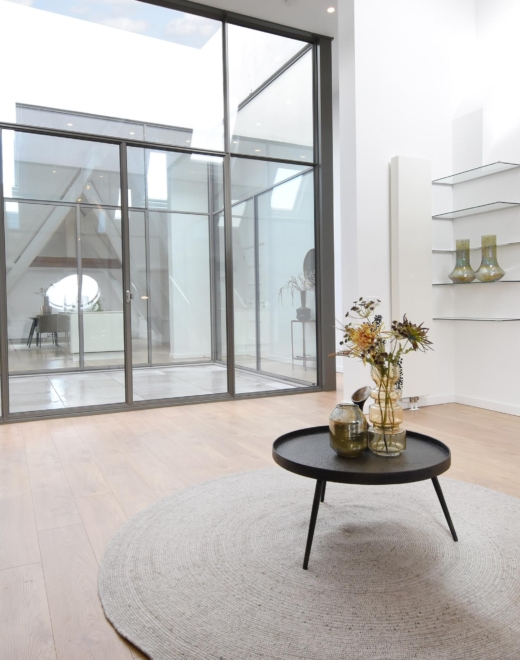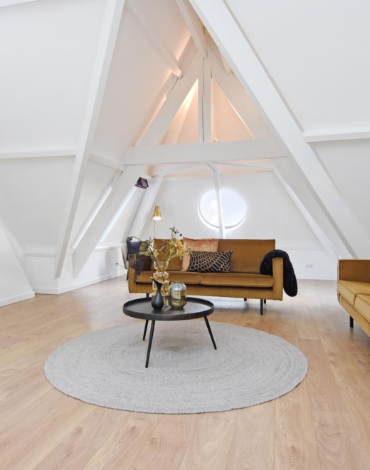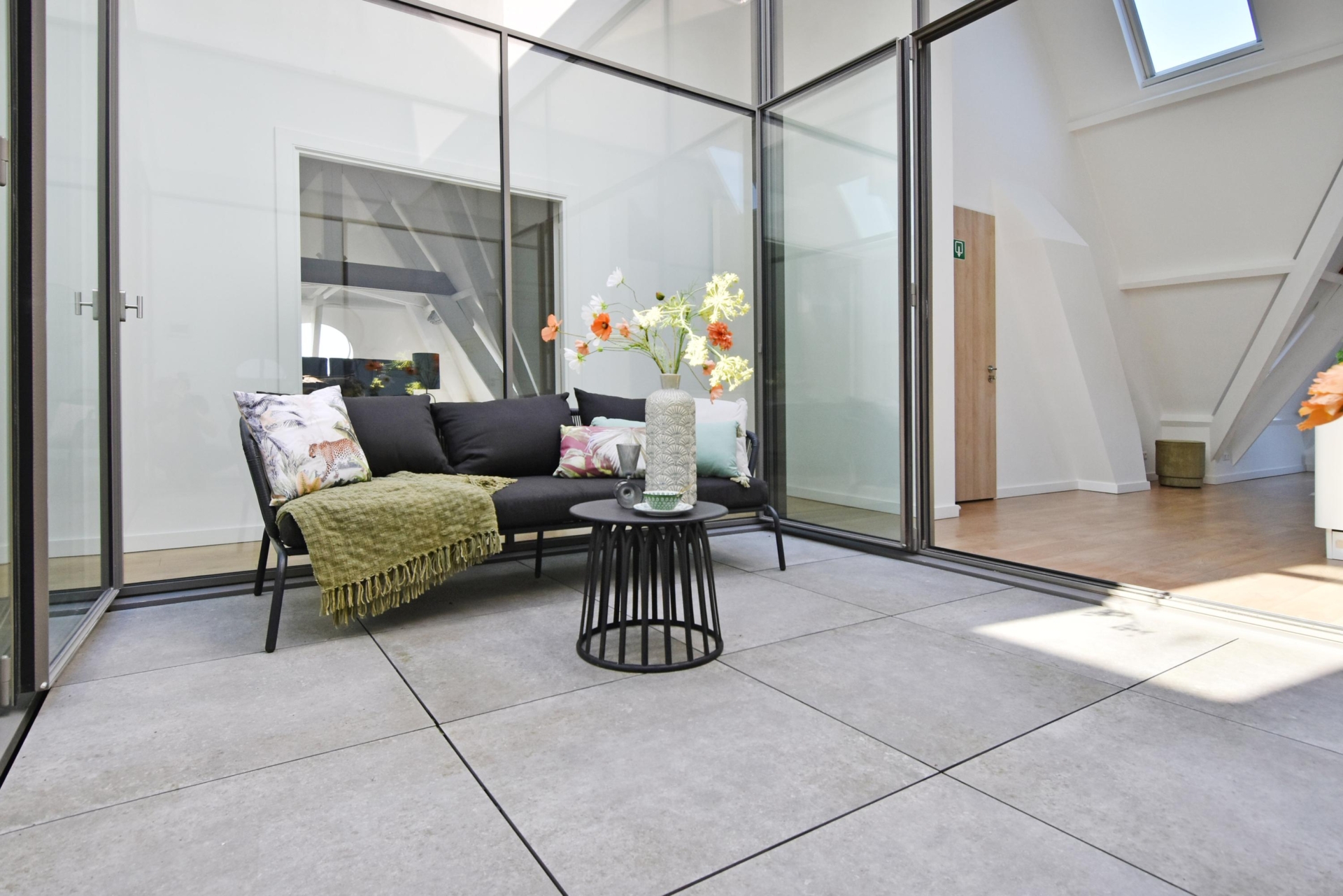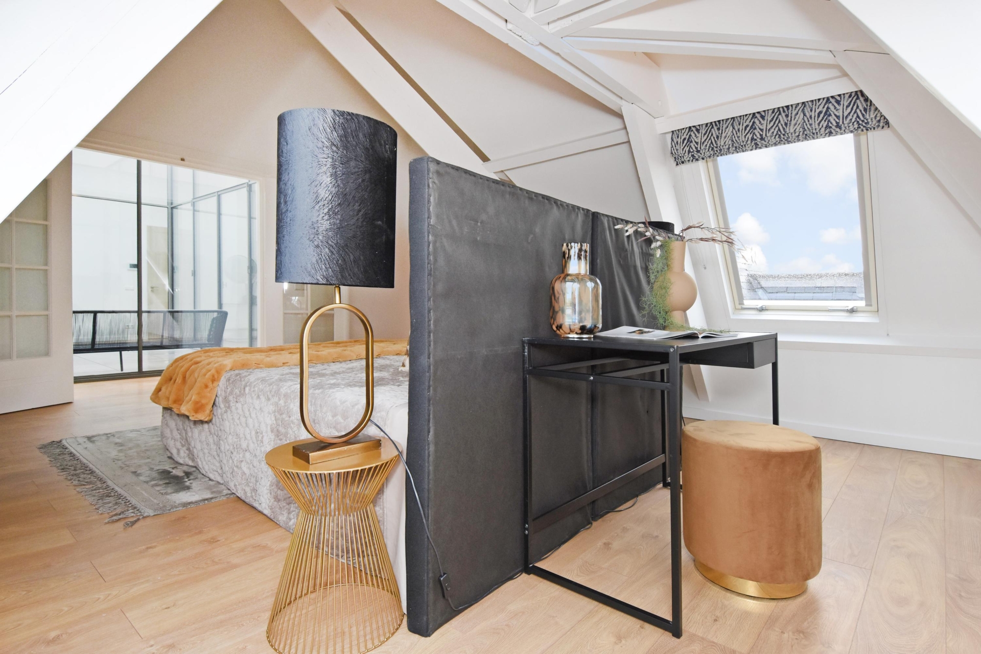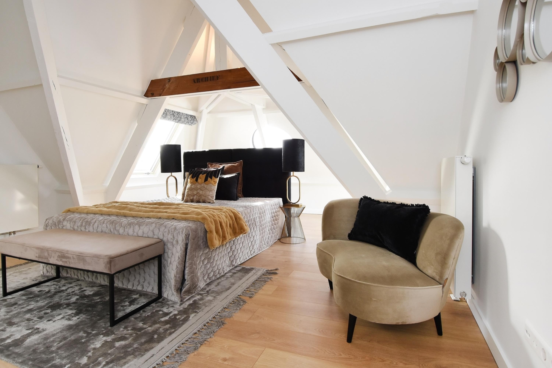 the high ceilings, original beams, and numerous (roof) windows create a unique bright space with panoramic views over the hague. the next125 high-gloss kitchen (28 m²) with a freestanding cooking island featuring a corian countertop is equipped with siemens built-in appliances, including a dishwasher, downdraft induction cooktop, quooker, multifunctional oven, and microwave.