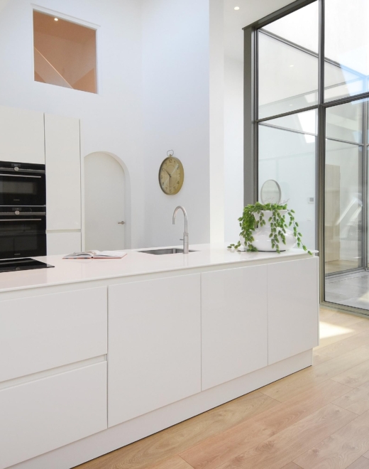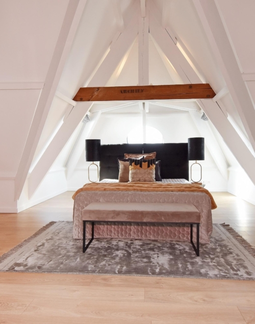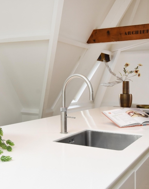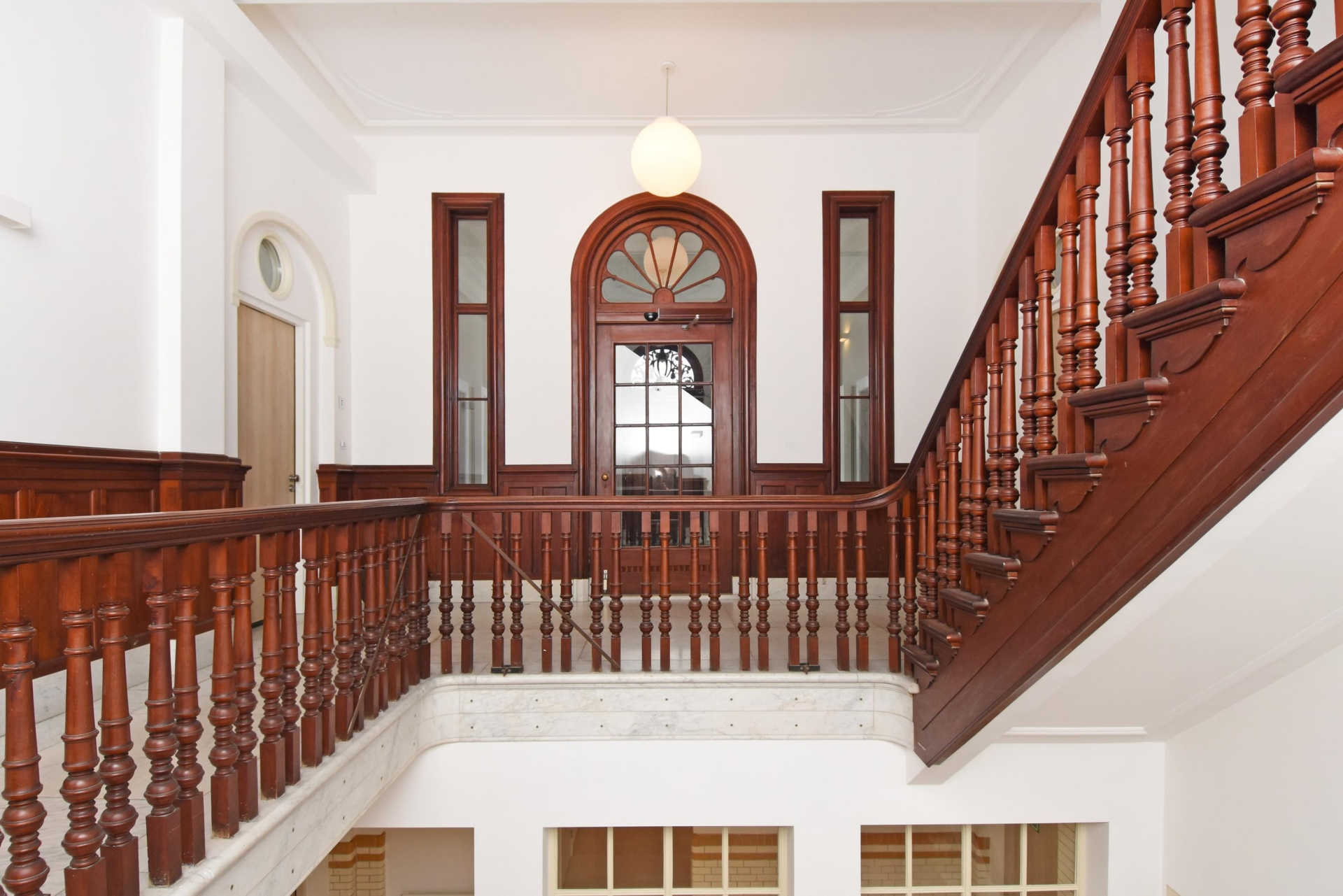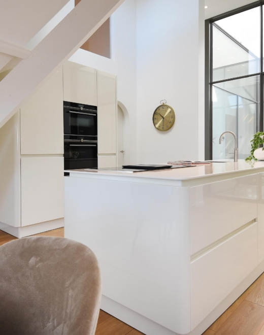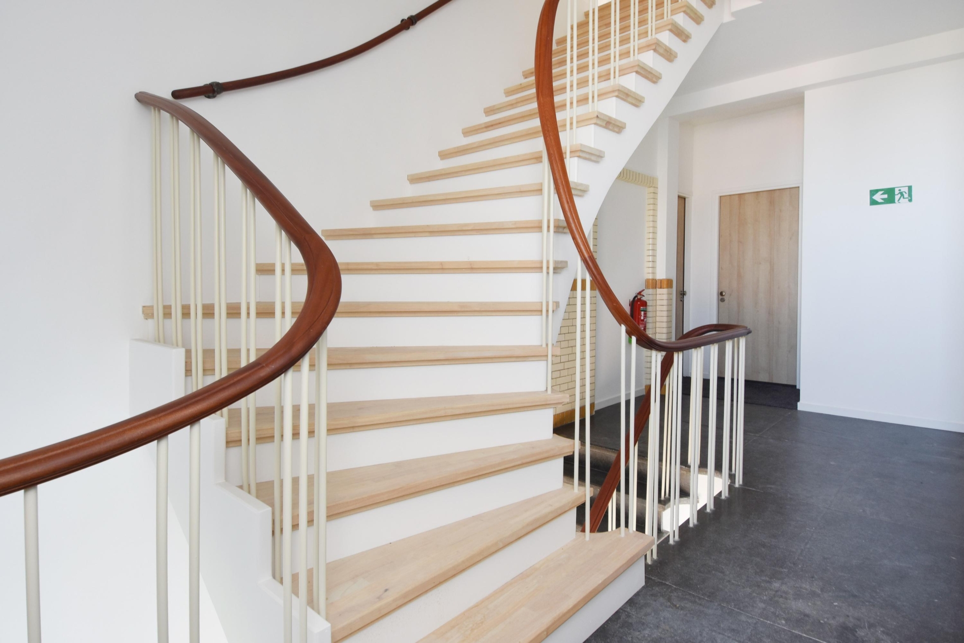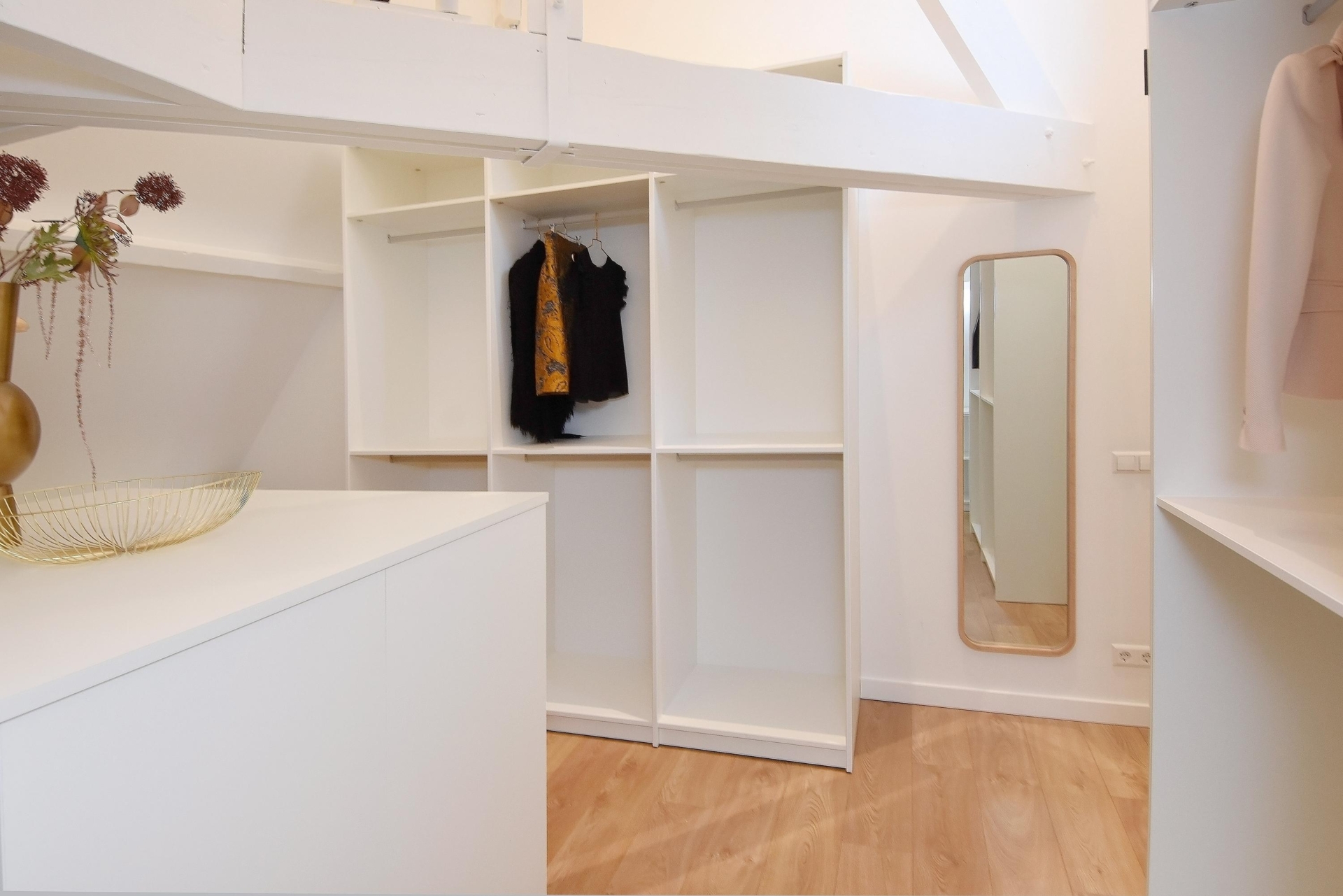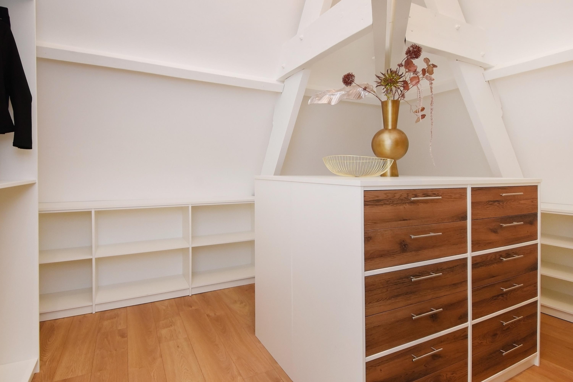 the high ceilings, original beams, and numerous (roof) windows create a unique bright space with panoramic views over the hague. the next125 high-gloss kitchen (28 m²) with a freestanding cooking island featuring a corian countertop is equipped with siemens built-in appliances, including a dishwasher, downdraft induction cooktop, quooker, multifunctional oven, and microwave.