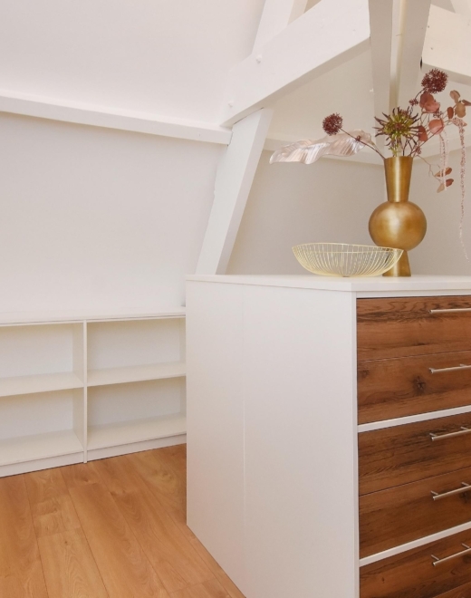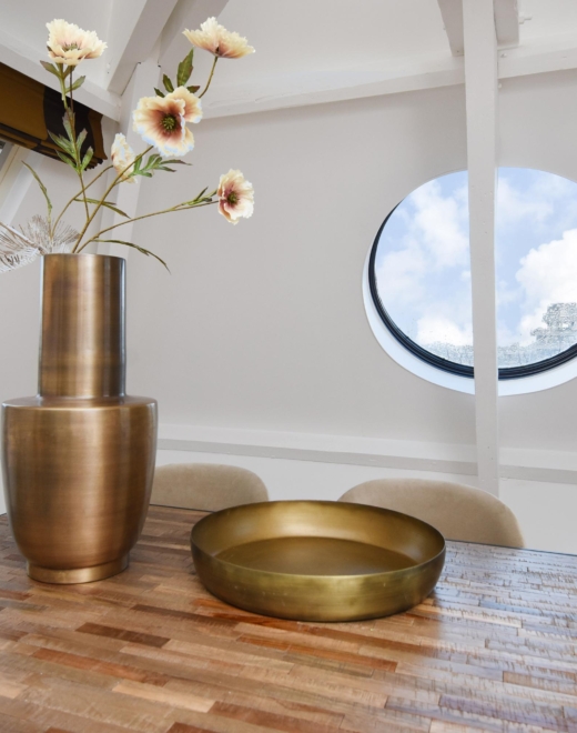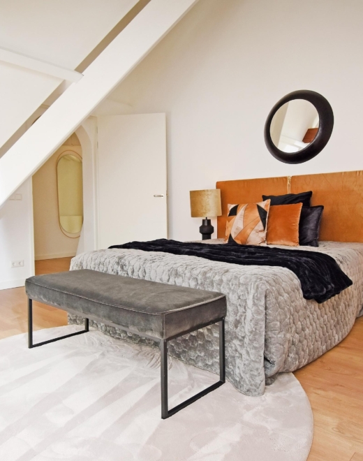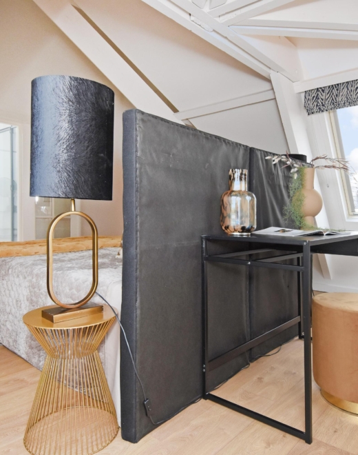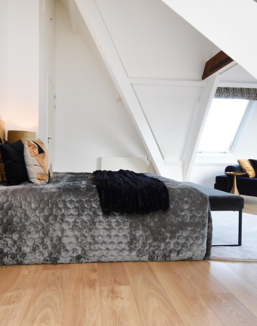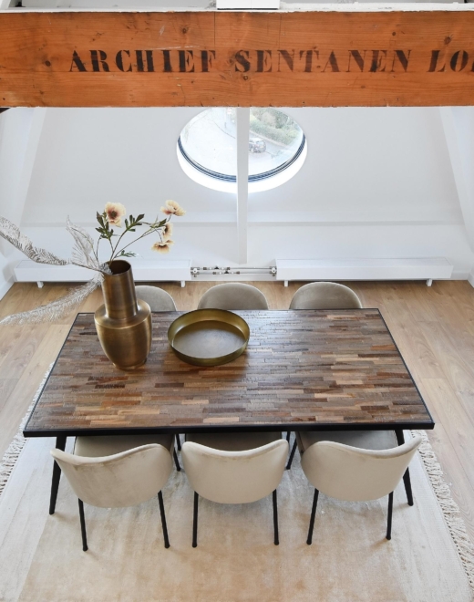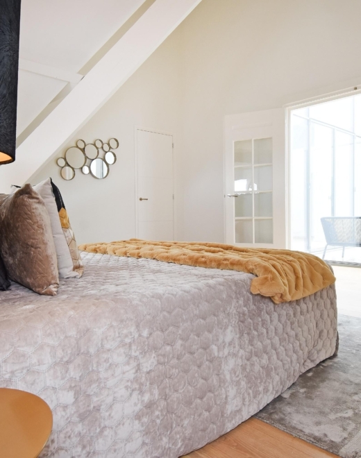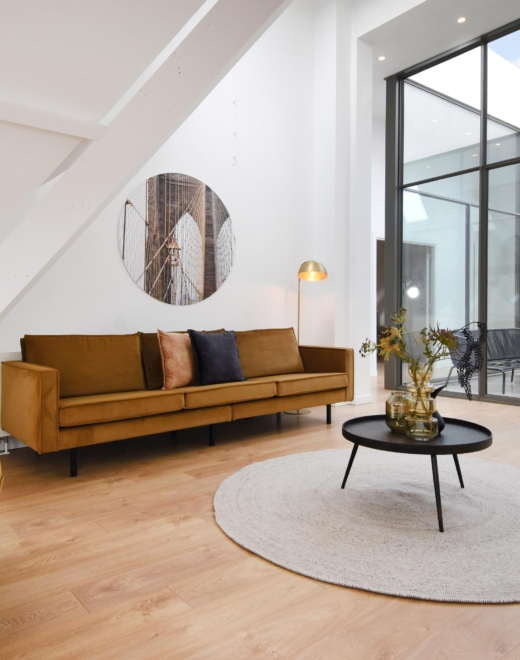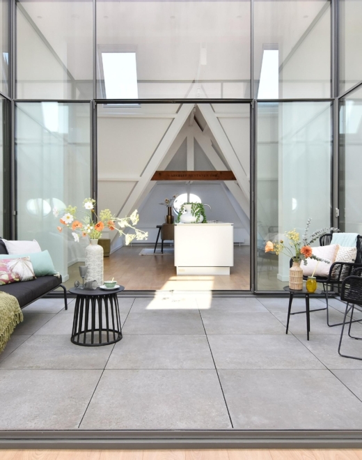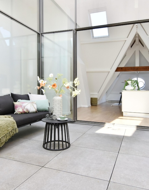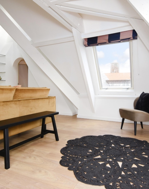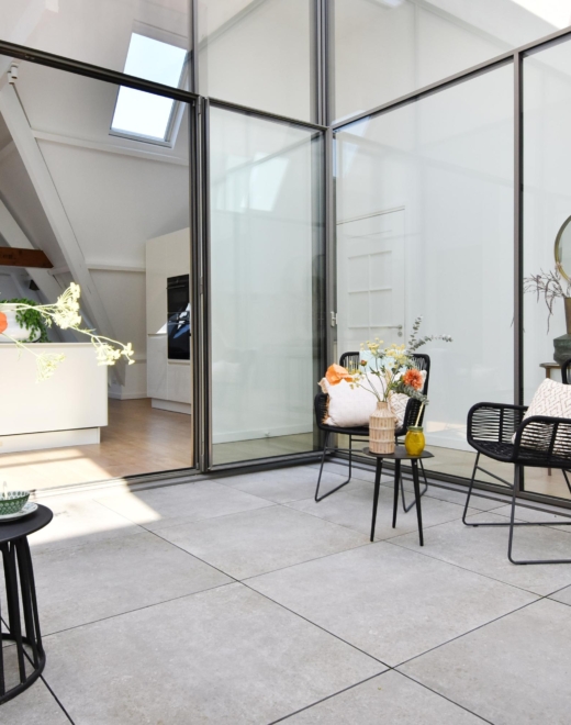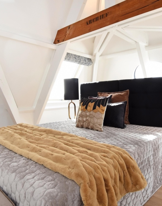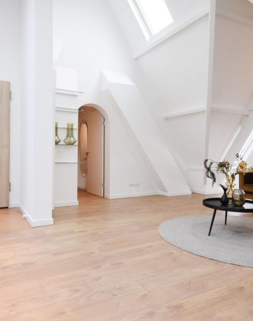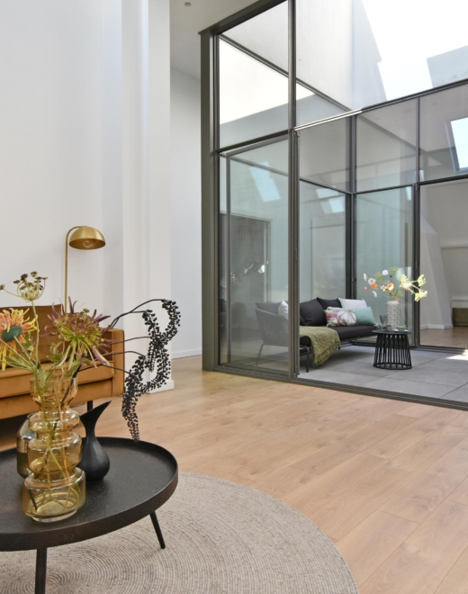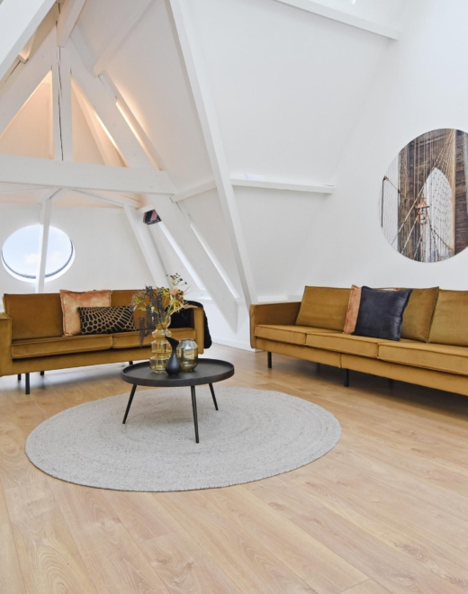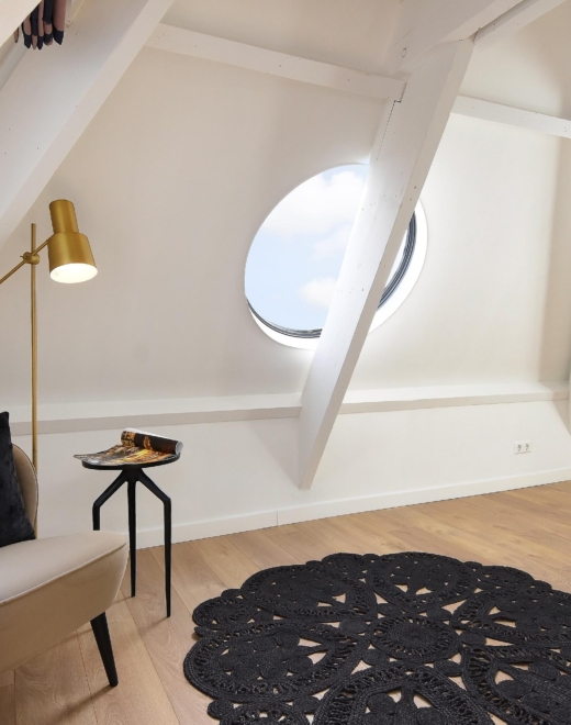 the high ceilings, original beams, and numerous (roof) windows create a unique bright space with panoramic views over the hague. the next125 high-gloss kitchen (28 m²) with a freestanding cooking island featuring a corian countertop is equipped with siemens built-in appliances, including a dishwasher, downdraft induction cooktop, quooker, multifunctional oven, and microwave.