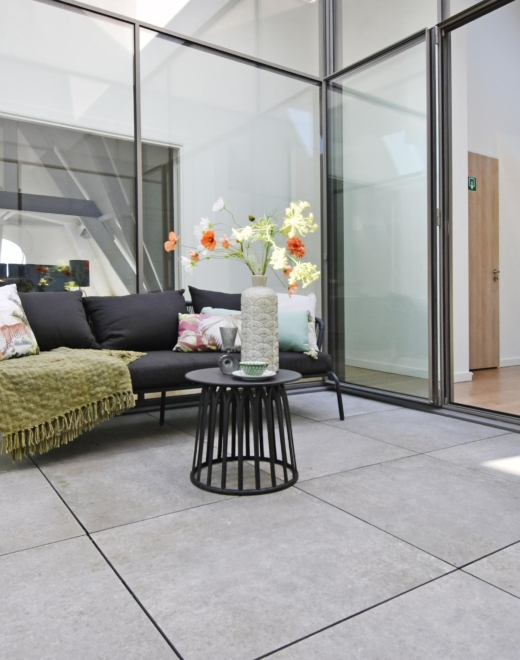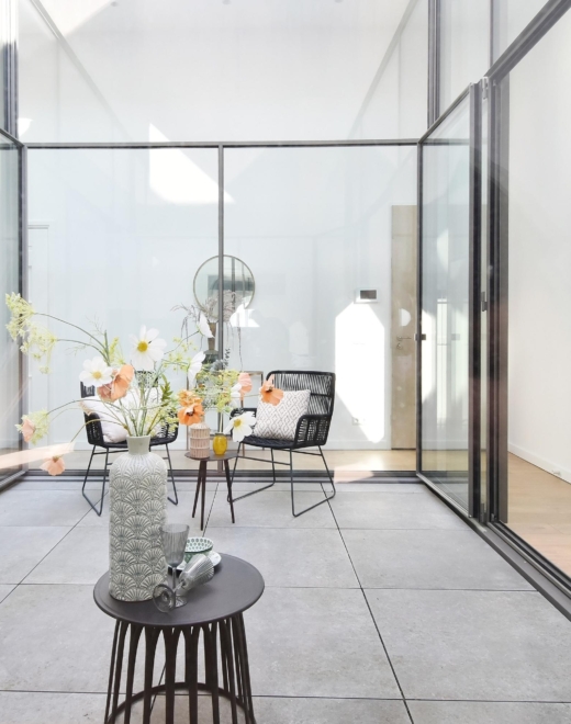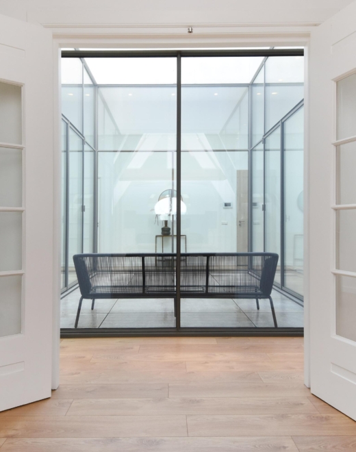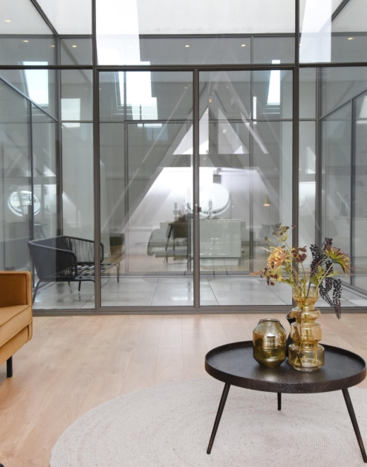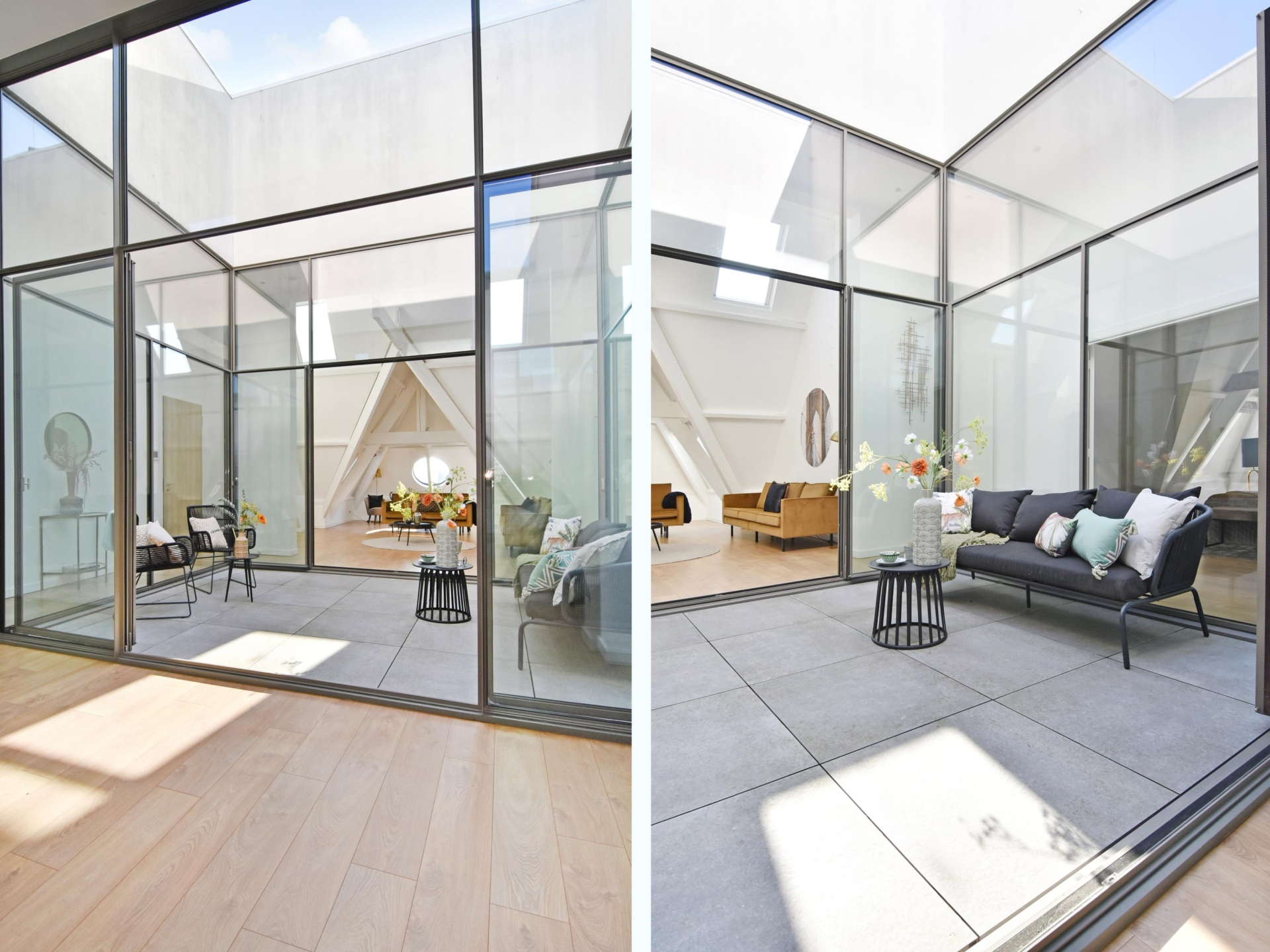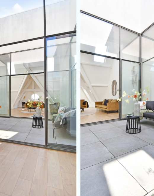 on the top floor (4th), you will find the entrance to this exceptional penthouse. the spacious, light-filled living room and kitchen area, totaling 105 m², consists of three interconnected spaces with a beautiful, generous patio (16 m²) with glass doors at its center. by day, it offers abundant natural light; by night, a spectacular view of the starry sky.