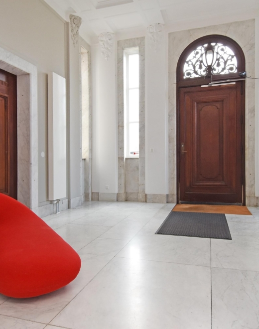 upon entering the stunning central hall with marble floors and walls, you step into the magnificent entrance hall featuring the authentic monumental wooden staircase. from here, take the elevator to the penthouse.