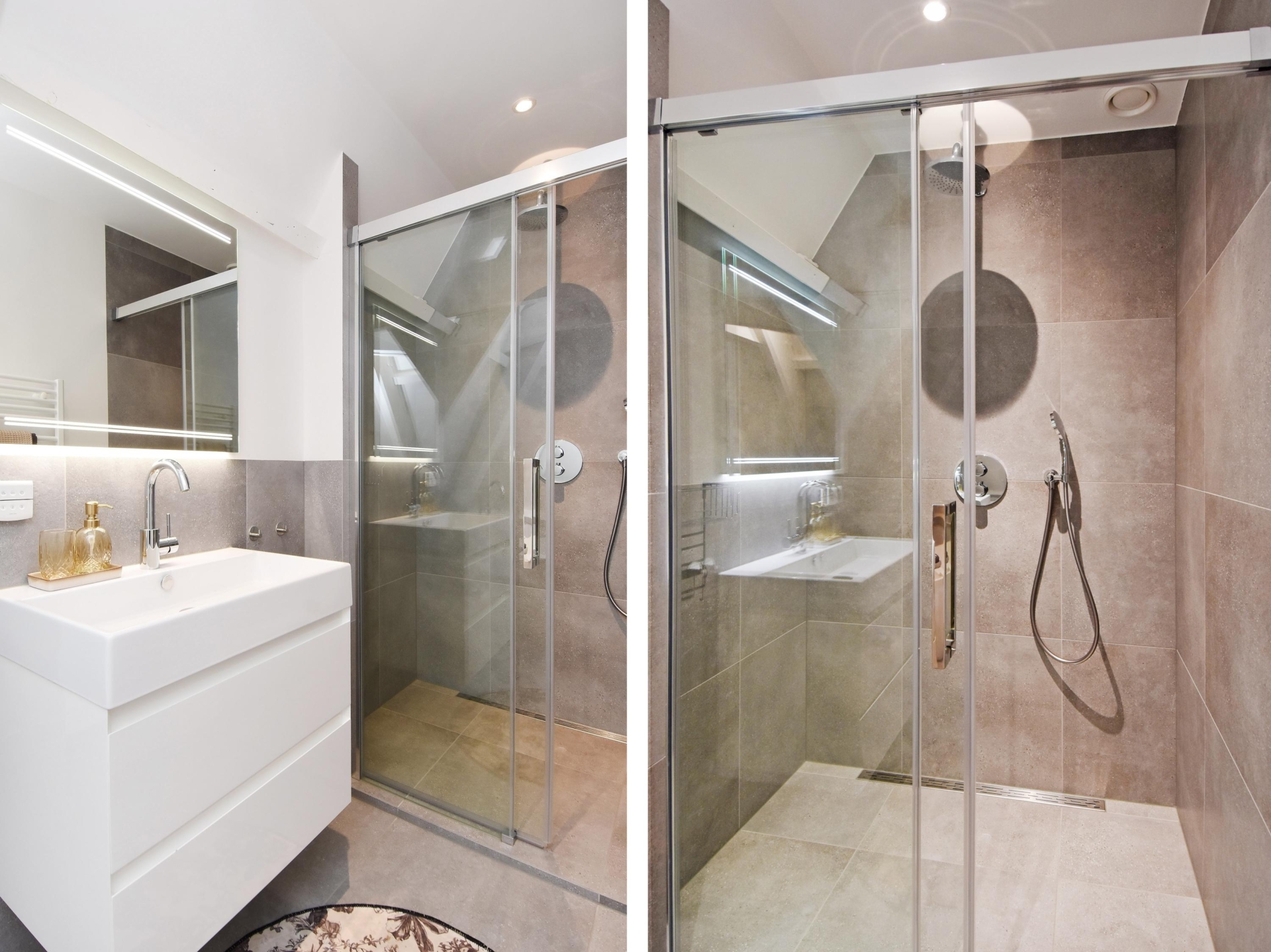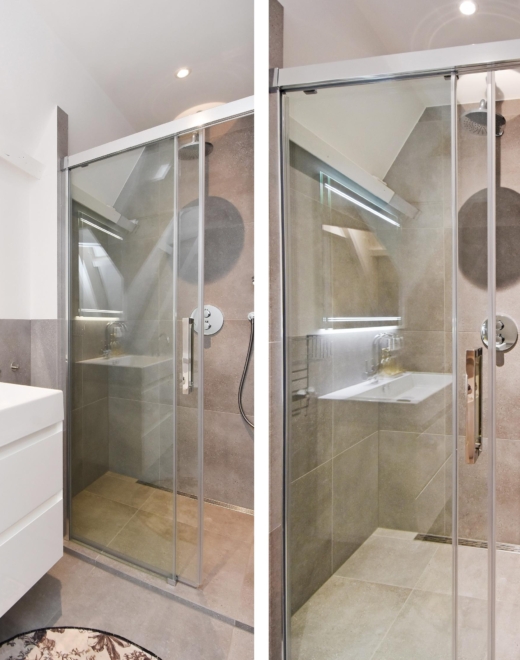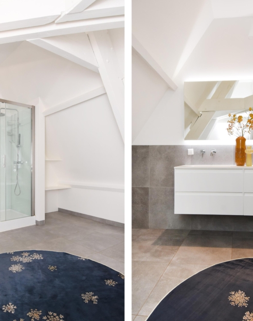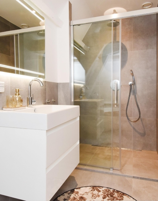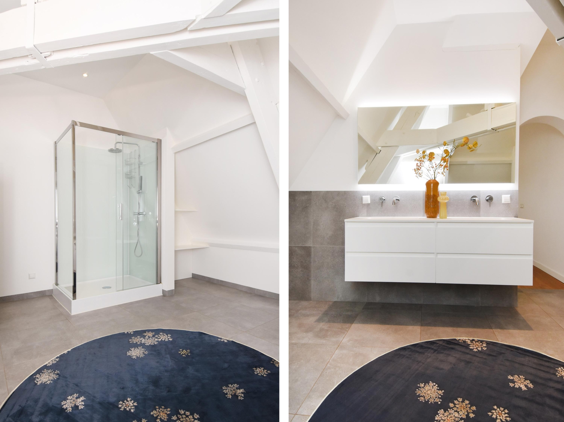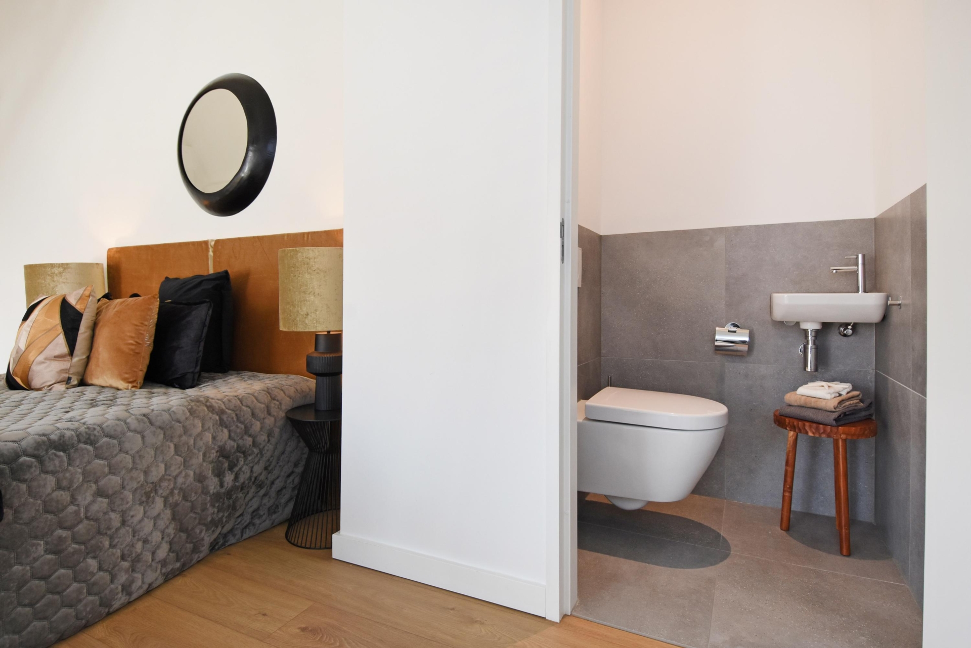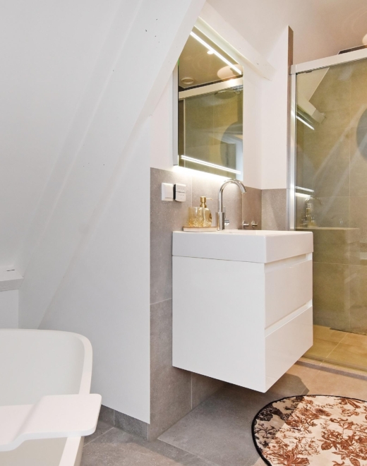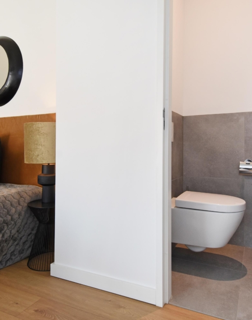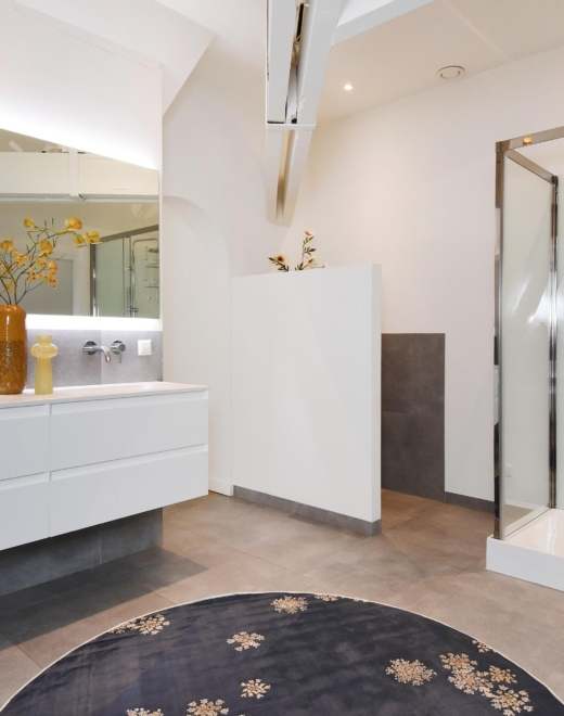 from the central space with the patio, you enter the spacious and sunny master bedroom (22 m²), complete with a luxurious private bathroom of no less than 14 m², featuring a rain shower, freestanding bathtub, double sink, and toilet. the second generous bedroom (17 m²) also includes a luxurious bathroom (7 m²) with a rain shower, freestanding bathtub, and sink.