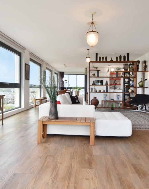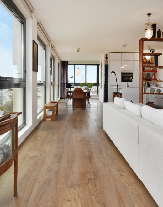the generous living space features windows on three sides, flooding the room with daylight. the continuous pvc flooring with underfloor heating and neutral finishes provide a modern yet warm atmosphere.