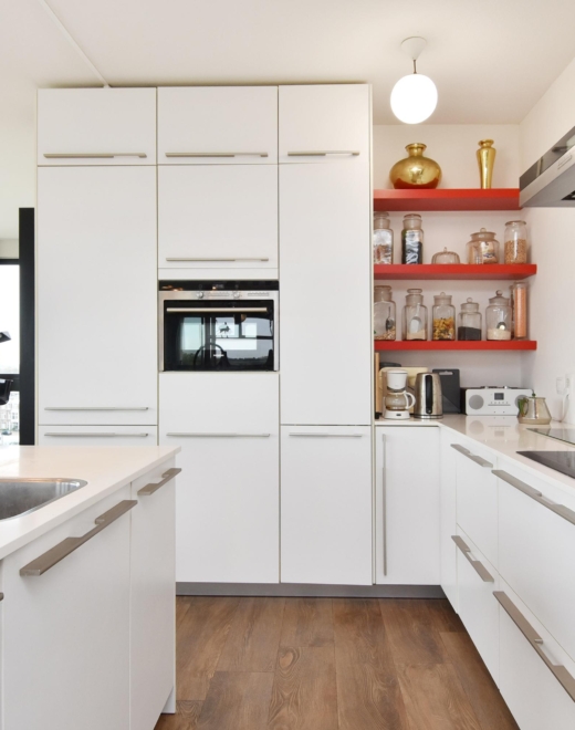 the luxury siematic kitchen with light composite worktop is centrally positioned in the living area and equipped with modern appliances: electric hob, fridge-freezer, combi oven/microwave, miele dishwasher, pull-out pantry, and corner cabinet.
