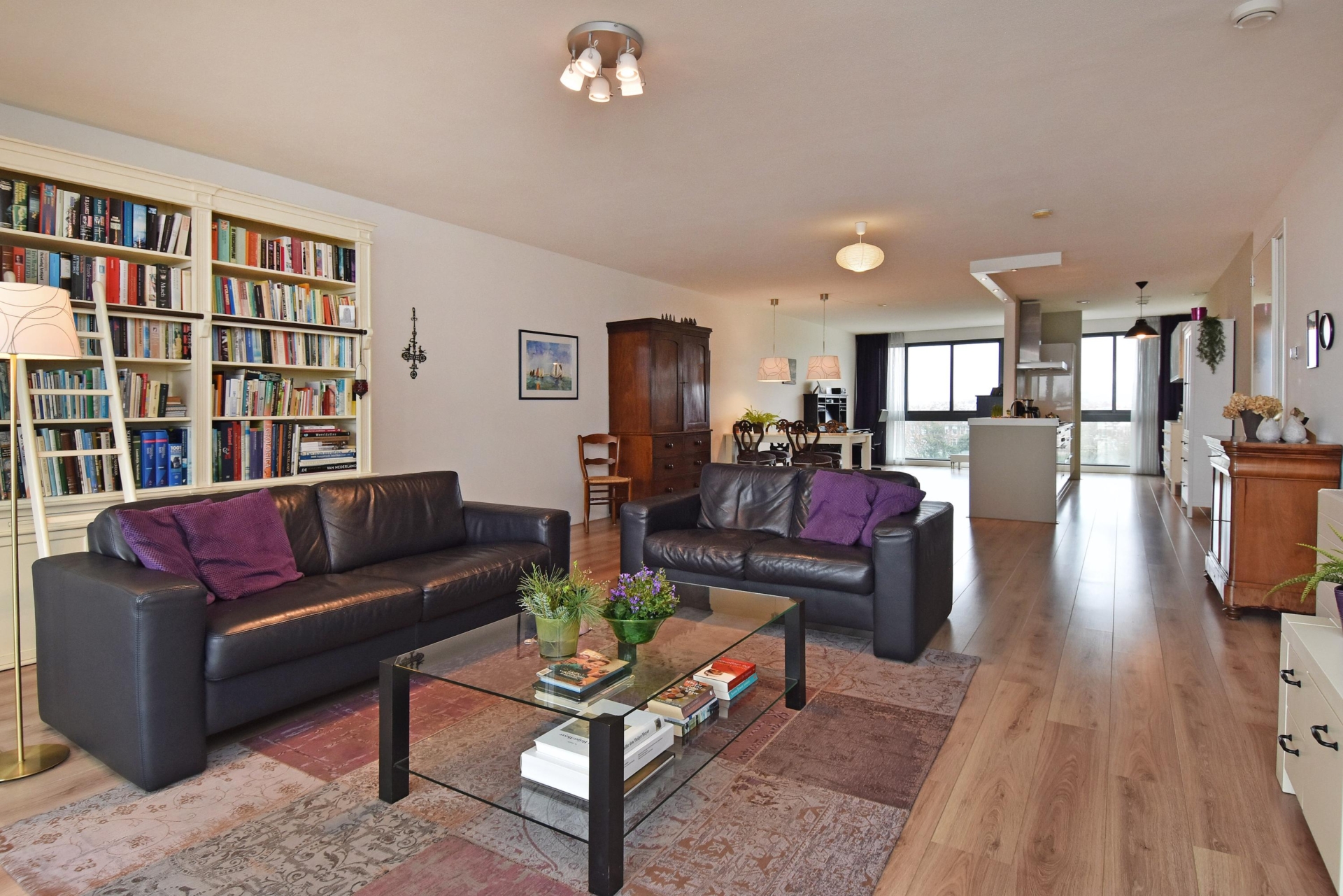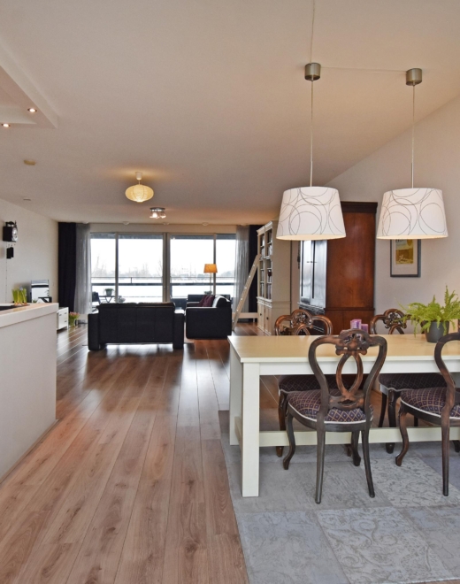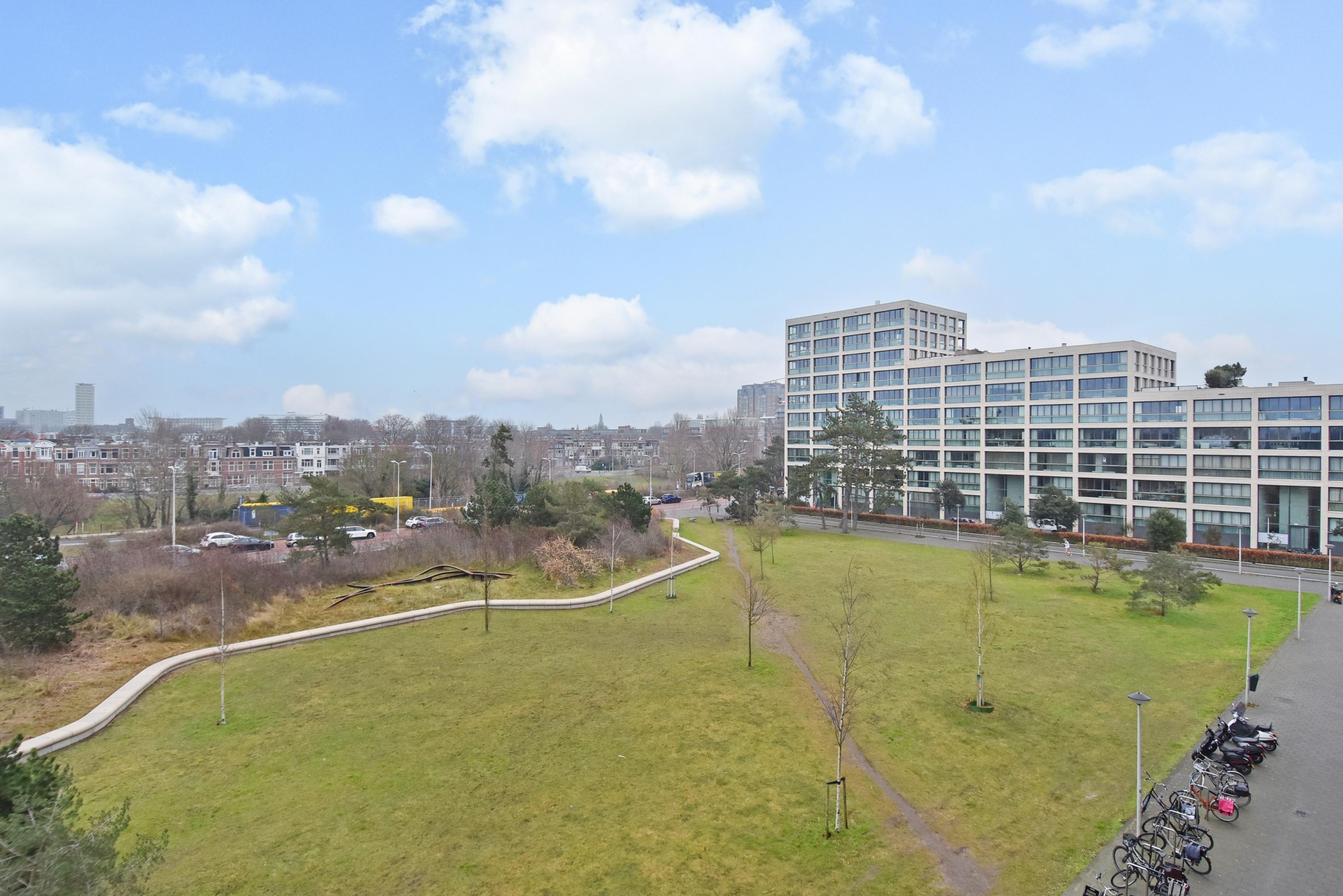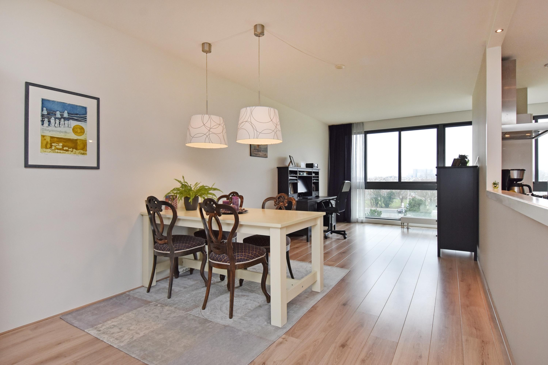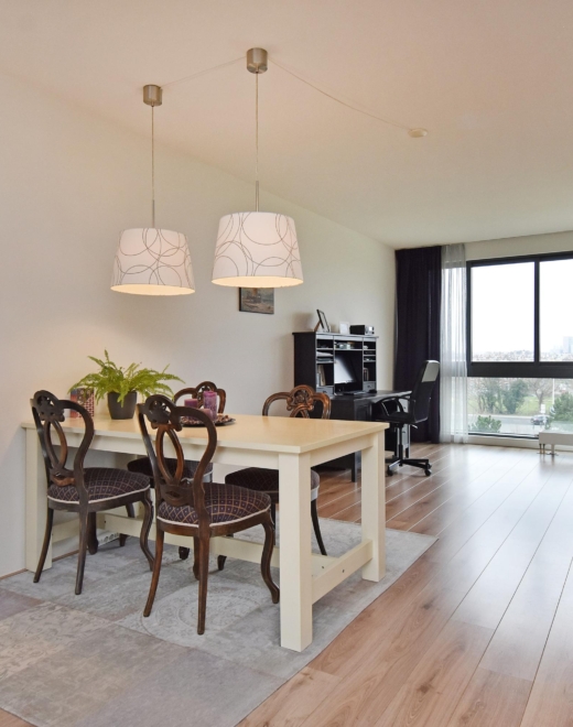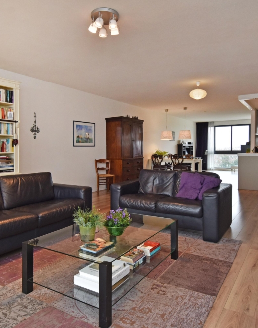 spacious and bright living/dining area offering unobstructed views over the statenkwartier, the peace palace, the the hague skyline, and the adjacent green park. the living room is divided into a seating area and a dining area. large windows allow abundant natural light throughout the day.