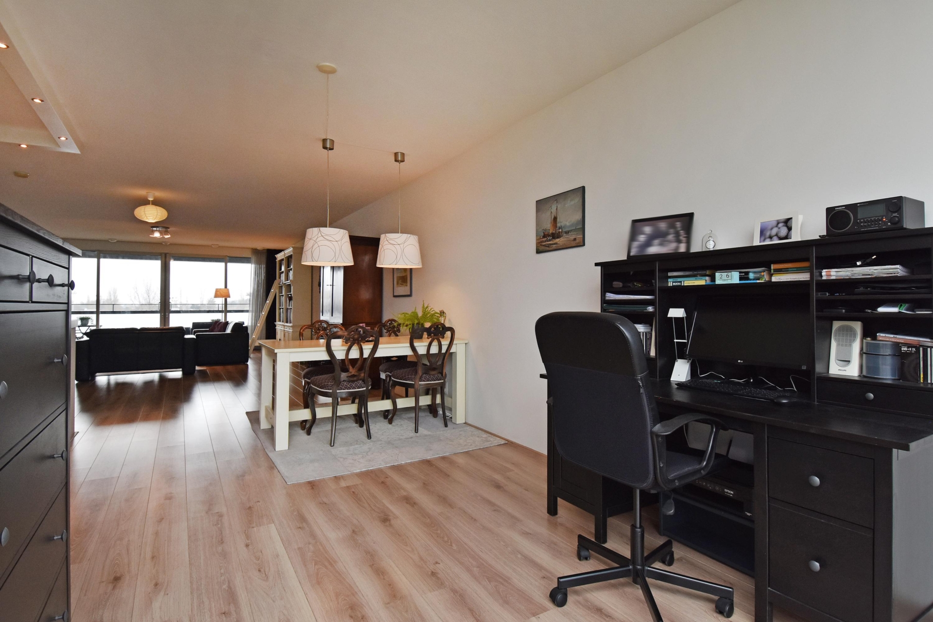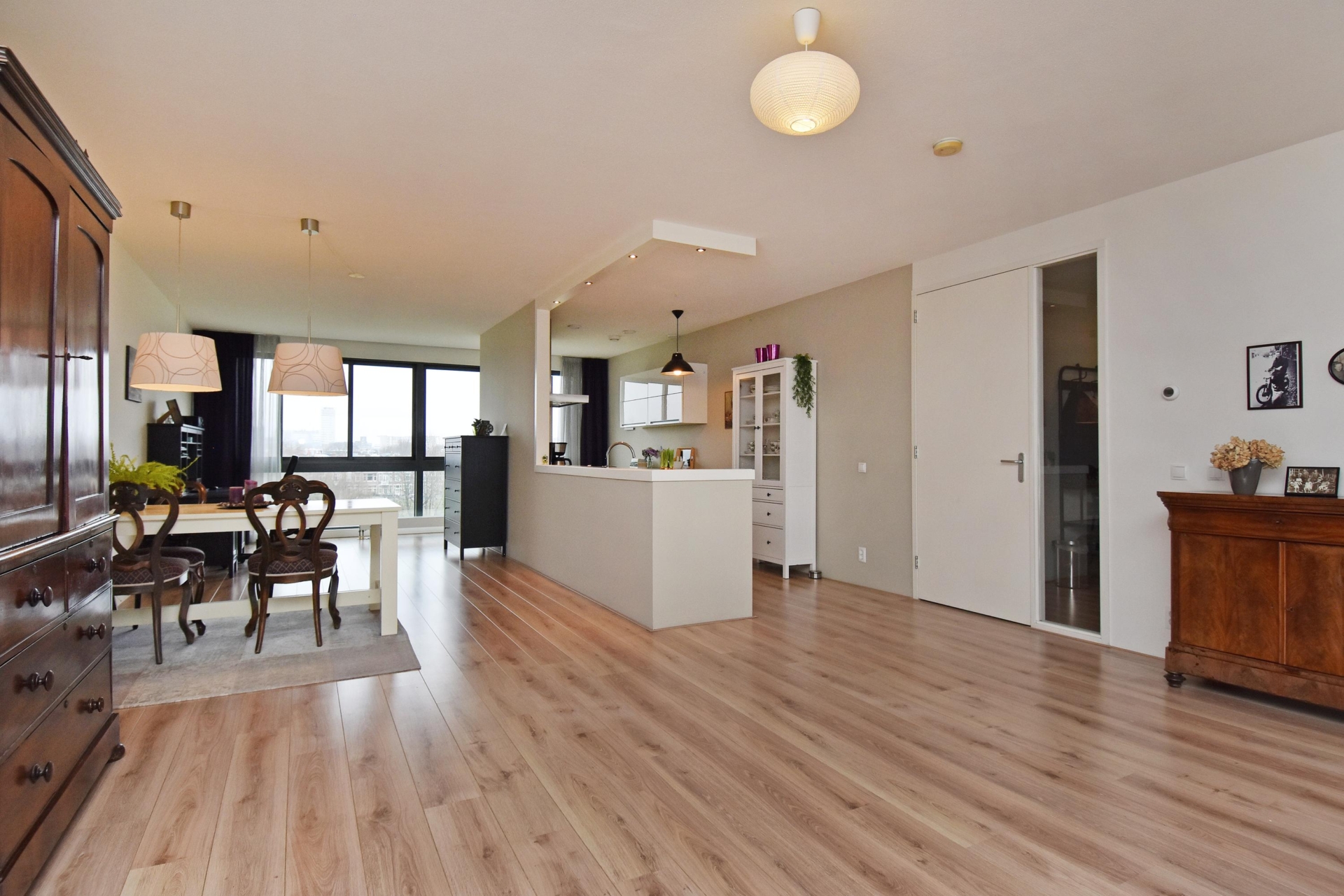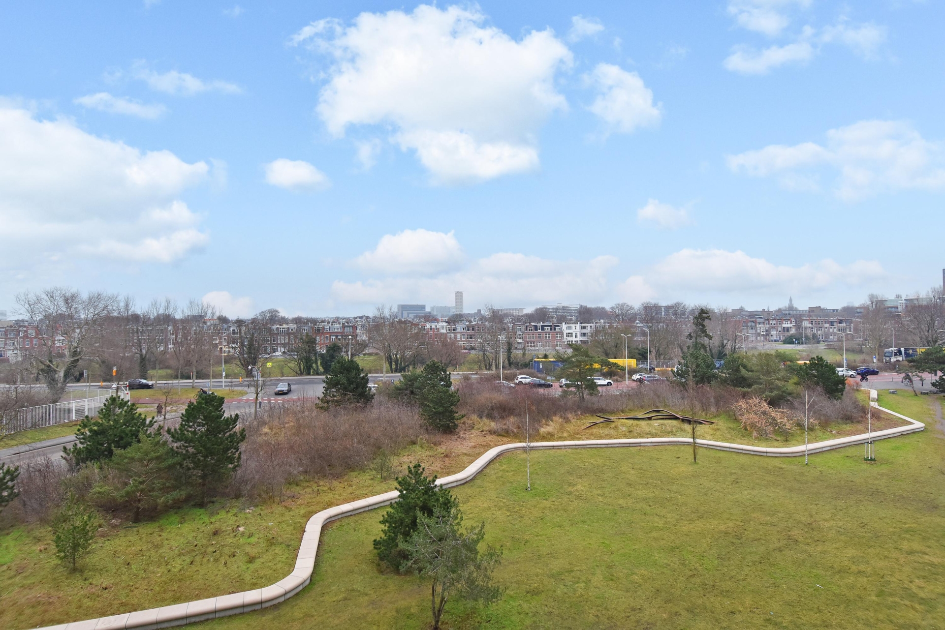 spacious and bright living/dining area offering unobstructed views over the statenkwartier, the peace palace, the the hague skyline, and the adjacent green park. the living room is divided into a seating area and a dining area. large windows allow abundant natural light throughout the day.