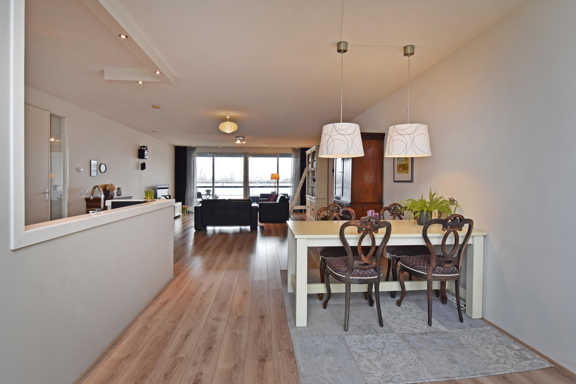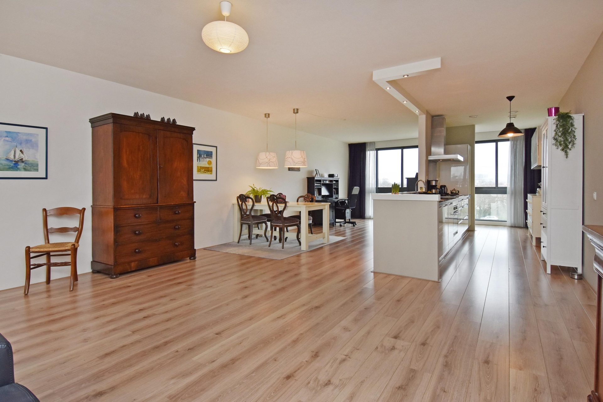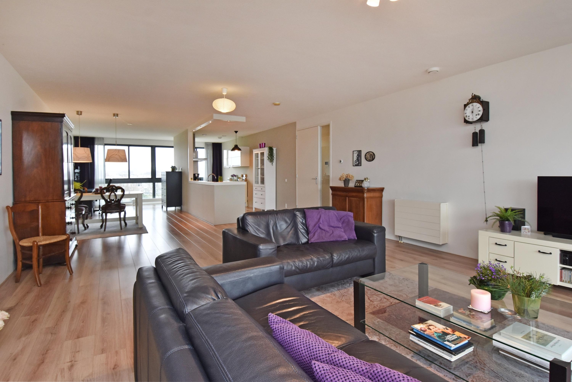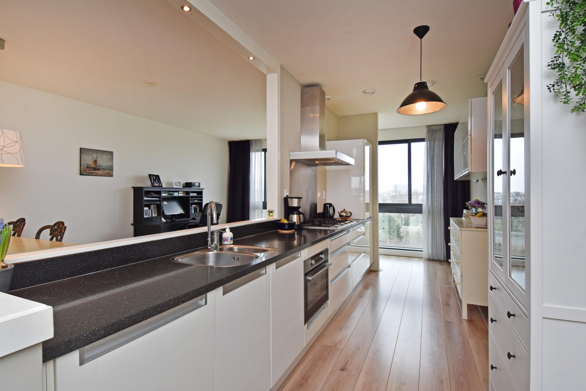 spacious and bright living/dining area offering unobstructed views over the statenkwartier, the peace palace, the the hague skyline, and the adjacent green park. the living room is divided into a seating area and a dining area. large windows allow abundant natural light throughout the day.