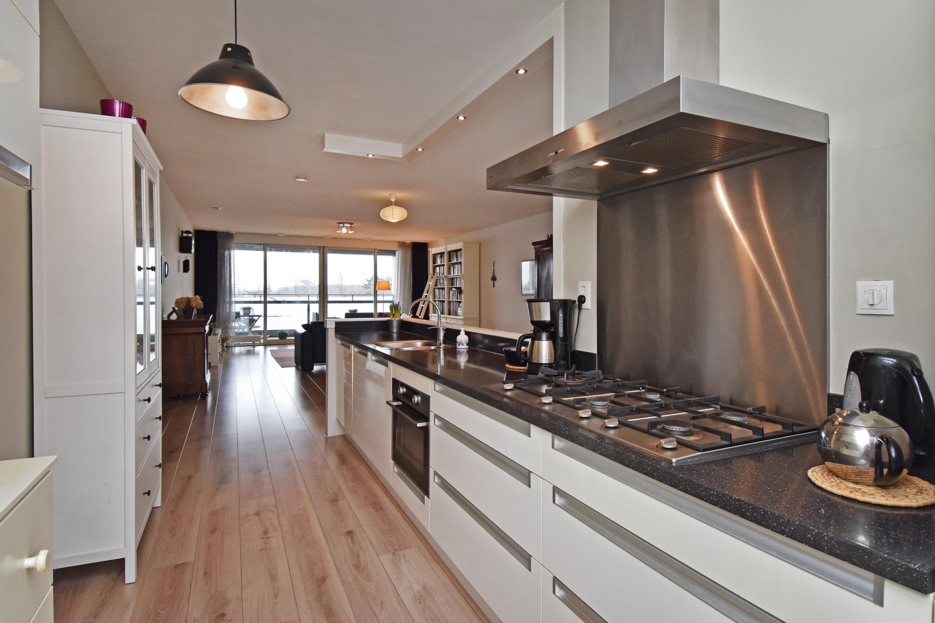 central in the living room is the kitchen, equipped with built-in appliances, including a dishwasher, combi microwave/oven (2019), refrigerator/freezer, and a five-burner hob.