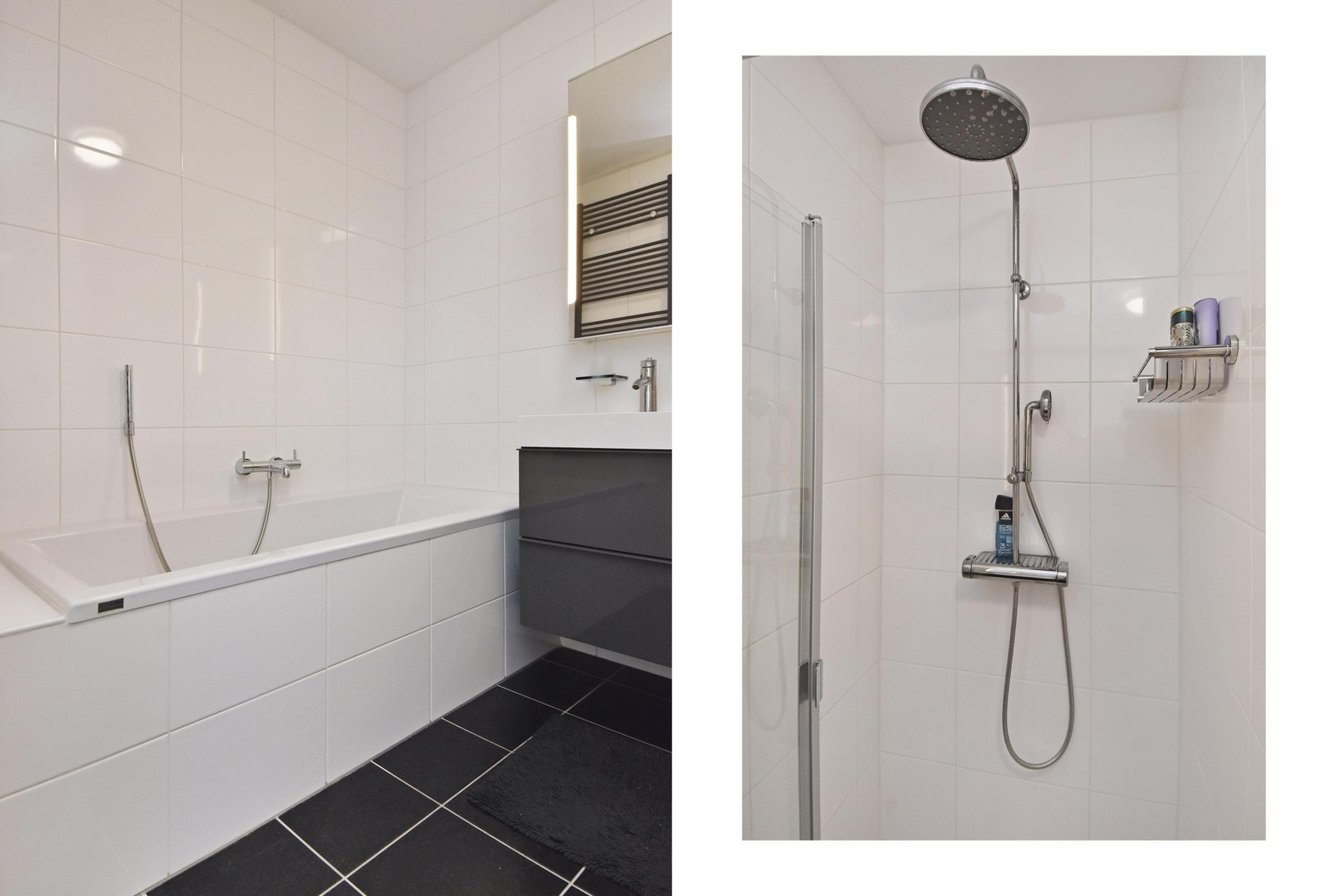 modern bathroom featuring a walk-in shower and bathtub, design radiator, double washbasin, and a wall-mounted toilet. finished with light, contemporary tiling.