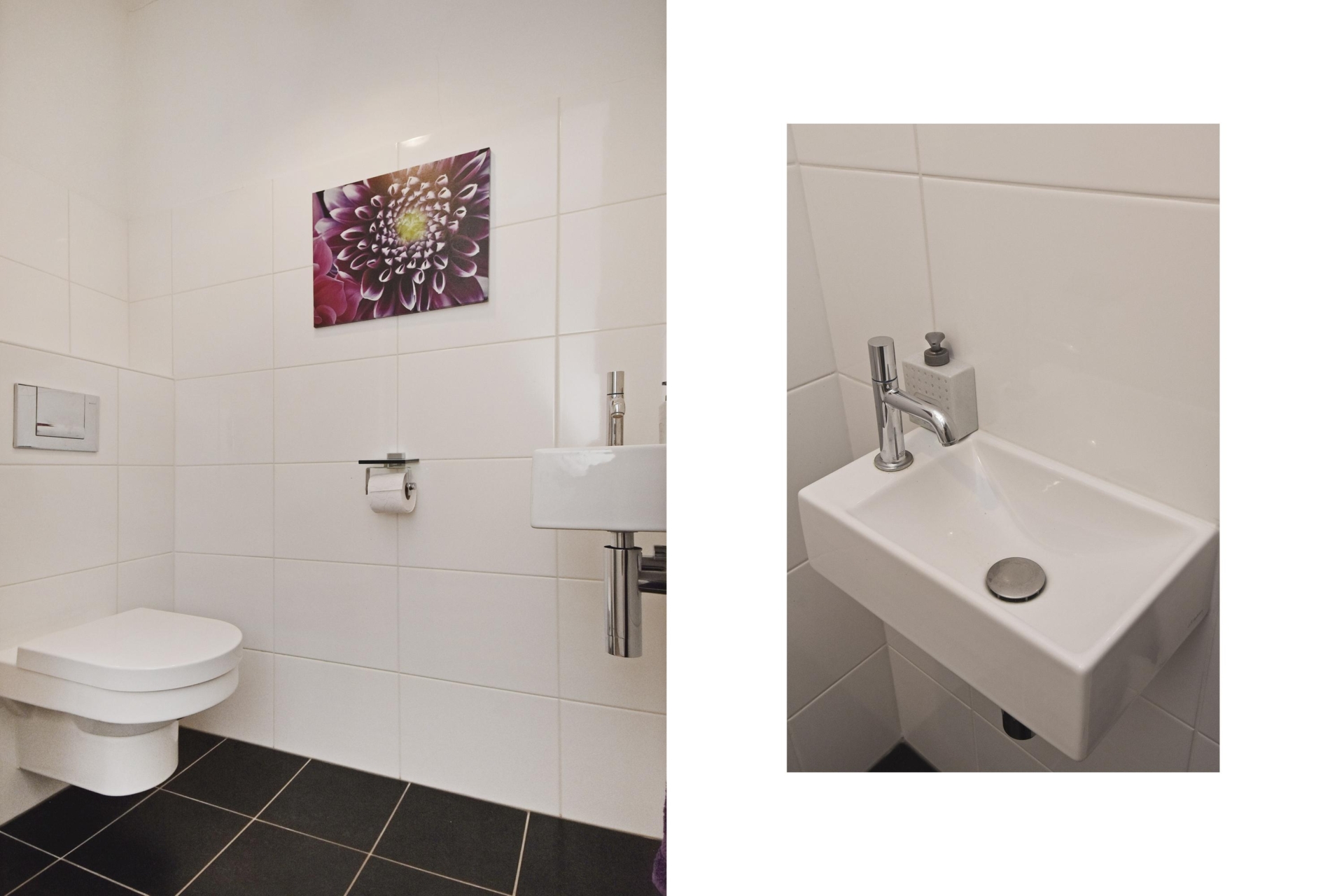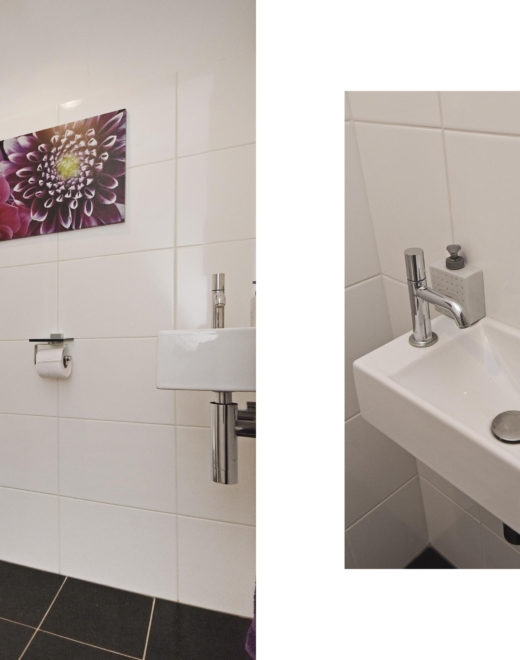 separate toilet in the hallway with a hand basin and wall-mounted toilet, designed in a modern white tile finish.