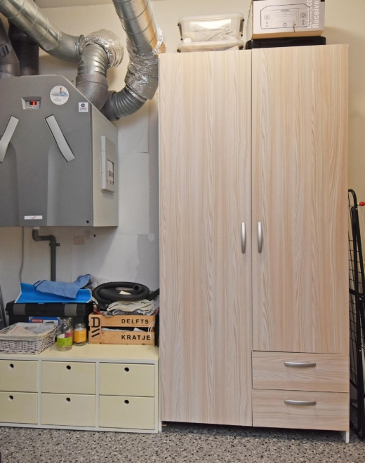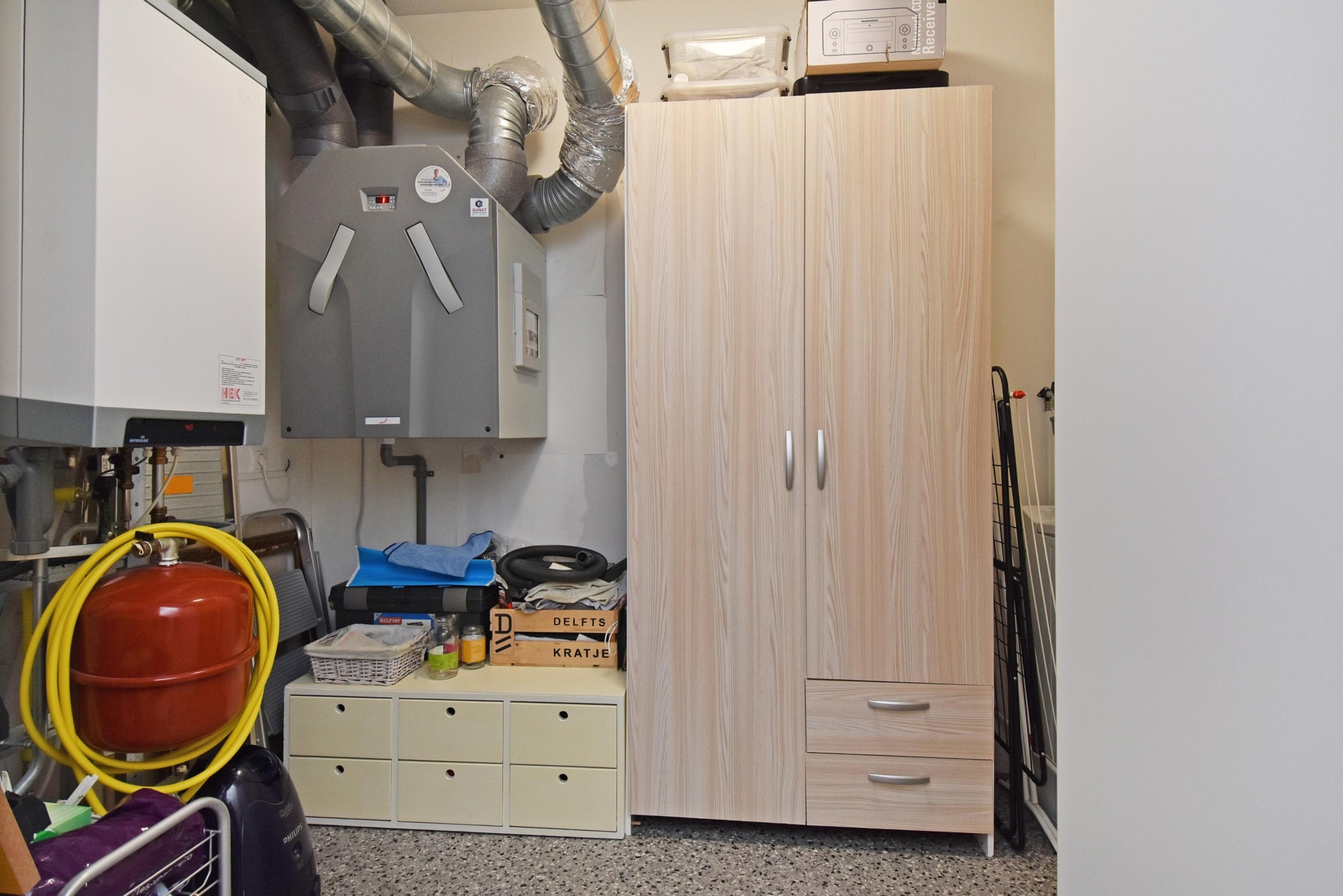 internal storage room with connections for a washer and dryer, also housing the central heating boiler and heat recovery unit.