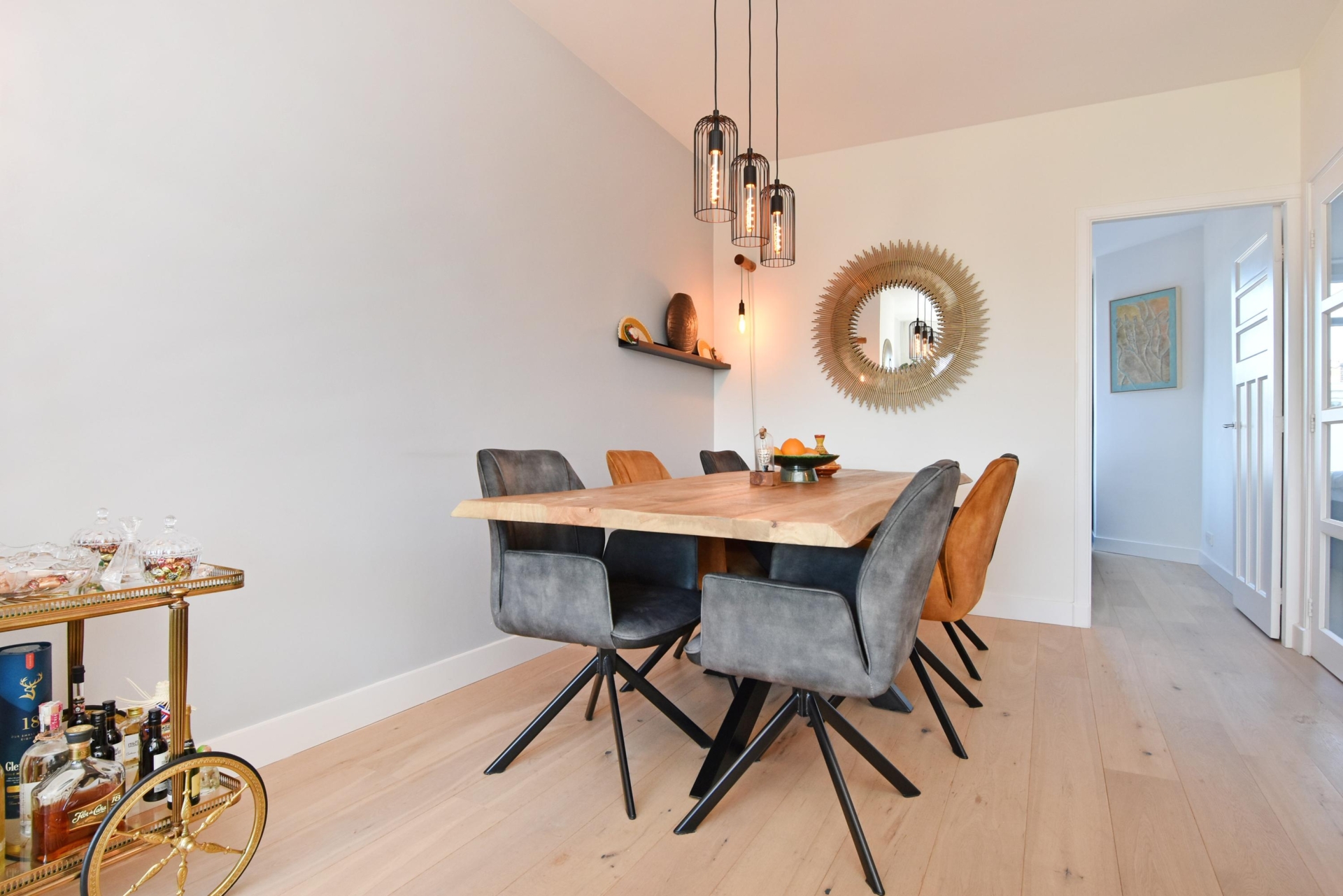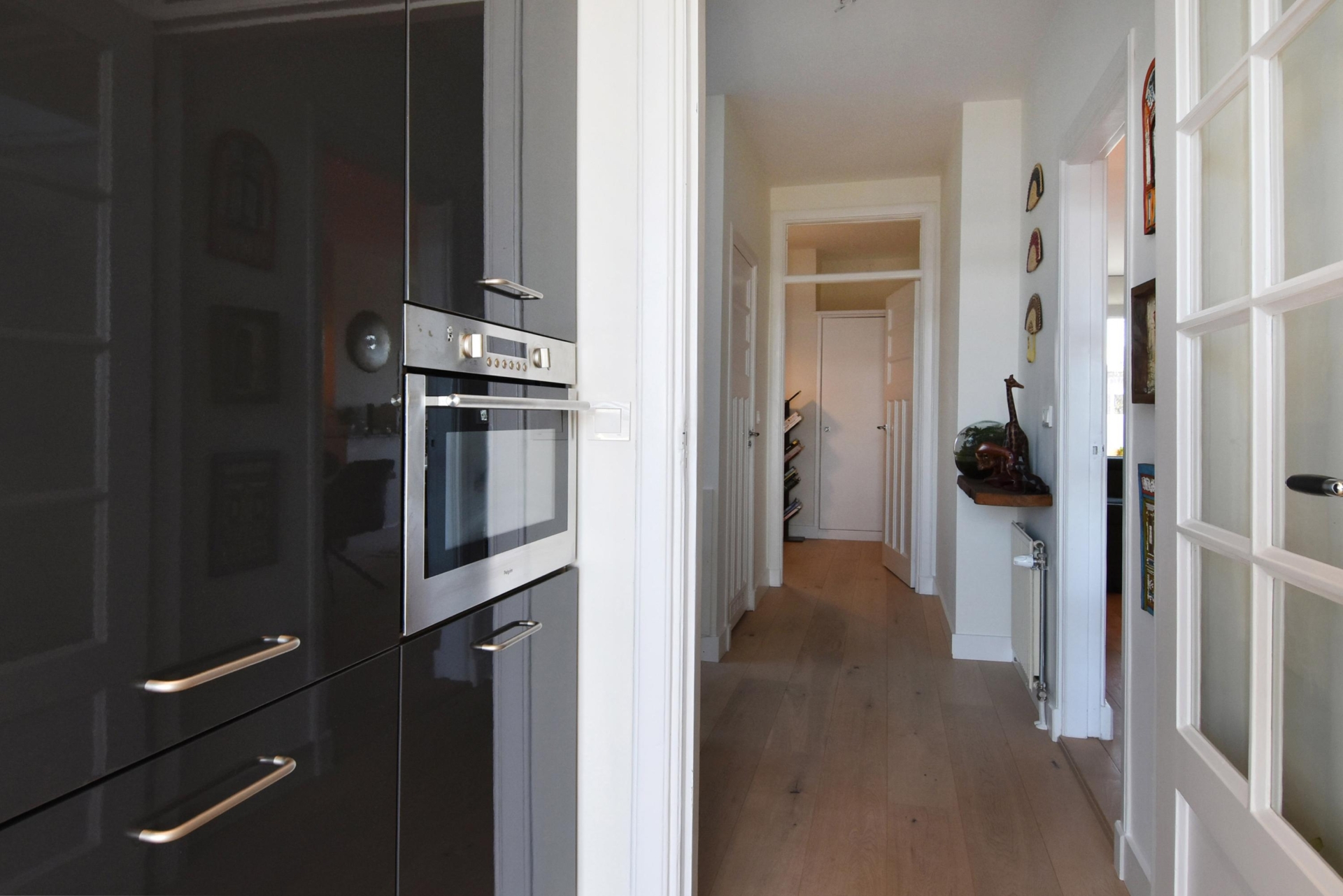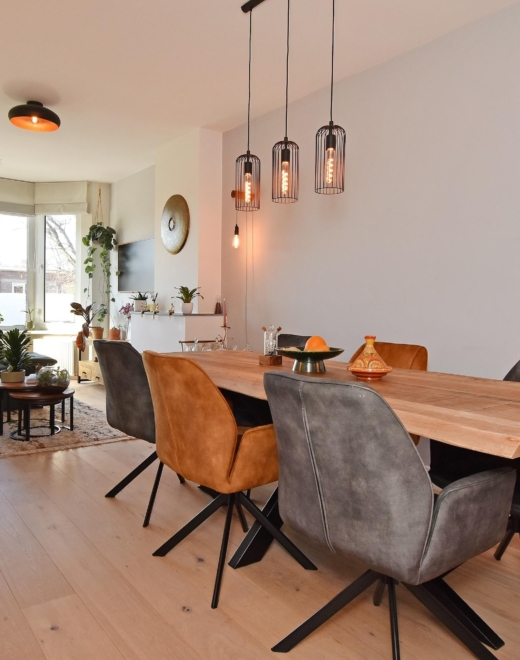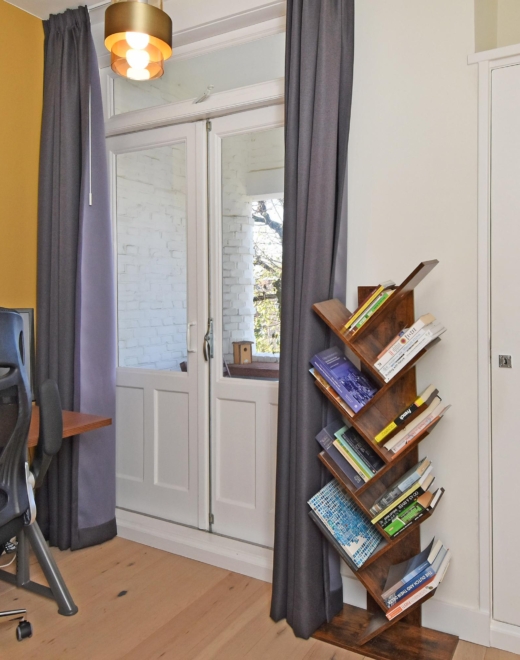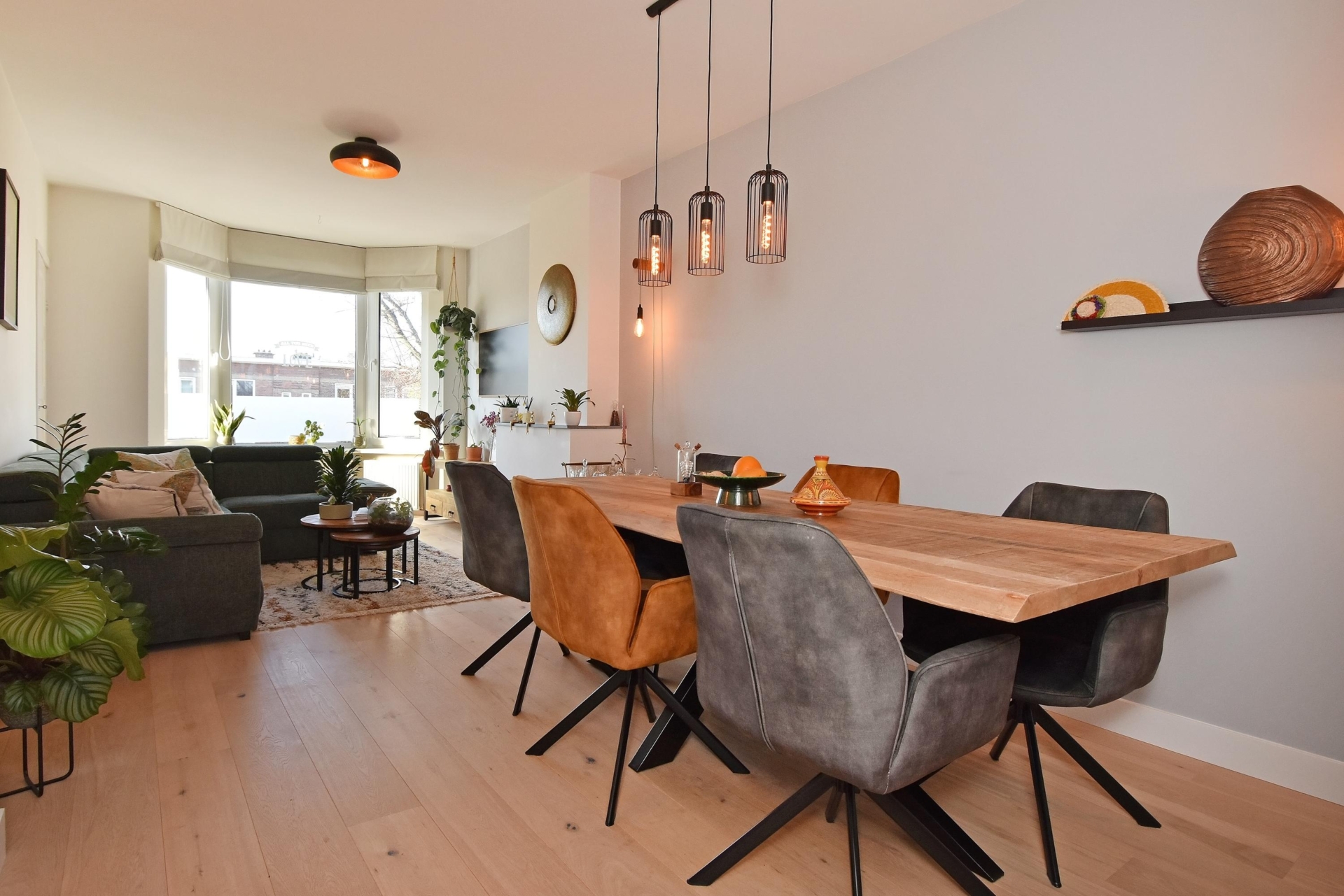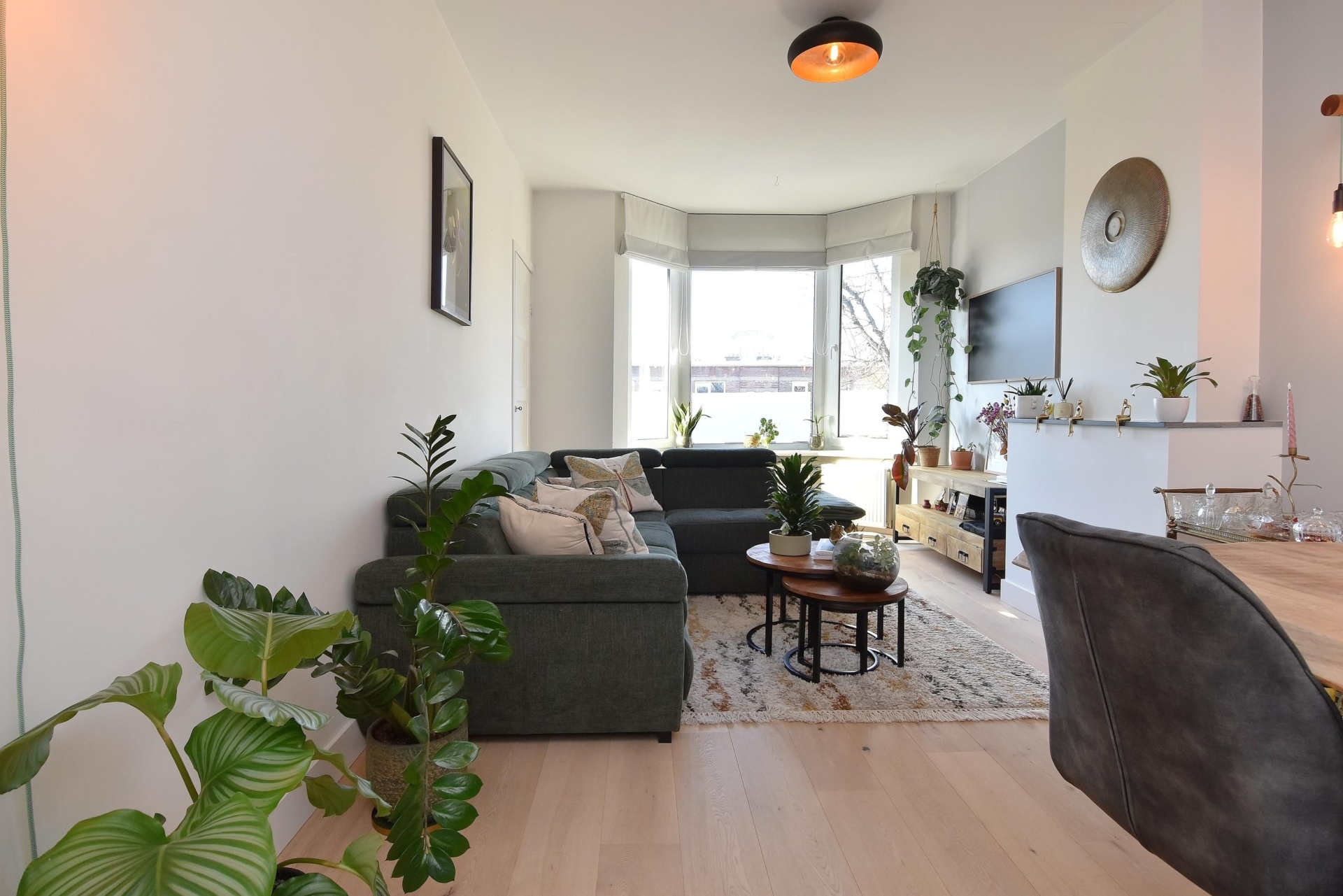 the living and dining room at the front exudes light and spaciousness. the bay window allows abundant natural light to flood the room, and from here you enjoy a pleasant view of the street. a built-in cupboard with integrated lighting adds atmosphere and additional storage.