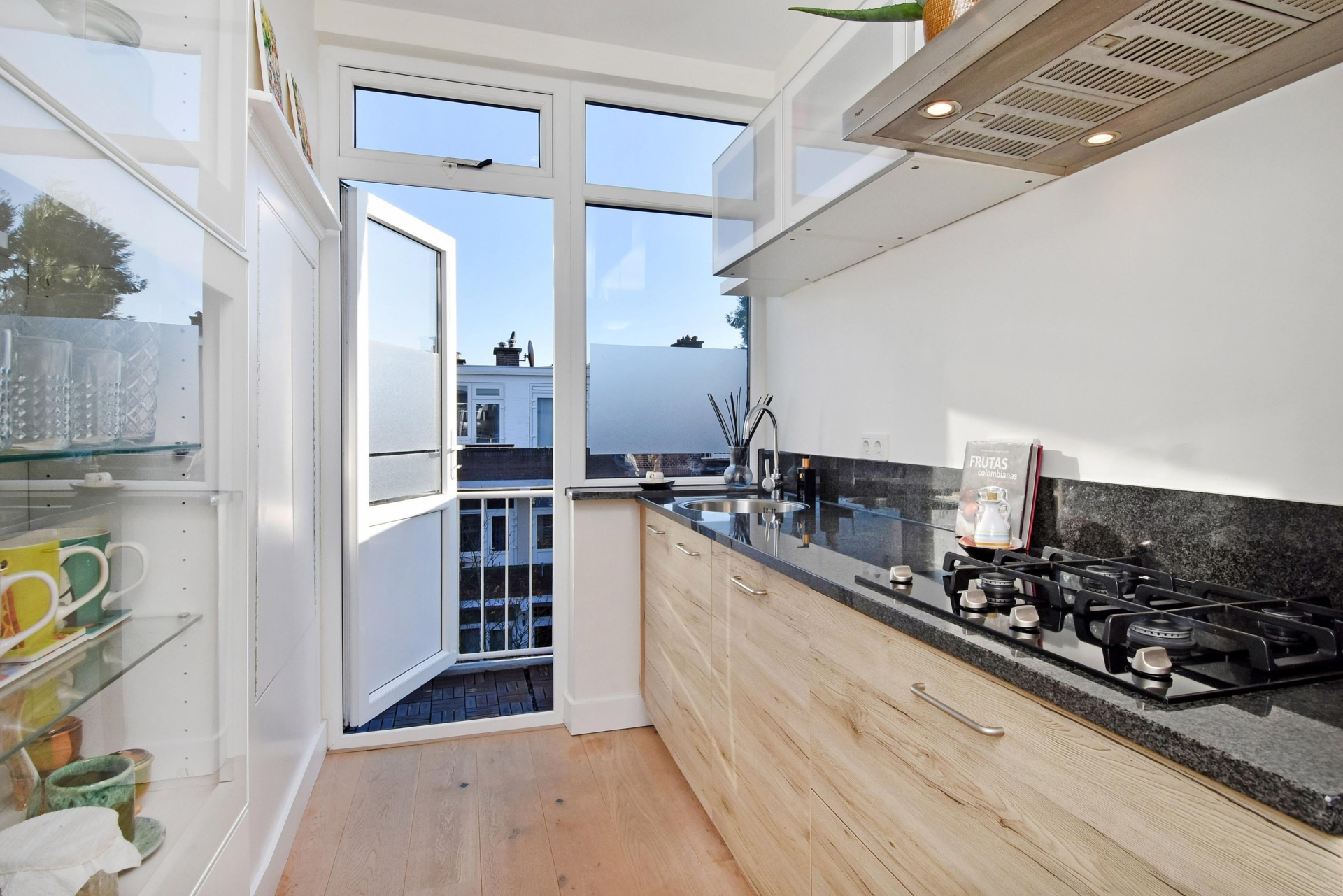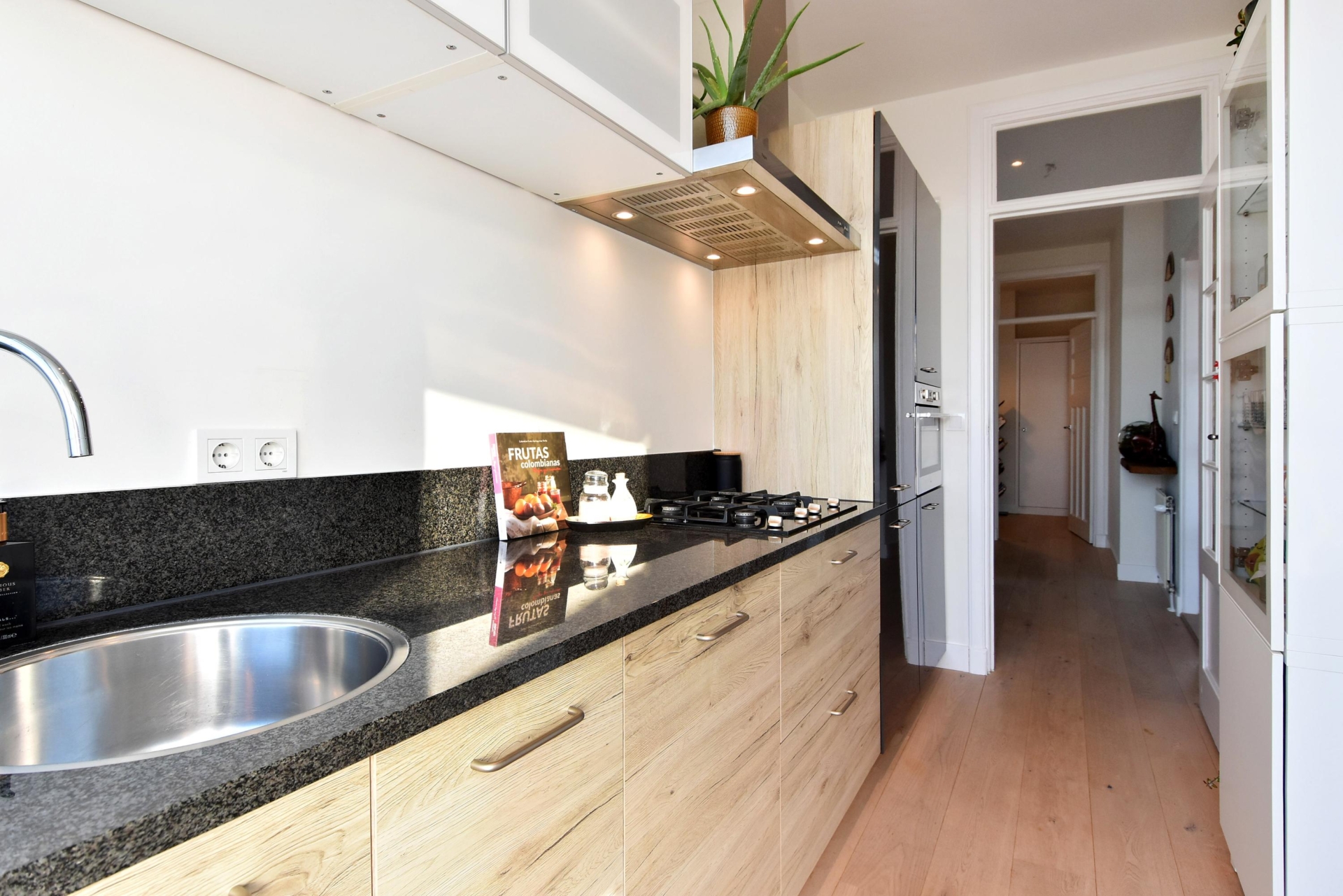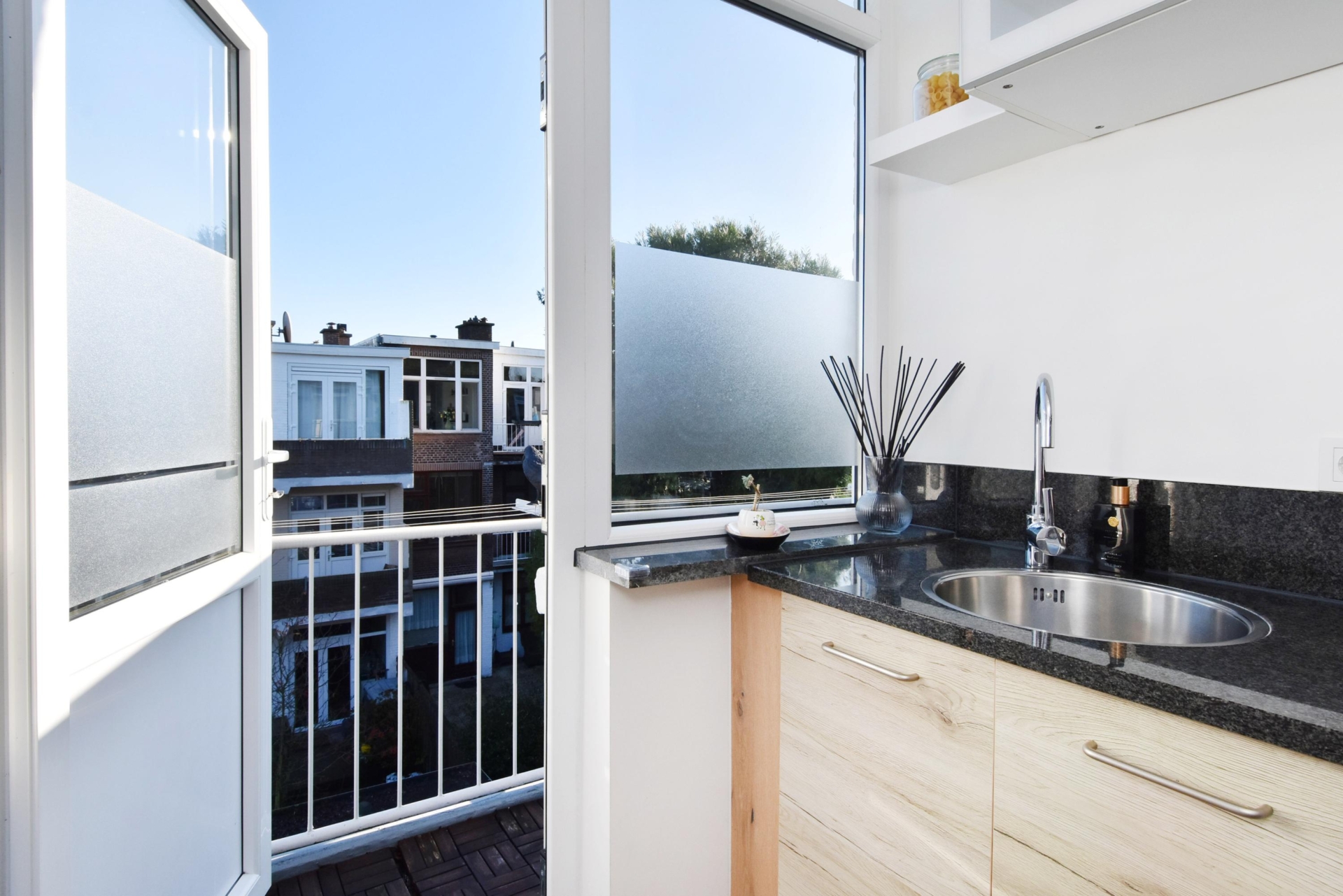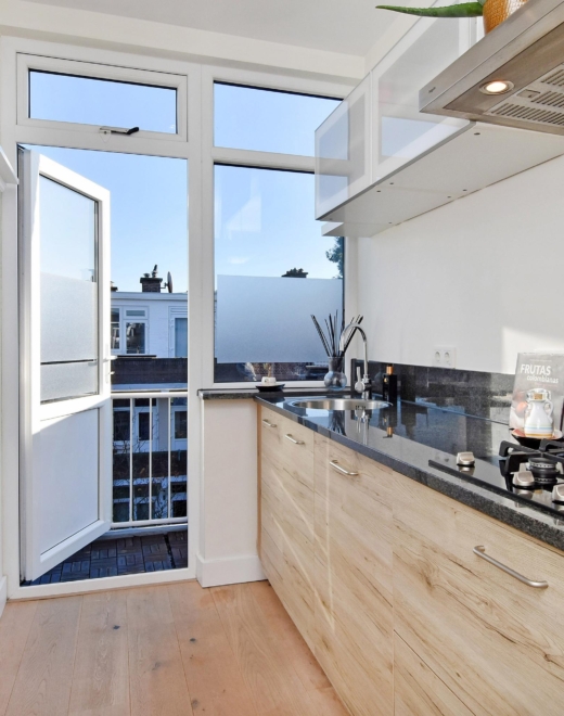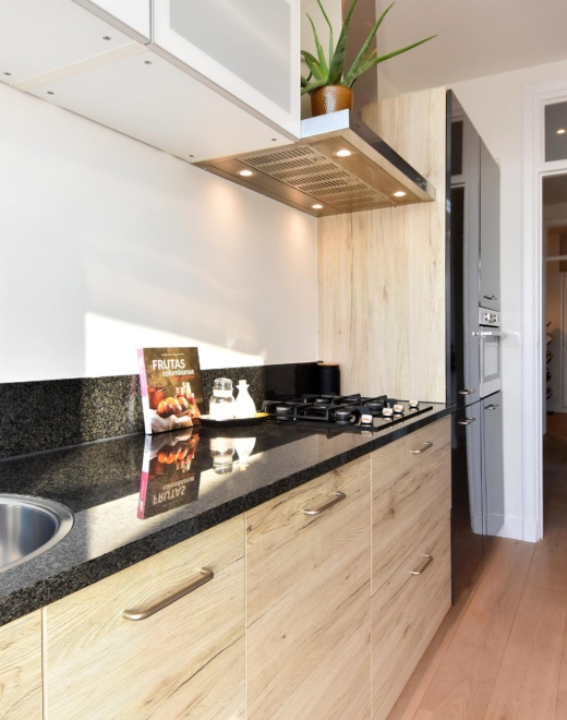 at the rear you’ll find the open kitchen, complete with a stylish granite countertop. it offers all modern conveniences, including a 4-burner gas hob, extractor, dishwasher, sink and refrigerator. from the kitchen, you step directly onto the rear balcony — the perfect spot to enjoy the morning sun and a quiet moment outdoors.